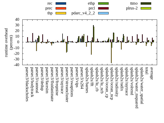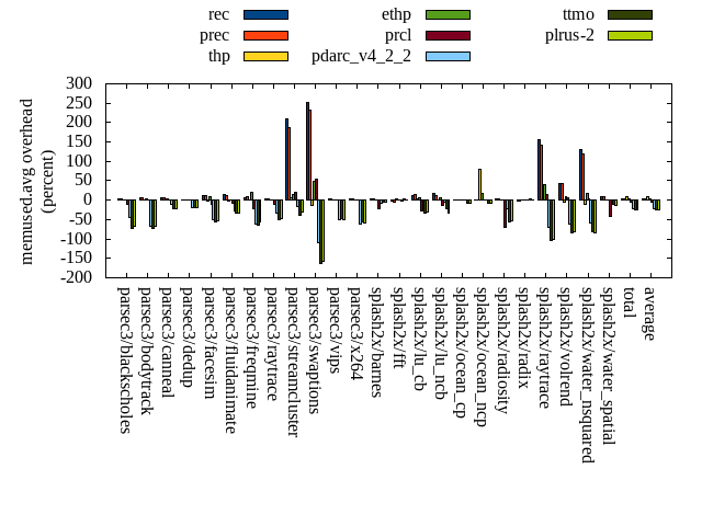 ======= Summary ======= runtime orig rec (overhead) prec (overhead) thp (overhead) ethp (overhead) prcl (overhead) pdarc_v4_2_2 (overhead) ttmo (overhead) plrus-2 (overhead) parsec3/blackscholes 139.620 140.148 (0.38) 139.795 (0.13) 139.614 (-0.00) 139.961 (0.24) 151.968 (8.84) 140.271 (0.47) 140.677 (0.76) 140.999 (0.99) parsec3/bodytrack 124.455 125.611 (0.93) 124.668 (0.17) 124.075 (-0.30) 125.304 (0.68) 144.209 (15.87) 125.753 (1.04) 124.476 (0.02) 126.493 (1.64) parsec3/canneal 211.886 221.167 (4.38) 217.652 (2.72) 179.638 (-15.22) 208.810 (-1.45) 226.459 (6.88) 227.148 (7.20) 236.003 (11.38) 233.229 (10.07) parsec3/dedup 18.569 18.560 (-0.05) 18.467 (-0.55) 18.317 (-1.36) 18.824 (1.38) 21.133 (13.81) 18.601 (0.18) 18.493 (-0.41) 18.456 (-0.61) parsec3/facesim 348.949 348.698 (-0.07) 343.973 (-1.43) 344.082 (-1.39) 344.047 (-1.40) 366.254 (4.96) 351.104 (0.62) 348.493 (-0.13) 354.797 (1.68) parsec3/fluidanimate 342.161 339.292 (-0.84) 335.436 (-1.97) 324.157 (-5.26) 336.861 (-1.55) 343.763 (0.47) 336.734 (-1.59) 337.140 (-1.47) 341.387 (-0.23) parsec3/freqmine 436.472 436.264 (-0.05) 437.849 (0.32) 437.687 (0.28) 437.162 (0.16) 447.209 (2.46) 439.396 (0.67) 438.896 (0.56) 437.882 (0.32) parsec3/raytrace 180.969 183.255 (1.26) 183.969 (1.66) 185.112 (2.29) 183.999 (1.67) 208.481 (15.20) 187.880 (3.82) 187.163 (3.42) 191.150 (5.63) parsec3/streamcluster 695.281 700.535 (0.76) 683.854 (-1.64) 572.527 (-17.66) 581.782 (-16.32) 769.897 (10.73) 674.406 (-3.00) 706.833 (1.66) 708.969 (1.97) parsec3/swaptions 221.713 224.850 (1.41) 222.377 (0.30) 223.952 (1.01) 221.934 (0.10) 226.281 (2.06) 221.365 (-0.16) 222.500 (0.35) 222.068 (0.16) parsec3/vips 88.596 88.391 (-0.23) 88.515 (-0.09) 87.595 (-1.13) 88.018 (-0.65) 91.349 (3.11) 94.223 (6.35) 97.578 (10.14) 98.182 (10.82) parsec3/x264 110.399 117.765 (6.67) 117.238 (6.19) 111.526 (1.02) 121.063 (9.66) 123.052 (11.46) 119.056 (7.84) 121.889 (10.41) 126.022 (14.15) splash2x/barnes 130.981 130.342 (-0.49) 131.350 (0.28) 121.156 (-7.50) 129.876 (-0.84) 146.307 (11.70) 133.738 (2.11) 133.785 (2.14) 132.982 (1.53) splash2x/fft 60.631 61.498 (1.43) 61.306 (1.11) 47.596 (-21.50) 62.577 (3.21) 65.821 (8.56) 62.129 (2.47) 78.951 (30.22) 77.109 (27.18) splash2x/lu_cb 132.125 133.169 (0.79) 133.477 (1.02) 132.493 (0.28) 133.410 (0.97) 139.953 (5.93) 133.651 (1.16) 134.591 (1.87) 134.387 (1.71) splash2x/lu_ncb 151.078 152.569 (0.99) 151.982 (0.60) 151.101 (0.02) 152.177 (0.73) 154.435 (2.22) 152.729 (1.09) 153.822 (1.82) 155.009 (2.60) splash2x/ocean_cp 79.087 80.950 (2.36) 80.142 (1.33) 79.512 (0.54) 79.868 (0.99) 81.106 (2.55) 82.117 (3.83) 83.476 (5.55) 85.389 (7.97) splash2x/ocean_ncp 160.023 167.280 (4.54) 167.250 (4.52) 102.062 (-36.22) 145.236 (-9.24) 167.448 (4.64) 167.582 (4.72) 187.329 (17.06) 186.483 (16.54) splash2x/radiosity 143.314 143.527 (0.15) 142.911 (-0.28) 142.681 (-0.44) 143.067 (-0.17) 156.289 (9.05) 145.095 (1.24) 148.435 (3.57) 148.685 (3.75) splash2x/radix 50.616 51.476 (1.70) 51.701 (2.14) 44.399 (-12.28) 50.962 (0.68) 52.098 (2.93) 54.340 (7.36) 57.749 (14.09) 56.190 (11.01) splash2x/raytrace 134.942 133.870 (-0.79) 134.254 (-0.51) 133.627 (-0.97) 134.895 (-0.04) 147.975 (9.66) 134.255 (-0.51) 138.099 (2.34) 140.029 (3.77) splash2x/volrend 120.369 120.948 (0.48) 120.752 (0.32) 119.777 (-0.49) 120.462 (0.08) 133.328 (10.77) 120.866 (0.41) 121.432 (0.88) 121.243 (0.73) splash2x/water_nsquared 370.888 373.554 (0.72) 369.834 (-0.28) 354.645 (-4.38) 362.543 (-2.25) 422.564 (13.93) 373.789 (0.78) 393.479 (6.09) 391.193 (5.47) splash2x/water_spatial 134.714 133.846 (-0.64) 133.970 (-0.55) 133.596 (-0.83) 135.428 (0.53) 153.446 (13.91) 136.335 (1.20) 134.541 (-0.13) 136.963 (1.67) total 4587.830 4627.570 (0.87) 4592.710 (0.11) 4310.930 (-6.04) 4458.270 (-2.82) 4940.830 (7.69) 4632.560 (0.97) 4745.830 (3.44) 4765.280 (3.87) average 191.160 192.815 (1.07) 191.363 (0.65) 179.622 (-5.06) 185.761 (-0.54) 205.868 (7.99) 193.023 (2.05) 197.743 (5.09) 198.553 (5.44) kdamond_cpu_util orig rec (overhead) prec (overhead) thp (overhead) ethp (overhead) prcl (overhead) pdarc_v4_2_2 (overhead) ttmo (overhead) plrus-2 (overhead) parsec3/blackscholes 0.000 0.000 (0.00) 0.828 (0.83) 0.000 (0.00) 1.580 (1.58) 10.269 (10.27) 3.347 (3.35) 0.000 (0.00) 2.398 (2.40) parsec3/bodytrack 0.000 1.748 (1.75) 0.681 (0.68) 0.000 (0.00) 1.509 (1.51) 17.932 (17.93) 4.188 (4.19) 0.000 (0.00) 2.398 (2.40) parsec3/canneal 0.000 2.221 (2.22) 5.011 (5.01) 0.000 (0.00) 2.050 (2.05) 2.776 (2.78) 12.075 (12.08) 0.000 (0.00) 3.207 (3.21) parsec3/dedup 0.000 1.154 (1.15) 0.657 (0.66) 0.000 (0.00) 1.270 (1.27) 16.432 (16.43) 5.070 (5.07) 0.000 (0.00) 1.460 (1.46) parsec3/facesim 0.000 1.775 (1.78) 0.774 (0.77) 0.000 (0.00) 2.151 (2.15) 5.364 (5.36) 5.287 (5.29) 0.000 (0.00) 2.634 (2.63) parsec3/fluidanimate 0.000 1.567 (1.57) 0.839 (0.84) 0.000 (0.00) 1.539 (1.54) 2.117 (2.12) 5.277 (5.28) 0.000 (0.00) 2.647 (2.65) parsec3/freqmine 0.000 1.550 (1.55) 0.790 (0.79) 0.000 (0.00) 1.507 (1.51) 5.522 (5.52) 4.963 (4.96) 0.000 (0.00) 2.638 (2.64) parsec3/raytrace 0.000 1.508 (1.51) 0.826 (0.83) 0.000 (0.00) 1.496 (1.50) 14.427 (14.43) 3.812 (3.81) 0.000 (0.00) 2.553 (2.55) parsec3/streamcluster 0.000 14.213 (14.21) 9.528 (9.53) 0.000 (0.00) 2.051 (2.05) 14.629 (14.63) 11.672 (11.67) 0.000 (0.00) 4.726 (4.73) parsec3/swaptions 0.000 2.824 (2.82) 0.773 (0.77) 0.000 (0.00) 2.465 (2.47) 3.161 (3.16) 5.134 (5.13) 0.000 (0.00) 2.547 (2.55) parsec3/vips 0.000 4.391 (4.39) 0.834 (0.83) 0.000 (0.00) 1.802 (1.80) 7.489 (7.49) 3.812 (3.81) 0.000 (0.00) 2.288 (2.29) parsec3/x264 0.000 3.304 (3.30) 0.782 (0.78) 0.000 (0.00) 1.708 (1.71) 3.312 (3.31) 4.353 (4.35) 0.000 (0.00) 2.316 (2.32) splash2x/barnes 0.000 1.359 (1.36) 0.979 (0.98) 0.000 (0.00) 1.454 (1.45) 11.801 (11.80) 6.784 (6.78) 0.000 (0.00) 2.510 (2.51) splash2x/fft 0.000 1.485 (1.49) 0.861 (0.86) 0.000 (0.00) 1.667 (1.67) 13.749 (13.75) 2.821 (2.82) 0.000 (0.00) 2.481 (2.48) splash2x/lu_cb 0.000 1.642 (1.64) 0.782 (0.78) 0.000 (0.00) 1.