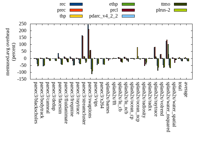 ======= Summary ======= runtime orig rec (overhead) prec (overhead) thp (overhead) ethp (overhead) prcl (overhead) pdarc_v4_2_2 (overhead) ttmo (overhead) plrus-2 (overhead) parsec3/blackscholes 139.567 140.102 (0.38) 140.027 (0.33) 138.571 (-0.71) 139.963 (0.28) 148.232 (6.21) 140.111 (0.39) 140.187 (0.44) 140.149 (0.42) parsec3/bodytrack 126.287 126.135 (-0.12) 127.280 (0.79) 126.562 (0.22) 125.619 (-0.53) 140.262 (11.07) 126.819 (0.42) 125.823 (-0.37) 127.014 (0.58) parsec3/canneal 229.659 221.573 (-3.52) 230.099 (0.19) 181.643 (-20.91) 212.705 (-7.38) 236.354 (2.92) 230.010 (0.15) 233.721 (1.77) 221.062 (-3.74) parsec3/dedup 18.460 18.639 (0.97) 18.723 (1.42) 18.295 (-0.90) 18.451 (-0.05) 20.647 (11.84) 18.906 (2.41) 18.579 (0.64) 18.431 (-0.16) parsec3/facesim 350.844 347.828 (-0.86) 351.846 (0.29) 345.506 (-1.52) 339.322 (-3.28) 364.227 (3.81) 350.948 (0.03) 347.019 (-1.09) 347.190 (-1.04) parsec3/fluidanimate 336.953 343.263 (1.87) 337.542 (0.17) 328.396 (-2.54) 330.722 (-1.85) 344.577 (2.26) 336.562 (-0.12) 336.642 (-0.09) 338.800 (0.55) parsec3/freqmine 436.092 436.603 (0.12) 436.413 (0.07) 435.638 (-0.10) 436.642 (0.13) 444.601 (1.95) 436.718 (0.14) 435.802 (-0.07) 439.278 (0.73) parsec3/raytrace 182.272 183.064 (0.43) 185.157 (1.58) 183.810 (0.84) 185.089 (1.55) 201.493 (10.54) 186.729 (2.44) 187.488 (2.86) 188.552 (3.44) parsec3/streamcluster 677.657 742.427 (9.56) 703.021 (3.74) 539.852 (-20.34) 596.809 (-11.93) 760.021 (12.15) 700.839 (3.42) 671.995 (-0.84) 675.066 (-0.38) parsec3/swaptions 220.478 222.823 (1.06) 221.736 (0.57) 220.478 (0.00) 221.907 (0.65) 224.764 (1.94) 222.019 (0.70) 221.218 (0.34) 221.236 (0.34) parsec3/vips 88.001 88.616 (0.70) 88.871 (0.99) 87.665 (-0.38) 87.956 (-0.05) 90.697 (3.06) 93.997 (6.81) 94.927 (7.87) 95.842 (8.91) parsec3/x264 114.396 111.014 (-2.96) 121.459 (6.17) 110.940 (-3.02) 118.114 (3.25) 113.242 (-1.01) 120.128 (5.01) 122.169 (6.80) 124.960 (9.23) splash2x/barnes 132.482 131.700 (-0.59) 132.200 (-0.21) 119.469 (-9.82) 129.704 (-2.10) 143.223 (8.11) 132.420 (-0.05) 133.079 (0.45) 131.819 (-0.50) splash2x/fft 60.333 61.350 (1.69) 62.006 (2.77) 47.811 (-20.75) 61.756 (2.36) 64.055 (6.17) 63.453 (5.17) 72.631 (20.38) 72.406 (20.01) splash2x/lu_cb 133.039 132.921 (-0.09) 132.898 (-0.11) 132.574 (-0.35) 133.081 (0.03) 137.470 (3.33) 133.575 (0.40) 135.041 (1.50) 134.579 (1.16) splash2x/lu_ncb 150.438 152.473 (1.35) 150.961 (0.35) 150.397 (-0.03) 153.767 (2.21) 153.257 (1.87) 152.901 (1.64) 151.754 (0.87) 154.428 (2.65) splash2x/ocean_cp 79.948 80.482 (0.67) 89.056 (11.39) 77.867 (-2.60) 85.457 (6.89) 82.579 (3.29) 82.114 (2.71) 88.031 (10.11) 84.210 (5.33) splash2x/ocean_ncp 160.994 162.330 (0.83) 168.839 (4.87) 99.284 (-38.33) 147.035 (-8.67) 176.122 (9.40) 168.185 (4.47) 179.575 (11.54) 184.990 (14.90) splash2x/radiosity 142.796 142.225 (-0.40) 143.121 (0.23) 141.825 (-0.68) 142.763 (-0.02) 153.445 (7.46) 143.877 (0.76) 146.512 (2.60) 145.787 (2.09) splash2x/radix 50.401 51.826 (2.83) 52.493 (4.15) 46.768 (-7.21) 51.007 (1.20) 52.090 (3.35) 54.219 (7.58) 55.768 (10.65) 56.373 (11.85) splash2x/raytrace 136.277 135.789 (-0.36) 134.793 (-1.09) 132.134 (-3.04) 135.412 (-0.63) 143.073 (4.99) 135.628 (-0.48) 140.609 (3.18) 139.896 (2.66) splash2x/volrend 119.913 120.928 (0.85) 121.334 (1.19) 120.050 (0.11) 121.063 (0.96) 130.053 (8.46) 120.448 (0.45) 120.967 (0.88) 121.110 (1.00) splash2x/water_nsquared 367.659 372.593 (1.34) 370.118 (0.67) 352.948 (-4.00) 364.968 (-0.73) 400.303 (8.88) 375.497 (2.13) 389.432 (5.92) 393.221 (6.95) splash2x/water_spatial 134.506 134.272 (-0.17) 134.976 (0.35) 134.016 (-0.36) 135.982 (1.10) 147.848 (9.92) 135.683 (0.88) 135.590 (0.81) 137.051 (1.89) total 4589.460 4660.960 (1.56) 4654.980 (1.43) 4272.500 (-6.91) 4475.300 (-2.49) 4872.620 (6.17) 4661.800 (1.58) 4684.560 (2.07) 4693.470 (2.27) average 191.227 194.207 (0.65) 193.957 (1.70) 178.021 (-5.68) 186.471 (-0.69) 203.026 (5.92) 194.242 (1.98) 195.190 (3.63) 195.561 (3.70) kdamond_cpu_util orig rec (overhead) prec (overhead) thp (overhead) ethp (overhead) prcl (overhead) pdarc_v4_2_2 (overhead) ttmo (overhead) plrus-2 (overhead) parsec3/blackscholes 0.000 0.000 (0.00) 0.626 (0.63) 0.000 (0.00) 1.143 (1.14) 7.502 (7.50) 2.429 (2.43) 0.000 (0.00) 1.815 (1.82) parsec3/bodytrack 0.000 1.277 (1.28) 0.536 (0.54) 0.000 (0.00) 0.969 (0.97) 13.240 (13.24) 3.332 (3.33) 0.000 (0.00) 1.790 (1.79) parsec3/canneal 0.000 1.645 (1.64) 6.213 (6.21) 0.000 (0.00) 1.492 (1.49) 2.285 (2.29) 8.560 (8.56) 0.000 (0.00) 2.216 (2.22) parsec3/dedup 0.000 0.874 (0.87) 0.496 (0.50) 0.000 (0.00) 0.892 (0.89) 12.821 (12.82) 2.967 (2.97) 0.000 (0.00) 1.076 (1.08) parsec3/facesim 0.000 1.341 (1.34) 0.614 (0.61) 0.000 (0.00) 1.588 (1.59) 4.304 (4.30) 3.943 (3.94) 0.000 (0.00) 1.971 (1.97) parsec3/fluidanimate 0.000 1.188 (1.19) 0.623 (0.62) 0.000 (0.00) 1.129 (1.13) 1.750 (1.75) 3.982 (3.98) 0.000 (0.00) 1.984 (1.98) parsec3/freqmine 0.000 1.325 (1.32) 0.617 (0.62) 0.000 (0.00) 1.115 (1.12) 4.129 (4.13) 3.655 (3.66) 0.000 (0.00) 1.998 (2.00) parsec3/raytrace 0.000 1.127 (1.13) 0.612 (0.61) 0.000 (0.00) 1.140 (1.14) 10.970 (10.97) 3.146 (3.15) 0.000 (0.00) 1.931 (1.93) parsec3/streamcluster 0.000 10.649 (10.65) 8.270 (8.27) 0.000 (0.00) 1.665 (1.67) 10.868 (10.87) 7.442 (7.44) 0.000 (0.00) 2.391 (2.39) parsec3/swaptions 0.000 1.983 (1.98) 0.585 (0.59) 0.000 (0.00) 1.804 (1.80) 2.414 (2.41) 3.772 (3.77) 0.000 (0.00) 1.900 (1.90) parsec3/vips 0.000 3.684 (3.68) 0.586 (0.59) 0.000 (0.00) 1.300 (1.30) 5.045 (5.04) 2.896 (2.90) 0.000 (0.00) 1.775 (1.78) parsec3/x264 0.000 2.542 (2.54) 0.600 (0.60) 0.000 (0.00) 1.282 (1.28) 2.449 (2.45) 2.807 (2.81) 0.000 (0.00) 1.788 (1.79) splash2x/barnes 0.000 0.997 (1.00) 0.681 (0.68) 0.000 (0.00) 1.013 (1.01) 10.841 (10.84) 4.807 (4.81) 0.000 (0.00) 1.894 (1.89) splash2x/fft 0.000 1.119 (1.12) 0.652 (0.65) 0.000 (0.00) 1.235 (1.24) 10.609 (10.61) 3.729 (3.73) 0.000 (0.00) 1.845 (1.85) splash2x/lu_cb 0.000 1.211 (1.21) 0.598 (0.60) 0.000 (0.00) 1.183 (1.18) 4.