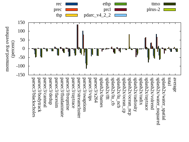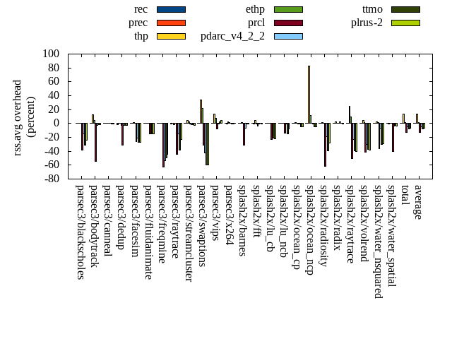 ======= Summary ======= runtime orig rec (overhead) prec (overhead) thp (overhead) ethp (overhead) prcl (overhead) pdarc_v4_2_2 (overhead) ttmo (overhead) plrus-2 (overhead) parsec3/blackscholes 138.924 139.790 (0.62) 138.961 (0.03) 139.402 (0.34) 139.852 (0.67) 145.687 (4.87) 140.037 (0.80) 139.408 (0.35) 140.797 (1.35) parsec3/bodytrack 126.736 126.727 (-0.01) 126.341 (-0.31) 127.596 (0.68) 127.198 (0.36) 140.293 (10.70) 127.440 (0.56) 127.241 (0.40) 128.137 (1.11) parsec3/canneal 210.415 222.234 (5.62) 228.622 (8.65) 182.028 (-13.49) 219.579 (4.35) 217.928 (3.57) 220.781 (4.93) 216.374 (2.83) 227.038 (7.90) parsec3/dedup 18.290 18.638 (1.90) 18.636 (1.89) 18.307 (0.09) 18.552 (1.43) 19.676 (7.58) 18.635 (1.88) 18.610 (1.75) 18.733 (2.42) parsec3/facesim 344.861 355.432 (3.07) 346.382 (0.44) 348.226 (0.98) 348.498 (1.05) 361.673 (4.88) 352.199 (2.13) 355.144 (2.98) 354.013 (2.65) parsec3/fluidanimate 335.646 337.391 (0.52) 338.313 (0.79) 331.518 (-1.23) 334.024 (-0.48) 338.295 (0.79) 338.288 (0.79) 337.243 (0.48) 335.251 (-0.12) parsec3/freqmine 435.601 433.856 (-0.40) 434.905 (-0.16) 433.506 (-0.48) 435.088 (-0.12) 442.338 (1.55) 437.285 (0.39) 436.603 (0.23) 436.171 (0.13) parsec3/raytrace 182.333 183.298 (0.53) 184.808 (1.36) 190.062 (4.24) 186.581 (2.33) 198.770 (9.02) 186.676 (2.38) 188.811 (3.55) 188.365 (3.31) parsec3/streamcluster 693.533 748.090 (7.87) 721.737 (4.07) 529.919 (-23.59) 592.790 (-14.53) 719.858 (3.80) 741.260 (6.88) 679.050 (-2.09) 750.164 (8.17) parsec3/swaptions 219.592 222.789 (1.46) 220.990 (0.64) 220.314 (0.33) 221.598 (0.91) 223.178 (1.63) 221.273 (0.77) 222.660 (1.40) 222.044 (1.12) parsec3/vips 87.534 88.190 (0.75) 88.102 (0.65) 87.340 (-0.22) 87.383 (-0.17) 90.516 (3.41) 92.701 (5.90) 93.412 (6.72) 94.410 (7.86) parsec3/x264 116.276 122.740 (5.56) 115.562 (-0.61) 119.849 (3.07) 121.239 (4.27) 115.073 (-1.03) 115.612 (-0.57) 115.504 (-0.66) 125.095 (7.58) splash2x/barnes 131.968 131.695 (-0.21) 132.830 (0.65) 119.642 (-9.34) 129.006 (-2.24) 142.636 (8.08) 131.850 (-0.09) 132.612 (0.49) 133.250 (0.97) splash2x/fft 60.802 61.175 (0.61) 61.413 (1.00) 48.181 (-20.76) 62.205 (2.31) 62.792 (3.27) 62.559 (2.89) 71.008 (16.78) 71.290 (17.25) splash2x/lu_cb 132.270 133.208 (0.71) 133.293 (0.77) 133.281 (0.76) 132.919 (0.49) 136.677 (3.33) 133.539 (0.96) 134.146 (1.42) 134.363 (1.58) splash2x/lu_ncb 151.181 152.804 (1.07) 152.921 (1.15) 150.692 (-0.32) 153.882 (1.79) 153.111 (1.28) 151.287 (0.07) 153.781 (1.72) 153.252 (1.37) splash2x/ocean_cp 87.388 83.299 (-4.68) 86.302 (-1.24) 85.583 (-2.07) 86.845 (-0.62) 83.905 (-3.99) 88.502 (1.27) 84.398 (-3.42) 84.735 (-3.04) splash2x/ocean_ncp 165.802 169.591 (2.29) 169.406 (2.17) 108.216 (-34.73) 155.751 (-6.06) 173.562 (4.68) 163.479 (-1.40) 180.281 (8.73) 178.951 (7.93) splash2x/radiosity 142.148 143.169 (0.72) 142.614 (0.33) 141.427 (-0.51) 142.236 (0.06) 149.593 (5.24) 143.310 (0.82) 146.005 (2.71) 144.951 (1.97) splash2x/radix 50.737 52.482 (3.44) 51.582 (1.67) 45.231 (-10.85) 50.857 (0.24) 51.912 (2.32) 55.345 (9.08) 55.795 (9.97) 54.418 (7.26) splash2x/raytrace 135.695 135.429 (-0.20) 136.027 (0.25) 134.606 (-0.80) 133.837 (-1.37) 142.743 (5.19) 137.287 (1.17) 139.079 (2.49) 137.106 (1.04) splash2x/volrend 119.923 120.707 (0.65) 120.550 (0.52) 119.860 (-0.05) 120.276 (0.29) 128.038 (6.77) 121.318 (1.16) 121.192 (1.06) 121.228 (1.09) splash2x/water_nsquared 373.858 373.280 (-0.15) 373.260 (-0.16) 356.596 (-4.62) 366.706 (-1.91) 388.330 (3.87) 374.625 (0.21) 388.212 (3.84) 389.438 (4.17) splash2x/water_spatial 135.003 135.127 (0.09) 135.042 (0.03) 134.736 (-0.20) 135.081 (0.06) 145.364 (7.67) 136.747 (1.29) 136.033 (0.76) 138.270 (2.42) total 4596.500 4691.150 (2.06) 4658.590 (1.35) 4306.130 (-6.32) 4502.000 (-2.06) 4771.950 (3.82) 4692.050 (2.08) 4672.590 (1.66) 4761.470 (3.59) average 191.521 195.465 (1.33) 194.108 (1.02) 179.422 (-4.70) 187.583 (-0.29) 198.831 (4.10) 195.502 (1.84) 194.691 (2.69) 198.395 (3.65) kdamond_cpu_util orig rec (overhead) prec (overhead) thp (overhead) ethp (overhead) prcl (overhead) pdarc_v4_2_2 (overhead) ttmo (overhead) plrus-2 (overhead) parsec3/blackscholes 0.000 0.000 (0.00) 0.541 (0.54) 0.000 (0.00) 1.007 (1.01) 5.348 (5.35) 2.129 (2.13) 0.000 (0.00) 1.679 (1.68) parsec3/bodytrack 0.000 1.211 (1.21) 0.454 (0.45) 0.000 (0.00) 1.016 (1.02) 11.542 (11.54) 2.462 (2.46) 0.000 (0.00) 1.567 (1.57) parsec3/canneal 0.000 1.486 (1.49) 3.974 (3.97) 0.000 (0.00) 1.465 (1.46) 1.758 (1.76) 9.899 (9.90) 0.000 (0.00) 2.630 (2.63) parsec3/dedup 0.000 0.912 (0.91) 0.446 (0.45) 0.000 (0.00) 0.725 (0.73) 11.678 (11.68) 3.583 (3.58) 0.000 (0.00) 0.923 (0.92) parsec3/facesim 0.000 1.272 (1.27) 0.534 (0.53) 0.000 (0.00) 1.480 (1.48) 3.535 (3.54) 3.506 (3.51) 0.000 (0.00) 1.758 (1.76) parsec3/fluidanimate 0.000 1.052 (1.05) 0.547 (0.55) 0.000 (0.00) 1.012 (1.01) 1.317 (1.32) 3.506 (3.51) 0.000 (0.00) 1.745 (1.75) parsec3/freqmine 0.000 1.149 (1.15) 0.530 (0.53) 0.000 (0.00) 0.961 (0.96) 3.536 (3.54) 3.172 (3.17) 0.000 (0.00) 1.791 (1.79) parsec3/raytrace 0.000 1.041 (1.04) 0.544 (0.54) 0.000 (0.00) 1.015 (1.01) 8.606 (8.61) 2.557 (2.56) 0.000 (0.00) 1.707 (1.71) parsec3/streamcluster 0.000 9.747 (9.75) 7.538 (7.54) 0.000 (0.00) 1.330 (1.33) 9.945 (9.94) 4.386 (4.39) 0.000 (0.00) 2.325 (2.33) parsec3/swaptions 0.000 1.708 (1.71) 0.521 (0.52) 0.000 (0.00) 0.927 (0.93) 2.157 (2.16) 3.374 (3.37) 0.000 (0.00) 1.721 (1.72) parsec3/vips 0.000 3.082 (3.08) 0.505 (0.50) 0.000 (0.00) 1.070 (1.07) 4.838 (4.84) 2.335 (2.34) 0.000 (0.00) 1.592 (1.59) parsec3/x264 0.000 2.189 (2.19) 0.525 (0.52) 0.000 (0.00) 1.408 (1.41) 2.277 (2.28) 3.022 (3.02) 0.000 (0.00) 1.572 (1.57) splash2x/barnes 0.000 0.917 (0.92) 0.682 (0.68) 0.000 (0.00) 0.918 (0.92) 9.242 (9.24) 4.331 (4.33) 0.000 (0.00) 1.684 (1.68) splash2x/fft 0.000 1.019 (1.02) 0.594 (0.59) 0.000 (0.00) 1.102 (1.10) 7.937 (7.94) 2.726 (2.73) 0.000 (0.00) 1.567 (1.57) splash2x/lu_cb 0.000 1.063 (1.06) 0.528 (0.53) 0.000 (0.00) 1.024 (1.02) 3.987 (3.99) 3.373 (3.37) 0.000
