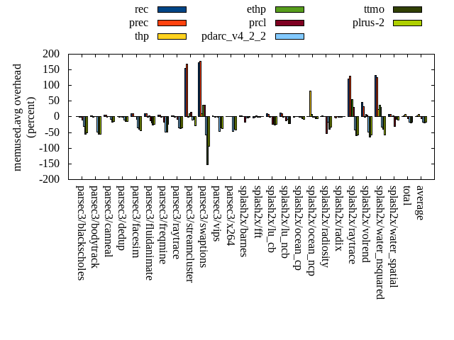 ======= Summary ======= runtime orig rec (overhead) prec (overhead) thp (overhead) ethp (overhead) prcl (overhead) pdarc_v4_2_2 (overhead) ttmo (overhead) plrus-2 (overhead) parsec3/blackscholes 139.887 139.874 (-0.01) 139.949 (0.04) 139.277 (-0.44) 139.658 (-0.16) 145.932 (4.32) 139.899 (0.01) 140.510 (0.45) 140.145 (0.18) parsec3/bodytrack 125.530 127.030 (1.19) 126.584 (0.84) 125.642 (0.09) 127.350 (1.45) 140.691 (12.08) 127.419 (1.50) 126.925 (1.11) 127.982 (1.95) parsec3/canneal 217.004 224.861 (3.62) 217.774 (0.35) 197.382 (-9.04) 207.746 (-4.27) 241.593 (11.33) 241.787 (11.42) 232.664 (7.22) 238.381 (9.85) parsec3/dedup 18.804 18.888 (0.45) 18.738 (-0.35) 18.341 (-2.46) 18.727 (-0.41) 20.407 (8.53) 18.821 (0.09) 18.745 (-0.31) 18.441 (-1.93) parsec3/facesim 347.047 348.292 (0.36) 348.319 (0.37) 340.340 (-1.93) 342.909 (-1.19) 362.181 (4.36) 347.816 (0.22) 350.510 (1.00) 351.970 (1.42) parsec3/fluidanimate 341.901 336.409 (-1.61) 339.889 (-0.59) 329.070 (-3.75) 336.111 (-1.69) 343.408 (0.44) 342.892 (0.29) 334.883 (-2.05) 343.554 (0.48) parsec3/freqmine 436.651 436.559 (-0.02) 437.114 (0.11) 435.525 (-0.26) 439.515 (0.66) 443.537 (1.58) 437.766 (0.26) 437.584 (0.21) 437.481 (0.19) parsec3/raytrace 182.945 184.385 (0.79) 184.037 (0.60) 186.599 (2.00) 183.422 (0.26) 202.224 (10.54) 186.144 (1.75) 188.501 (3.04) 185.944 (1.64) parsec3/streamcluster 682.407 689.550 (1.05) 694.777 (1.81) 575.573 (-15.66) 621.934 (-8.86) 738.754 (8.26) 711.441 (4.25) 726.085 (6.40) 619.859 (-9.17) parsec3/swaptions 223.299 223.786 (0.22) 221.004 (-1.03) 221.596 (-0.76) 222.119 (-0.53) 226.067 (1.24) 223.189 (-0.05) 222.337 (-0.43) 222.448 (-0.38) parsec3/vips 87.629 88.824 (1.36) 88.338 (0.81) 87.569 (-0.07) 88.036 (0.46) 89.984 (2.69) 93.408 (6.59) 94.934 (8.34) 95.404 (8.87) parsec3/x264 113.179 120.680 (6.63) 121.813 (7.63) 114.706 (1.35) 112.505 (-0.60) 111.699 (-1.31) 124.786 (10.26) 115.808 (2.32) 123.217 (8.87) splash2x/barnes 131.261 130.430 (-0.63) 130.184 (-0.82) 119.505 (-8.96) 128.203 (-2.33) 143.528 (9.35) 133.130 (1.42) 135.102 (2.93) 132.793 (1.17) splash2x/fft 61.141 61.722 (0.95) 63.646 (4.10) 47.311 (-22.62) 60.296 (-1.38) 64.241 (5.07) 61.679 (0.88) 69.295 (13.34) 70.913 (15.98) splash2x/lu_cb 133.236 133.937 (0.53) 133.530 (0.22) 133.301 (0.05) 133.736 (0.38) 137.091 (2.89) 133.152 (-0.06) 133.890 (0.49) 133.862 (0.47) splash2x/lu_ncb 151.225 154.781 (2.35) 153.687 (1.63) 152.094 (0.57) 154.183 (1.96) 155.855 (3.06) 152.471 (0.82) 154.190 (1.96) 152.754 (1.01) splash2x/ocean_cp 84.973 85.786 (0.96) 82.876 (-2.47) 85.362 (0.46) 83.925 (-1.23) 82.537 (-2.87) 81.357 (-4.26) 85.705 (0.86) 83.573 (-1.65) splash2x/ocean_ncp 162.428 161.278 (-0.71) 166.051 (2.23) 109.138 (-32.81) 152.511 (-6.11) 167.636 (3.21) 169.500 (4.35) 181.366 (11.66) 187.114 (15.20) splash2x/radiosity 142.978 142.964 (-0.01) 142.408 (-0.40) 142.488 (-0.34) 142.863 (-0.08) 152.854 (6.91) 144.261 (0.90) 146.790 (2.67) 144.863 (1.32) splash2x/radix 51.632 51.888 (0.50) 51.487 (-0.28) 44.695 (-13.44) 51.474 (-0.31) 52.104 (0.91) 54.422 (5.40) 56.522 (9.47) 56.246 (8.94) splash2x/raytrace 134.826 134.686 (-0.10) 134.743 (-0.06) 134.908 (0.06) 135.357 (0.39) 143.641 (6.54) 135.053 (0.17) 137.141 (1.72) 137.950 (2.32) splash2x/volrend 120.185 120.575 (0.33) 120.635 (0.37) 119.802 (-0.32) 120.456 (0.23) 129.802 (8.00) 121.337 (0.96) 120.935 (0.62) 121.217 (0.86) splash2x/water_nsquared 373.395 373.195 (-0.05) 370.229 (-0.85) 354.853 (-4.97) 371.195 (-0.59) 401.080 (7.41) 373.169 (-0.06) 392.117 (5.01) 391.833 (4.94) splash2x/water_spatial 134.582 135.449 (0.64) 134.139 (-0.33) 136.233 (1.23) 135.601 (0.76) 149.547 (11.12) 136.777 (1.63) 136.220 (1.22) 136.514 (1.44) total 4598.150 4625.850 (0.60) 4621.950 (0.52) 4351.310 (-5.37) 4509.810 (-1.92) 4846.390 (5.40) 4691.680 (2.03) 4738.760 (3.06) 4654.430 (1.22) average 191.590 192.744 (0.78) 192.581 (0.58) 181.305 (-4.67) 187.909 (-0.97) 201.933 (5.24) 195.487 (2.03) 197.448 (3.30) 193.935 (3.08) kdamond_cpu_util orig rec (overhead) prec (overhead) thp (overhead) ethp (overhead) prcl (overhead) pdarc_v4_2_2 (overhead) ttmo (overhead) plrus-2 (overhead) parsec3/blackscholes 0.000 0.000 (0.00) 0.598 (0.60) 0.000 (0.00) 1.167 (1.17) 6.092 (6.09) 2.409 (2.41) 0.000 (0.00) 1.798 (1.80) parsec3/bodytrack 0.000 1.310 (1.31) 0.529 (0.53) 0.000 (0.00) 1.132 (1.13) 12.946 (12.95) 2.891 (2.89) 0.000 (0.00) 1.801 (1.80) parsec3/canneal 0.000 2.524 (2.52) 3.393 (3.39) 0.000 (0.00) 1.494 (1.49) 2.003 (2.00) 6.968 (6.97) 0.000 (0.00) 2.504 (2.50) parsec3/dedup 0.000 0.947 (0.95) 0.459 (0.46) 0.000 (0.00) 1.002 (1.00) 12.046 (12.05) 2.711 (2.71) 0.000 (0.00) 1.085 (1.09) parsec3/facesim 0.000 1.417 (1.42) 0.616 (0.62) 0.000 (0.00) 1.650 (1.65) 4.233 (4.23) 3.991 (3.99) 0.000 (0.00) 1.978 (1.98) parsec3/fluidanimate 0.000 1.194 (1.19) 0.626 (0.63) 0.000 (0.00) 1.145 (1.14) 1.907 (1.91) 3.978 (3.98) 0.000 (0.00) 1.967 (1.97) parsec3/freqmine 0.000 1.190 (1.19) 0.614 (0.61) 0.000 (0.00) 1.095 (1.10) 4.033 (4.03) 3.658 (3.66) 0.000 (0.00) 1.994 (1.99) parsec3/raytrace 0.000 1.166 (1.17) 0.610 (0.61) 0.000 (0.00) 1.093 (1.09) 9.396 (9.40) 3.596 (3.60) 0.000 (0.00) 1.894 (1.89) parsec3/streamcluster 0.000 10.665 (10.67) 8.523 (8.52) 0.000 (0.00) 1.607 (1.61) 11.097 (11.10) 8.393 (8.39) 0.000 (0.00) 4.168 (4.17) parsec3/swaptions 0.000 1.897 (1.90) 0.612 (0.61) 0.000 (0.00) 1.157 (1.16) 2.268 (2.27) 3.776 (3.78) 0.000 (0.00) 1.861 (1.86) parsec3/vips 0.000 3.406 (3.41) 0.600 (0.60) 0.000 (0.00) 1.298 (1.30) 5.692 (5.69) 3.014 (3.01) 0.000 (0.00) 1.739 (1.74) parsec3/x264 0.000 2.500 (2.50) 0.597 (0.60) 0.000 (0.00) 1.429 (1.43) 2.558 (2.56) 3.223 (3.22) 0.000 (0.00) 1.802 (1.80) splash2x/barnes 0.000 1.042 (1.04) 0.793 (0.79) 0.000 (0.00) 1.031 (1.03) 9.929 (9.93) 5.052 (5.05) 0.000 (0.00) 1.925 (1.93) splash2x/fft 0.000 1.145 (1.15) 0.660 (0.66) 0.000 (0.00) 1.188 (1.19) 10.117 (10.12) 4.292 (4.29) 0.000 (0.00) 1.777 (1.78) splash2x/lu_cb 0.000 1.185 (1.18) 0.595 (0.60) 0.000 (0.00) 1.138 (1.14) 4.14