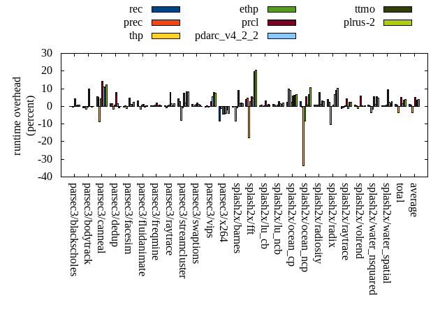 ======= Summary ======= runtime orig rec (overhead) prec (overhead) thp (overhead) ethp (overhead) prcl (overhead) pdarc_v4_2_2 (overhead) ttmo (overhead) plrus-2 (overhead) parsec3/blackscholes 139.524 139.717 (0.14) 139.692 (0.12) 139.070 (-0.33) 139.441 (-0.06) 145.764 (4.47) 139.951 (0.31) 140.274 (0.54) 140.747 (0.88) parsec3/bodytrack 127.504 126.627 (-0.69) 126.327 (-0.92) 125.322 (-1.71) 126.777 (-0.57) 139.938 (9.75) 127.551 (0.04) 126.733 (-0.60) 127.577 (0.06) parsec3/canneal 206.370 217.740 (5.51) 217.238 (5.27) 187.988 (-8.91) 215.610 (4.48) 235.577 (14.15) 228.841 (10.89) 228.846 (10.89) 231.218 (12.04) parsec3/dedup 18.490 18.751 (1.41) 18.774 (1.53) 18.167 (-1.75) 18.648 (0.85) 19.964 (7.97) 18.774 (1.54) 18.317 (-0.94) 18.454 (-0.20) parsec3/facesim 347.264 346.135 (-0.33) 348.823 (0.45) 342.334 (-1.42) 346.770 (-0.14) 363.797 (4.76) 351.212 (1.14) 350.791 (1.02) 354.910 (2.20) parsec3/fluidanimate 337.770 347.986 (3.02) 337.522 (-0.07) 331.608 (-1.82) 339.979 (0.65) 341.323 (1.05) 336.373 (-0.41) 339.223 (0.43) 338.898 (0.33) parsec3/freqmine 435.487 437.444 (0.45) 436.662 (0.27) 437.539 (0.47) 438.443 (0.68) 444.158 (1.99) 437.057 (0.36) 438.151 (0.61) 437.657 (0.50) parsec3/raytrace 185.391 185.763 (0.20) 183.615 (-0.96) 186.113 (0.39) 186.689 (0.70) 200.199 (7.99) 188.174 (1.50) 185.748 (0.19) 188.462 (1.66) parsec3/streamcluster 660.661 688.280 (4.18) 678.329 (2.67) 608.673 (-7.87) 654.787 (-0.89) 710.268 (7.51) 673.791 (1.99) 713.861 (8.05) 715.034 (8.23) parsec3/swaptions 220.949 223.289 (1.06) 221.205 (0.12) 222.754 (0.82) 223.339 (1.08) 225.151 (1.90) 223.282 (1.06) 222.995 (0.93) 221.133 (0.08) parsec3/vips 88.361 88.073 (-0.33) 88.570 (0.24) 87.874 (-0.55) 88.224 (-0.16) 90.922 (2.90) 93.271 (5.56) 95.143 (7.67) 94.931 (7.44) parsec3/x264 122.105 111.736 (-8.49) 121.381 (-0.59) 120.602 (-1.23) 116.851 (-4.30) 116.540 (-4.56) 117.073 (-4.12) 119.716 (-1.96) 117.214 (-4.01) splash2x/barnes 130.725 130.132 (-0.45) 130.884 (0.12) 119.963 (-8.23) 129.372 (-1.03) 142.303 (8.86) 132.549 (1.40) 133.367 (2.02) 132.518 (1.37) splash2x/fft 60.178 62.444 (3.76) 63.081 (4.82) 49.378 (-17.95) 61.826 (2.74) 63.462 (5.46) 62.944 (4.60) 72.151 (19.90) 72.409 (20.32) splash2x/lu_cb 132.836 133.422 (0.44) 133.977 (0.86) 132.945 (0.08) 133.130 (0.22) 137.102 (3.21) 133.099 (0.20) 134.505 (1.26) 134.016 (0.89) splash2x/lu_ncb 151.075 153.067 (1.32) 151.953 (0.58) 151.167 (0.06) 152.167 (0.72) 155.039 (2.62) 153.658 (1.71) 152.487 (0.93) 154.080 (1.99) splash2x/ocean_cp 79.715 81.619 (2.39) 87.500 (9.77) 86.796 (8.88) 81.677 (2.46) 84.427 (5.91) 84.674 (6.22) 84.726 (6.29) 85.163 (6.84) splash2x/ocean_ncp 165.522 170.313 (2.89) 164.823 (-0.42) 109.873 (-33.62) 151.478 (-8.48) 174.602 (5.49) 166.521 (0.60) 176.587 (6.69) 182.880 (10.49) splash2x/radiosity 141.911 142.901 (0.70) 142.853 (0.66) 142.709 (0.56) 143.153 (0.88) 152.876 (7.73) 143.697 (1.26) 146.054 (2.92) 145.680 (2.66) splash2x/radix 50.831 52.885 (4.04) 51.998 (2.29) 45.503 (-10.48) 50.773 (-0.12) 51.187 (0.70) 54.254 (6.73) 55.475 (9.13) 56.107 (10.38) splash2x/raytrace 136.389 134.818 (-1.15) 135.165 (-0.90) 135.559 (-0.61) 136.674 (0.21) 142.125 (4.21) 134.800 (-1.17) 139.603 (2.36) 139.357 (2.18) splash2x/volrend 120.688 121.655 (0.80) 121.038 (0.29) 119.054 (-1.35) 120.436 (-0.21) 127.641 (5.76) 120.865 (0.15) 120.686 (-0.00) 121.222 (0.44) splash2x/water_nsquared 372.748 375.850 (0.83) 373.352 (0.16) 359.299 (-3.61) 367.185 (-1.49) 392.547 (5.31) 377.107 (1.17) 393.135 (5.47) 390.360 (4.72) splash2x/water_spatial 134.080 134.714 (0.47) 134.411 (0.25) 134.557 (0.36) 134.897 (0.61) 146.500 (9.26) 137.068 (2.23) 136.312 (1.67) 137.771 (2.75) total 4566.580 4625.360 (1.29) 4609.160 (0.93) 4394.830 (-3.76) 4558.340 (-0.18) 4803.410 (5.19) 4636.570 (1.53) 4724.880 (3.47) 4737.790 (3.75) average 190.274 192.723 (0.92) 192.048 (1.11) 183.118 (-3.74) 189.931 (-0.05) 200.142 (5.18) 193.190 (1.87) 196.870 (3.56) 197.408 (3.93) kdamond_cpu_util orig rec (overhead) prec (overhead) thp (overhead) ethp (overhead) prcl (overhead) pdarc_v4_2_2 (overhead) ttmo (overhead) plrus-2 (overhead) parsec3/blackscholes 0.000 0.000 (0.00) 0.616 (0.62) 0.000 (0.00) 0.990 (0.99) 6.018 (6.02) 2.296 (2.30) 0.000 (0.00) 1.820 (1.82) parsec3/bodytrack 0.000 1.372 (1.37) 0.527 (0.53) 0.000 (0.00) 0.989 (0.99) 12.305 (12.30) 3.270 (3.27) 0.000 (0.00) 1.849 (1.85) parsec3/canneal 0.000 1.568 (1.57) 1.226 (1.23) 0.000 (0.00) 1.467 (1.47) 2.118 (2.12) 4.994 (4.99) 0.000 (0.00) 2.200 (2.20) parsec3/dedup 0.000 0.932 (0.93) 0.504 (0.50) 0.000 (0.00) 0.977 (0.98) 12.804 (12.80) 3.716 (3.72) 0.000 (0.00) 1.069 (1.07) parsec3/facesim 0.000 1.378 (1.38) 0.627 (0.63) 0.000 (0.00) 1.671 (1.67) 4.074 (4.07) 3.954 (3.95) 0.000 (0.00) 1.990 (1.99) parsec3/fluidanimate 0.000 1.208 (1.21) 0.610 (0.61) 0.000 (0.00) 1.186 (1.19) 1.561 (1.56) 3.977 (3.98) 0.000 (0.00) 1.976 (1.98) parsec3/freqmine 0.000 1.183 (1.18) 0.626 (0.63) 0.000 (0.00) 1.089 (1.09) 4.069 (4.07) 3.727 (3.73) 0.000 (0.00) 1.995 (1.99) parsec3/raytrace 0.000 1.171 (1.17) 0.609 (0.61) 0.000 (0.00) 1.115 (1.11) 9.829 (9.83) 3.403 (3.40) 0.000 (0.00) 1.912 (1.91) parsec3/streamcluster 0.000 10.798 (10.80) 5.774 (5.77) 0.000 (0.00) 1.322 (1.32) 11.108 (11.11) 5.473 (5.47) 0.000 (0.00) 2.086 (2.09) parsec3/swaptions 0.000 1.846 (1.85) 0.585 (0.58) 0.000 (0.00) 1.228 (1.23) 2.378 (2.38) 3.823 (3.82) 0.000 (0.00) 1.900 (1.90) parsec3/vips 0.000 3.448 (3.45) 0.578 (0.58) 0.000 (0.00) 1.458 (1.46) 5.420 (5.42) 3.253 (3.25) 0.000 (0.00) 1.642 (1.64) parsec3/x264 0.000 2.594 (2.59) 0.580 (0.58) 0.000 (0.00) 1.771 (1.77) 2.610 (2.61) 3.374 (3.37) 0.000 (0.00) 1.757 (1.76) splash2x/barnes 0.000 1.041 (1.04) 0.669 (0.67) 0.000 (0.00) 1.080 (1.08) 9.224 (9.22) 4.729 (4.73) 0.000 (0.00) 1.863 (1.86) splash2x/fft 0.000 1.133 (1.13) 0.654 (0.65) 0.000 (0.00) 1.145 (1.15) 10.117 (10.12) 2.590 (2.59) 0.000 (0.00) 1.777 (1.78) splash2x/lu_cb 0.000 1.204 (1.20) 0.592 (0.59) 0.000 (0.00) 1.149 (1.15) 4.183 (4.18) 3.505 (