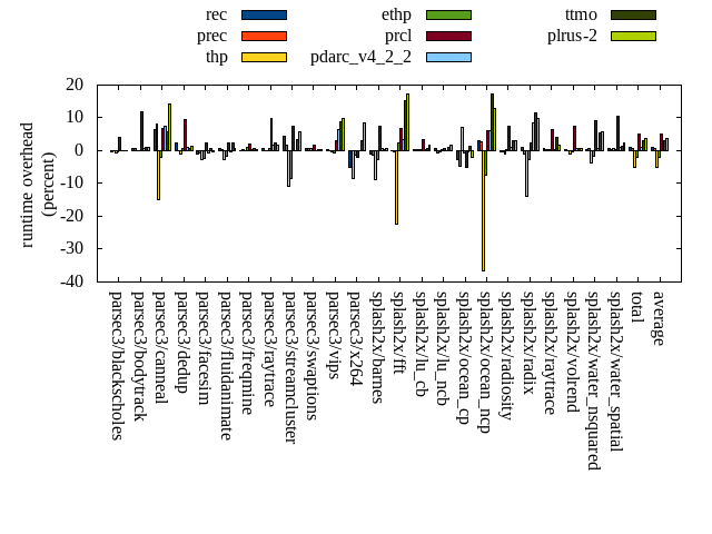 ======= Summary ======= runtime orig rec (overhead) prec (overhead) thp (overhead) ethp (overhead) prcl (overhead) pdarc_v4_2_2 (overhead) ttmo (overhead) plrus-2 (overhead) parsec3/blackscholes 140.389 139.926 (-0.33) 140.342 (-0.03) 139.304 (-0.77) 139.824 (-0.40) 146.145 (4.10) 140.254 (-0.10) 140.367 (-0.02) 140.463 (0.05) parsec3/bodytrack 125.626 126.628 (0.80) 126.342 (0.57) 125.492 (-0.11) 125.589 (-0.03) 140.649 (11.96) 126.563 (0.75) 126.734 (0.88) 126.705 (0.86) parsec3/canneal 213.201 227.075 (6.51) 230.429 (8.08) 181.304 (-14.96) 209.154 (-1.90) 227.899 (6.89) 229.016 (7.42) 225.748 (5.88) 243.198 (14.07) parsec3/dedup 18.408 18.835 (2.32) 18.410 (0.01) 18.248 (-0.87) 18.517 (0.59) 20.146 (9.44) 18.608 (1.09) 18.526 (0.64) 18.666 (1.40) parsec3/facesim 351.028 347.871 (-0.90) 349.165 (-0.53) 341.857 (-2.61) 342.780 (-2.35) 359.826 (2.51) 348.712 (-0.66) 353.254 (0.63) 349.621 (-0.40) parsec3/fluidanimate 337.447 339.188 (0.52) 338.243 (0.24) 328.063 (-2.78) 332.171 (-1.56) 345.224 (2.30) 335.852 (-0.47) 345.018 (2.24) 340.246 (0.83) parsec3/freqmine 435.474 436.043 (0.13) 436.509 (0.24) 435.579 (0.02) 439.180 (0.85) 444.345 (2.04) 436.567 (0.25) 437.882 (0.55) 437.471 (0.46) parsec3/raytrace 183.592 184.899 (0.71) 183.652 (0.03) 183.885 (0.16) 185.000 (0.77) 201.843 (9.94) 186.655 (1.67) 187.742 (2.26) 186.977 (1.84) parsec3/streamcluster 655.146 682.938 (4.24) 665.941 (1.65) 584.177 (-10.83) 598.770 (-8.61) 703.690 (7.41) 655.615 (0.07) 677.610 (3.43) 693.706 (5.89) parsec3/swaptions 220.812 222.475 (0.75) 222.076 (0.57) 221.983 (0.53) 221.640 (0.38) 224.861 (1.83) 220.768 (-0.02) 221.568 (0.34) 221.885 (0.49) parsec3/vips 88.222 88.533 (0.35) 88.290 (0.08) 87.878 (-0.39) 87.677 (-0.62) 91.014 (3.16) 93.962 (6.51) 96.146 (8.98) 96.813 (9.74) parsec3/x264 117.228 111.236 (-5.11) 113.220 (-3.42) 107.383 (-8.40) 115.769 (-1.24) 114.782 (-2.09) 117.363 (0.12) 120.729 (2.99) 127.072 (8.40) splash2x/barnes 132.121 130.785 (-1.01) 130.498 (-1.23) 120.348 (-8.91) 128.725 (-2.57) 141.930 (7.42) 133.166 (0.79) 132.570 (0.34) 132.859 (0.56) splash2x/fft 60.659 60.567 (-0.15) 60.449 (-0.35) 46.994 (-22.53) 62.020 (2.24) 64.748 (6.74) 62.725 (3.41) 69.908 (15.25) 71.121 (17.25) splash2x/lu_cb 132.855 133.357 (0.38) 133.393 (0.41) 133.146 (0.22) 133.460 (0.46) 137.211 (3.28) 133.463 (0.46) 133.832 (0.74) 134.912 (1.55) splash2x/lu_ncb 151.502 152.513 (0.67) 150.573 (-0.61) 150.775 (-0.48) 152.029 (0.35) 152.636 (0.75) 151.519 (0.01) 153.204 (1.12) 154.166 (1.76) splash2x/ocean_cp 86.610 84.283 (-2.69) 82.559 (-4.68) 92.765 (7.11) 86.135 (-0.55) 82.152 (-5.15) 86.177 (-0.50) 87.707 (1.27) 84.865 (-2.02) splash2x/ocean_ncp 162.160 167.180 (3.10) 166.339 (2.58) 102.814 (-36.60) 149.898 (-7.56) 171.838 (5.97) 172.293 (6.25) 189.937 (17.13) 183.306 (13.04) splash2x/radiosity 142.619 142.364 (-0.18) 142.331 (-0.20) 141.186 (-1.00) 143.152 (0.37) 153.416 (7.57) 144.030 (0.99) 146.852 (2.97) 146.937 (3.03) splash2x/radix 51.253 51.804 (1.08) 50.675 (-1.13) 44.189 (-13.78) 49.942 (-2.56) 52.461 (2.36) 55.682 (8.64) 57.221 (11.64) 56.266 (9.78) splash2x/raytrace 134.466 135.297 (0.62) 135.026 (0.42) 135.036 (0.42) 134.742 (0.21) 143.248 (6.53) 134.888 (0.31) 139.890 (4.03) 136.961 (1.86) splash2x/volrend 120.432 120.871 (0.36) 120.339 (-0.08) 119.301 (-0.94) 119.918 (-0.43) 129.311 (7.37) 121.083 (0.54) 121.209 (0.65) 121.165 (0.61) splash2x/water_nsquared 371.048 372.070 (0.28) 373.550 (0.67) 357.306 (-3.70) 364.536 (-1.76) 405.149 (9.19) 374.014 (0.80) 391.438 (5.50) 392.925 (5.90) splash2x/water_spatial 133.571 134.259 (0.52) 134.125 (0.41) 134.647 (0.81) 134.019 (0.34) 147.769 (10.63) 134.706 (0.85) 135.264 (1.27) 136.730 (2.36) total 4565.860 4610.990 (0.99) 4592.490 (0.58) 4333.670 (-5.09) 4474.660 (-2.00) 4802.290 (5.18) 4613.670 (1.05) 4710.360 (3.16) 4735.040 (3.71) average 190.244 192.125 (0.54) 191.354 (0.15) 180.570 (-5.02) 186.444 (-1.07) 200.095 (5.09) 192.236 (1.63) 196.265 (3.78) 197.293 (4.14) kdamond_cpu_util orig rec (overhead) prec (overhead) thp (overhead) ethp (overhead) prcl (overhead) pdarc_v4_2_2 (overhead) ttmo (overhead) plrus-2 (overhead) parsec3/blackscholes 0.000 0.000 (0.00) 0.648 (0.65) 0.000 (0.00) 1.162 (1.16) 6.111 (6.11) 2.495 (2.49) 0.000 (0.00) 1.944 (1.94) parsec3/bodytrack 0.000 1.392 (1.39) 0.583 (0.58) 0.000 (0.00) 1.156 (1.16) 14.053 (14.05) 3.226 (3.23) 0.000 (0.00) 1.877 (1.88) parsec3/canneal 0.000 1.674 (1.67) 5.422 (5.42) 0.000 (0.00) 1.539 (1.54) 2.196 (2.20) 7.904 (7.90) 0.000 (0.00) 2.562 (2.56) parsec3/dedup 0.000 1.025 (1.02) 0.524 (0.52) 0.000 (0.00) 1.062 (1.06) 12.854 (12.85) 3.539 (3.54) 0.000 (0.00) 1.051 (1.05) parsec3/facesim 0.000 1.510 (1.51) 0.660 (0.66) 0.000 (0.00) 1.750 (1.75) 4.132 (4.13) 4.298 (4.30) 0.000 (0.00) 2.108 (2.11) parsec3/fluidanimate 0.000 1.296 (1.30) 0.673 (0.67) 0.000 (0.00) 1.243 (1.24) 1.676 (1.68) 4.242 (4.24) 0.000 (0.00) 2.112 (2.11) parsec3/freqmine 0.000 1.172 (1.17) 0.667 (0.67) 0.000 (0.00) 1.120 (1.12) 4.348 (4.35) 3.848 (3.85) 0.000 (0.00) 2.113 (2.11) parsec3/raytrace 0.000 1.239 (1.24) 0.658 (0.66) 0.000 (0.00) 1.181 (1.18) 10.132 (10.13) 3.586 (3.59) 0.000 (0.00) 2.079 (2.08) parsec3/streamcluster 0.000 11.388 (11.39) 9.268 (9.27) 0.000 (0.00) 1.364 (1.36) 11.828 (11.83) 6.923 (6.92) 0.000 (0.00) 3.773 (3.77) parsec3/swaptions 0.000 1.916 (1.92) 0.646 (0.65) 0.000 (0.00) 1.006 (1.01) 2.485 (2.48) 4.125 (4.12) 0.000 (0.00) 2.035 (2.04) parsec3/vips 0.000 3.244 (3.24) 0.641 (0.64) 0.000 (0.00) 1.255 (1.25) 5.832 (5.83) 3.418 (3.42) 0.000 (0.00) 1.851 (1.85) parsec3/x264 0.000 2.572 (2.57) 0.647 (0.65) 0.000 (0.00) 1.438 (1.44) 2.664 (2.66) 3.242 (3.24) 0.000 (0.00) 1.826 (1.83) splash2x/barnes 0.000 1.106 (1.11) 0.812 (0.81) 0.000 (0.00) 1.096 (1.10) 9.373 (9.37) 5.293 (5.29) 0.000 (0.00) 2.009 (2.01) splash2x/fft 0.000 1.165 (1.16) 0.708 (0.71) 0.000 (0.00) 1.264 (1.26) 11.009 (11.01) 3.539 (3.54) 0.000 (0.00) 1.914 (1.91) splash2x/lu_cb 0.000 1.285 (1.28) 0.648 (0.65) 0.000 (0.00) 1.279 (1.28) 4.279 (