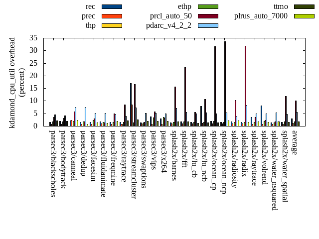 ======= Summary ======= runtime orig rec (overhead) prec (overhead) thp (overhead) ethp (overhead) prcl_auto_50 (overhead) pdarc_v4_2_2 (overhead) ttmo (overhead) plrus_auto_7000 (overhead) parsec3/blackscholes 139.239 141.259 (1.45) 140.404 (0.84) 140.027 (0.57) 141.068 (1.31) 142.690 (2.48) 140.521 (0.92) 140.991 (1.26) 141.379 (1.54) parsec3/bodytrack 125.591 125.591 (0.00) 125.009 (-0.46) 124.564 (-0.82) 127.320 (1.38) 127.258 (1.33) 128.515 (2.33) 123.969 (-1.29) 125.002 (-0.47) parsec3/canneal 231.711 216.628 (-6.51) 233.442 (0.75) 194.687 (-15.98) 190.216 (-17.91) 237.852 (2.65) 226.779 (-2.13) 214.201 (-7.56) 228.918 (-1.21) parsec3/dedup 18.330 18.183 (-0.80) 18.269 (-0.33) 18.440 (0.60) 18.524 (1.06) 18.620 (1.58) 19.089 (4.14) 18.408 (0.43) 18.281 (-0.27) parsec3/facesim 344.499 350.912 (1.86) 345.957 (0.42) 341.148 (-0.97) 340.628 (-1.12) 357.772 (3.85) 353.391 (2.58) 351.148 (1.93) 351.927 (2.16) parsec3/fluidanimate 333.145 331.535 (-0.48) 334.839 (0.51) 326.806 (-1.90) 330.442 (-0.81) 338.806 (1.70) 339.477 (1.90) 332.460 (-0.21) 338.234 (1.53) parsec3/freqmine 435.859 438.905 (0.70) 437.394 (0.35) 436.824 (0.22) 438.828 (0.68) 453.607 (4.07) 441.038 (1.19) 438.057 (0.50) 440.239 (1.00) parsec3/raytrace 180.603 187.382 (3.75) 183.619 (1.67) 186.491 (3.26) 182.136 (0.85) 196.948 (9.05) 187.449 (3.79) 186.475 (3.25) 185.120 (2.50) parsec3/streamcluster 603.550 690.706 (14.44) 638.244 (5.75) 529.394 (-12.29) 533.768 (-11.56) 734.975 (21.78) 692.191 (14.69) 636.269 (5.42) 629.475 (4.30) parsec3/swaptions 223.067 225.490 (1.09) 222.812 (-0.11) 224.452 (0.62) 222.657 (-0.18) 224.652 (0.71) 223.183 (0.05) 222.642 (-0.19) 224.886 (0.82) parsec3/vips 87.881 89.282 (1.59) 88.655 (0.88) 88.555 (0.77) 88.413 (0.61) 90.572 (3.06) 90.590 (3.08) 99.435 (13.15) 99.815 (13.58) parsec3/x264 113.932 113.027 (-0.79) 127.465 (11.88) 112.335 (-1.40) 108.801 (-4.50) 127.904 (12.26) 118.700 (4.19) 116.005 (1.82) 121.098 (6.29) splash2x/barnes 131.383 129.592 (-1.36) 129.864 (-1.16) 118.645 (-9.70) 130.639 (-0.57) 152.110 (15.78) 133.468 (1.59) 131.679 (0.23) 132.324 (0.72) splash2x/fft 62.006 62.787 (1.26) 62.171 (0.27) 47.076 (-24.08) 62.060 (0.09) 66.054 (6.53) 65.930 (6.33) 74.995 (20.95) 68.866 (11.06) splash2x/lu_cb 132.847 134.187 (1.01) 132.625 (-0.17) 133.306 (0.35) 133.852 (0.76) 139.602 (5.08) 133.911 (0.80) 134.122 (0.96) 135.139 (1.73) splash2x/lu_ncb 149.228 152.774 (2.38) 150.263 (0.69) 149.028 (-0.13) 151.336 (1.41) 153.452 (2.83) 150.608 (0.92) 151.952 (1.83) 153.213 (2.67) splash2x/ocean_cp 79.268 88.415 (11.54) 84.709 (6.86) 83.584 (5.44) 78.972 (-0.37) 102.606 (29.44) 78.151 (-1.41) 82.744 (4.39) 87.161 (9.96) splash2x/ocean_ncp 156.043 166.449 (6.67) 175.966 (12.77) 102.026 (-34.62) 140.698 (-9.83) 281.084 (80.13) 175.374 (12.39) 185.070 (18.60) 174.281 (11.69) splash2x/radiosity 142.238 143.459 (0.86) 143.200 (0.68) 141.592 (-0.45) 143.201 (0.68) 152.948 (7.53) 146.112 (2.72) 144.464 (1.57) 145.431 (2.25) splash2x/radix 52.308 52.537 (0.44) 53.289 (1.88) 47.015 (-10.12) 48.228 (-7.80) 70.392 (34.57) 57.389 (9.71) 55.947 (6.96) 57.307 (9.56) splash2x/raytrace 133.691 134.477 (0.59) 133.434 (-0.19) 132.478 (-0.91) 135.829 (1.60) 142.288 (6.43) 136.213 (1.89) 138.426 (3.54) 137.684 (2.99) splash2x/volrend 121.010 121.340 (0.27) 120.130 (-0.73) 119.976 (-0.85) 119.602 (-1.16) 121.510 (0.41) 121.026 (0.01) 120.578 (-0.36) 121.777 (0.63) splash2x/water_nsquared 381.329 384.168 (0.74) 381.893 (0.15) 353.760 (-7.23) 361.092 (-5.31) 417.657 (9.53) 382.322 (0.26) 391.641 (2.70) 386.122 (1.26) splash2x/water_spatial 134.173 134.394 (0.17) 135.283 (0.83) 133.382 (-0.59) 136.039 (1.39) 148.156 (10.42) 139.683 (4.11) 135.082 (0.68) 137.265 (2.30) total 4512.940 4633.490 (2.67) 4598.920 (1.91) 4285.600 (-5.04) 4364.360 (-3.29) 4999.520 (10.78) 4681.100 (3.73) 4626.760 (2.52) 4640.940 (2.84) average 188.039 193.062 (1.70) 191.622 (1.83) 178.567 (-4.59) 181.848 (-2.06) 208.313 (11.38) 195.046 (3.17) 192.782 (3.36) 193.372 (3.69) kdamond_cpu_util orig rec (overhead) prec (overhead) thp (overhead) ethp (overhead) prcl_auto_50 (overhead) pdarc_v4_2_2 (overhead) ttmo (overhead) plrus_auto_7000 (overhead) parsec3/blackscholes 0.000 1.648 (1.65) 0.870 (0.87) 0.000 (0.00) 1.794 (1.79) 3.525 (3.52) 4.522 (4.52) 0.000 (0.00) 2.124 (2.12) parsec3/bodytrack 0.000 1.883 (1.88) 0.806 (0.81) 0.000 (0.00) 1.873 (1.87) 3.142 (3.14) 4.154 (4.15) 0.000 (0.00) 1.988 (1.99) parsec3/canneal 0.000 2.206 (2.21) 2.307 (2.31) 0.000 (0.00) 1.925 (1.92) 5.766 (5.77) 7.529 (7.53) 0.000 (0.00) 2.279 (2.28) parsec3/dedup 0.000 1.624 (1.62) 0.795 (0.79) 0.000 (0.00) 1.737 (1.74) 1.728 (1.73) 7.596 (7.60) 0.000 (0.00) 0.884 (0.88) parsec3/facesim 0.000 1.504 (1.50) 0.879 (0.88) 0.000 (0.00) 2.349 (2.35) 2.908 (2.91) 5.223 (5.22) 0.000 (0.00) 1.326 (1.33) parsec3/fluidanimate 0.000 1.778 (1.78) 0.911 (0.91) 0.000 (0.00) 1.521 (1.52) 1.473 (1.47) 5.175 (5.17) 0.000 (0.00) 1.139 (1.14) parsec3/freqmine 0.000 1.628 (1.63) 0.869 (0.87) 0.000 (0.00) 1.496 (1.50) 5.015 (5.01) 4.797 (4.80) 0.000 (0.00) 2.051 (2.05) parsec3/raytrace 0.000 1.502 (1.50) 0.886 (0.89) 0.000 (0.00) 1.565 (1.57) 8.497 (8.50) 3.900 (3.90) 0.000 (0.00) 2.197 (2.20) parsec3/streamcluster 0.000 17.065 (17.06) 8.423 (8.42) 0.000 (0.00) 1.483 (1.48) 16.654 (16.65) 7.308 (7.31) 0.000 (0.00) 2.609 (2.61) parsec3/swaptions 0.000 1.473 (1.47) 0.890 (0.89) 0.000 (0.00) 1.346 (1.35) 1.569 (1.57) 5.078 (5.08) 0.000 (0.00) 1.937 (1.94) parsec3/vips 0.000 3.811 (3.81) 0.854 (0.85) 0.000 (0.00) 3.270 (3.27) 5.777 (5.78) 5.052 (5.05) 0.000 (0.00) 1.904 (1.90) parsec3/x264 0.000 3.053 (3.05) 0.873 (0.87) 0.000 (0.00) 3.644 (3.64) 3.156 (3.16) 5.038 (5.04) 0.000 (0.00) 2.048 (2.05) splash2x/barnes 0.000 1.400 (1.40) 0.964 (0.96) 0.000 (0.00) 1.626 (1.63) 15.562 (15.56) 7.162 (7.16) 0.000 (0.00) 1.690 (1.69) splash2x/fft 0.000 1.774 (1.77) 1.002 (1.00) 0.000 (0.00) 1.809 (1.81) 23.362 (23.36) 5.543 (5.54) 0.000 (0.00) 1.790 (1.79) splash2x/lu_cb 0.000 1.615 (1.62) 0.904 (0.9