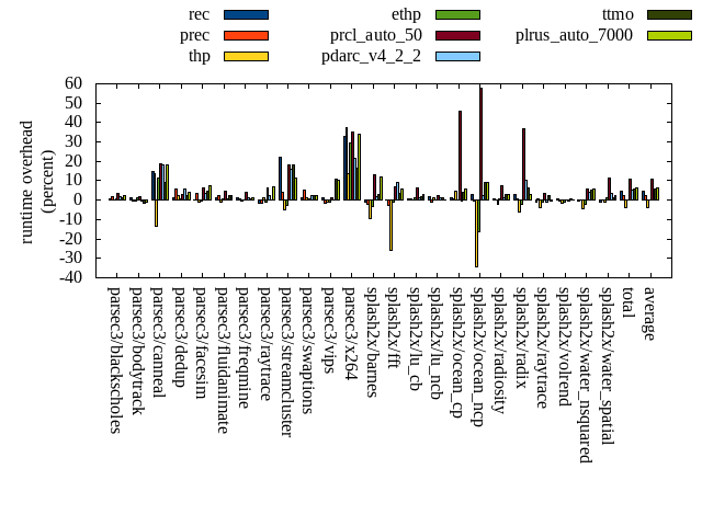 ======= Summary ======= runtime orig rec (overhead) prec (overhead) thp (overhead) ethp (overhead) prcl_auto_50 (overhead) pdarc_v4_2_2 (overhead) ttmo (overhead) plrus_auto_7000 (overhead) parsec3/blackscholes 139.580 140.783 (0.86) 142.134 (1.83) 139.372 (-0.15) 140.622 (0.75) 144.327 (3.40) 142.362 (1.99) 141.406 (1.31) 142.866 (2.35) parsec3/bodytrack 125.980 127.273 (1.03) 125.455 (-0.42) 125.582 (-0.32) 127.581 (1.27) 128.172 (1.74) 125.452 (-0.42) 124.211 (-1.40) 124.841 (-0.90) parsec3/canneal 195.881 224.587 (14.65) 222.670 (13.68) 169.012 (-13.72) 217.986 (11.28) 233.086 (18.99) 231.465 (18.17) 213.790 (9.14) 231.257 (18.06) parsec3/dedup 18.092 18.346 (1.40) 19.176 (5.99) 18.494 (2.22) 18.264 (0.95) 18.666 (3.17) 19.148 (5.84) 18.525 (2.39) 18.777 (3.79) parsec3/facesim 342.837 342.765 (-0.02) 354.723 (3.47) 338.456 (-1.28) 340.555 (-0.67) 363.587 (6.05) 354.160 (3.30) 358.309 (4.51) 367.969 (7.33) parsec3/fluidanimate 329.617 334.152 (1.38) 337.767 (2.47) 326.296 (-1.01) 332.447 (0.86) 344.884 (4.63) 331.723 (0.64) 337.500 (2.39) 337.028 (2.25) parsec3/freqmine 436.093 442.071 (1.37) 439.344 (0.75) 435.028 (-0.24) 435.739 (-0.08) 453.214 (3.93) 440.882 (1.10) 440.064 (0.91) 441.297 (1.19) parsec3/raytrace 185.542 182.435 (-1.67) 182.639 (-1.56) 188.363 (1.52) 183.525 (-1.09) 197.425 (6.40) 189.475 (2.12) 185.565 (0.01) 198.839 (7.17) parsec3/streamcluster 589.302 719.257 (22.05) 611.679 (3.80) 558.975 (-5.15) 573.263 (-2.72) 697.392 (18.34) 682.278 (15.78) 697.771 (18.41) 655.836 (11.29) parsec3/swaptions 219.780 222.144 (1.08) 230.889 (5.05) 222.159 (1.08) 221.105 (0.60) 221.371 (0.72) 225.566 (2.63) 225.273 (2.50) 224.725 (2.25) parsec3/vips 89.652 90.633 (1.09) 88.305 (-1.50) 88.952 (-0.78) 88.657 (-1.11) 90.882 (1.37) 89.887 (0.26) 99.407 (10.88) 99.092 (10.53) parsec3/x264 94.290 125.384 (32.98) 129.397 (37.23) 107.156 (13.65) 122.030 (29.42) 127.238 (34.94) 114.475 (21.41) 109.825 (16.48) 126.353 (34.00) splash2x/barnes 131.861 130.315 (-1.17) 128.948 (-2.21) 119.092 (-9.68) 127.609 (-3.22) 148.803 (12.85) 134.497 (2.00) 135.673 (2.89) 147.373 (11.76) splash2x/fft 63.700 63.932 (0.36) 62.051 (-2.59) 47.290 (-25.76) 63.043 (-1.03) 68.144 (6.98) 69.618 (9.29) 65.921 (3.49) 67.193 (5.48) splash2x/lu_cb 132.251 133.131 (0.67) 133.037 (0.59) 132.233 (-0.01) 133.655 (1.06) 140.514 (6.25) 133.683 (1.08) 134.781 (1.91) 135.972 (2.81) splash2x/lu_ncb 152.839 155.532 (1.76) 151.011 (-1.20) 154.688 (1.21) 153.133 (0.19) 156.467 (2.37) 154.982 (1.40) 154.848 (1.31) 153.378 (0.35) splash2x/ocean_cp 80.774 81.665 (1.10) 81.135 (0.45) 84.516 (4.63) 80.958 (0.23) 117.760 (45.79) 80.237 (-0.66) 84.108 (4.13) 85.505 (5.86) splash2x/ocean_ncp 163.071 167.665 (2.82) 162.557 (-0.32) 106.874 (-34.46) 136.330 (-16.40) 256.934 (57.56) 167.151 (2.50) 178.325 (9.35) 178.309 (9.34) splash2x/radiosity 143.574 144.195 (0.43) 143.560 (-0.01) 140.434 (-2.19) 144.378 (0.56) 154.539 (7.64) 145.550 (1.38) 147.962 (3.06) 147.576 (2.79) splash2x/radix 52.279 53.770 (2.85) 52.609 (0.63) 49.053 (-6.17) 51.219 (-2.03) 71.487 (36.74) 57.574 (10.13) 55.613 (6.38) 53.835 (2.98) splash2x/raytrace 140.070 138.353 (-1.23) 140.626 (0.40) 134.791 (-3.77) 138.657 (-1.01) 145.293 (3.73) 138.596 (-1.05) 143.752 (2.63) 139.161 (-0.65) splash2x/volrend 121.495 122.415 (0.76) 120.995 (-0.41) 119.750 (-1.44) 120.595 (-0.74) 121.882 (0.32) 120.851 (-0.53) 122.142 (0.53) 121.627 (0.11) splash2x/water_nsquared 375.801 375.141 (-0.18) 375.282 (-0.14) 358.924 (-4.49) 367.085 (-2.32) 397.936 (5.89) 390.570 (3.93) 394.744 (5.04) 397.514 (5.78) splash2x/water_spatial 136.828 135.479 (-0.99) 136.643 (-0.14) 135.427 (-1.02) 138.608 (1.30) 152.507 (11.46) 141.582 (3.47) 138.724 (1.39) 139.798 (2.17) total 4461.180 4671.400 (4.71) 4572.630 (2.50) 4300.900 (-3.59) 4457.050 (-0.09) 4952.500 (11.01) 4681.770 (4.94) 4708.210 (5.54) 4736.130 (6.16) average 185.883 194.642 (3.47) 190.526 (2.74) 179.204 (-3.64) 185.710 (0.67) 206.354 (12.55) 195.074 (4.41) 196.175 (4.57) 197.339 (6.17) kdamond_cpu_util orig rec (overhead) prec (overhead) thp (overhead) ethp (overhead) prcl_auto_50 (overhead) pdarc_v4_2_2 (overhead) ttmo (overhead) plrus_auto_7000 (overhead) parsec3/blackscholes 0.000 1.584 (1.58) 0.904 (0.90) 0.000 (0.00) 1.558 (1.56) 3.740 (3.74) 4.218 (4.22) 0.000 (0.00) 2.085 (2.08) parsec3/bodytrack 0.000 1.795 (1.79) 0.887 (0.89) 0.000 (0.00) 1.872 (1.87) 3.155 (3.15) 4.553 (4.55) 0.000 (0.00) 2.098 (2.10) parsec3/canneal 0.000 2.214 (2.21) 2.294 (2.29) 0.000 (0.00) 2.144 (2.14) 5.603 (5.60) 6.567 (6.57) 0.000 (0.00) 3.118 (3.12) parsec3/dedup 0.000 1.613 (1.61) 0.926 (0.93) 0.000 (0.00) 1.837 (1.84) 1.866 (1.87) 12.402 (12.40) 0.000 (0.00) 0.679 (0.68) parsec3/facesim 0.000 1.626 (1.63) 1.026 (1.03) 0.000 (0.00) 2.254 (2.25) 3.332 (3.33) 5.082 (5.08) 0.000 (0.00) 1.002 (1.00) parsec3/fluidanimate 0.000 1.469 (1.47) 0.873 (0.87) 0.000 (0.00) 1.394 (1.39) 1.733 (1.73) 5.208 (5.21) 0.000 (0.00) 0.926 (0.93) parsec3/freqmine 0.000 1.387 (1.39) 0.885 (0.89) 0.000 (0.00) 1.485 (1.48) 5.114 (5.11) 5.053 (5.05) 0.000 (0.00) 2.457 (2.46) parsec3/raytrace 0.000 1.596 (1.60) 0.900 (0.90) 0.000 (0.00) 1.681 (1.68) 7.904 (7.90) 5.462 (5.46) 0.000 (0.00) 1.734 (1.73) parsec3/streamcluster 0.000 16.964 (16.96) 9.368 (9.37) 0.000 (0.00) 1.831 (1.83) 16.920 (16.92) 8.496 (8.50) 0.000 (0.00) 7.871 (7.87) parsec3/swaptions 0.000 1.207 (1.21) 0.875 (0.88) 0.000 (0.00) 1.619 (1.62) 1.484 (1.48) 5.158 (5.16) 0.000 (0.00) 1.998 (2.00) parsec3/vips 0.000 5.057 (5.06) 0.880 (0.88) 0.000 (0.00) 1.781 (1.78) 5.617 (5.62) 5.787 (5.79) 0.000 (0.00) 1.771 (1.77) parsec3/x264 0.000 3.840 (3.84) 0.871 (0.87) 0.000 (0.00) 3.595 (3.60) 3.413 (3.41) 4.891 (4.89) 0.000 (0.00) 2.068 (2.07) splash2x/barnes 0.000 1.401 (1.40) 1.075 (1.08) 0.000 (0.00) 1.533 (1.53) 14.697 (14.70) 6.895 (6.90) 0.000 (0.00) 1.597 (1.60) splash2x/fft 0.000 1.727 (1.73) 0.950 (0.95) 0.000 (0.00) 1.803 (1.80) 21.541 (21.54) 6.681 (6.68) 0.000 (0.00) 1.723 (1.72) splash2x/lu_cb 0.000 1.511 (1.51) 