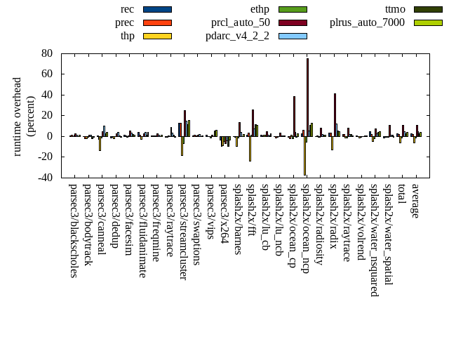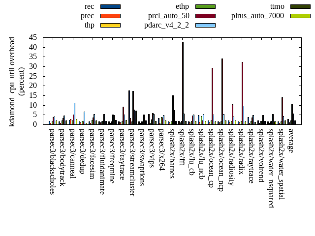 ======= Summary ======= runtime orig rec (overhead) prec (overhead) thp (overhead) ethp (overhead) prcl_auto_50 (overhead) pdarc_v4_2_2 (overhead) ttmo (overhead) plrus_auto_7000 (overhead) parsec3/blackscholes 138.926 139.902 (0.70) 140.457 (1.10) 138.890 (-0.03) 141.241 (1.67) 142.593 (2.64) 140.918 (1.43) 139.251 (0.23) 141.279 (1.69) parsec3/bodytrack 128.540 128.814 (0.21) 126.272 (-1.76) 125.959 (-2.01) 127.902 (-0.50) 130.214 (1.30) 130.430 (1.47) 125.864 (-2.08) 127.640 (-0.70) parsec3/canneal 218.365 219.149 (0.36) 212.848 (-2.53) 188.885 (-13.50) 216.092 (-1.04) 229.315 (5.01) 240.496 (10.14) 224.763 (2.93) 227.672 (4.26) parsec3/dedup 18.416 18.108 (-1.68) 18.306 (-0.60) 18.003 (-2.24) 18.413 (-0.02) 18.941 (2.85) 19.114 (3.79) 18.554 (0.75) 18.274 (-0.77) parsec3/facesim 345.999 351.327 (1.54) 347.626 (0.47) 342.899 (-0.90) 347.249 (0.36) 363.781 (5.14) 358.446 (3.60) 353.007 (2.03) 350.503 (1.30) parsec3/fluidanimate 331.104 345.371 (4.31) 335.801 (1.42) 323.208 (-2.38) 331.352 (0.08) 339.801 (2.63) 344.258 (3.97) 336.333 (1.58) 344.555 (4.06) parsec3/freqmine 434.071 436.917 (0.66) 436.275 (0.51) 435.943 (0.43) 435.981 (0.44) 445.173 (2.56) 440.524 (1.49) 435.273 (0.28) 439.773 (1.31) parsec3/raytrace 184.687 183.230 (-0.79) 183.505 (-0.64) 186.039 (0.73) 184.988 (0.16) 201.340 (9.02) 191.282 (3.57) 186.608 (1.04) 183.844 (-0.46) parsec3/streamcluster 631.428 711.002 (12.60) 712.598 (12.85) 515.145 (-18.42) 587.321 (-6.99) 788.901 (24.94) 724.552 (14.75) 706.214 (11.84) 729.264 (15.49) parsec3/swaptions 220.074 222.308 (1.02) 223.595 (1.60) 221.841 (0.80) 220.920 (0.38) 222.738 (1.21) 223.896 (1.74) 220.729 (0.30) 222.072 (0.91) parsec3/vips 89.328 90.660 (1.49) 89.139 (-0.21) 89.257 (-0.08) 87.952 (-1.54) 90.460 (1.27) 89.316 (-0.01) 93.888 (5.10) 94.487 (5.77) parsec3/x264 128.849 124.533 (-3.35) 116.840 (-9.32) 117.721 (-8.64) 122.866 (-4.64) 119.699 (-7.10) 123.707 (-3.99) 116.977 (-9.21) 124.199 (-3.61) splash2x/barnes 130.925 130.734 (-0.15) 130.298 (-0.48) 118.669 (-9.36) 129.417 (-1.15) 148.483 (13.41) 136.181 (4.01) 130.782 (-0.11) 133.286 (1.80) splash2x/fft 61.409 62.310 (1.47) 63.644 (3.64) 46.730 (-23.90) 62.325 (1.49) 77.248 (25.79) 65.895 (7.31) 68.468 (11.50) 67.940 (10.64) splash2x/lu_cb 132.352 133.961 (1.22) 133.680 (1.00) 134.297 (1.47) 134.534 (1.65) 138.481 (4.63) 134.531 (1.65) 133.271 (0.69) 135.644 (2.49) splash2x/lu_ncb 152.578 152.101 (-0.31) 150.598 (-1.30) 151.670 (-0.59) 152.447 (-0.09) 157.699 (3.36) 153.661 (0.71) 153.222 (0.42) 153.757 (0.77) splash2x/ocean_cp 82.393 81.971 (-0.51) 80.739 (-2.01) 83.753 (1.65) 80.618 (-2.15) 114.508 (38.98) 85.592 (3.88) 81.708 (-0.83) 84.654 (2.74) splash2x/ocean_ncp 162.795 167.212 (2.71) 172.552 (5.99) 102.237 (-37.20) 153.716 (-5.58) 284.847 (74.97) 171.722 (5.48) 180.573 (10.92) 183.463 (12.70) splash2x/radiosity 142.921 143.289 (0.26) 143.422 (0.35) 141.526 (-0.98) 142.434 (-0.34) 154.257 (7.93) 146.228 (2.31) 144.562 (1.15) 144.684 (1.23) splash2x/radix 51.131 52.976 (3.61) 52.857 (3.37) 44.627 (-12.72) 51.062 (-0.14) 72.213 (41.23) 57.308 (12.08) 53.834 (5.28) 53.466 (4.56) splash2x/raytrace 136.188 138.799 (1.92) 138.764 (1.89) 134.458 (-1.27) 134.713 (-1.08) 147.155 (8.05) 138.918 (2.00) 138.718 (1.86) 137.086 (0.66) splash2x/volrend 120.679 121.281 (0.50) 120.859 (0.15) 119.239 (-1.19) 119.943 (-0.61) 120.349 (-0.27) 120.471 (-0.17) 121.483 (0.67) 121.705 (0.85) splash2x/water_nsquared 373.196 390.814 (4.72) 381.002 (2.09) 355.713 (-4.68) 366.555 (-1.78) 401.749 (7.65) 382.410 (2.47) 387.552 (3.85) 391.560 (4.92) splash2x/water_spatial 137.218 135.492 (-1.26) 136.236 (-0.72) 136.085 (-0.83) 136.622 (-0.43) 152.306 (11.00) 139.338 (1.54) 138.837 (1.18) 136.616 (-0.44) total 4553.590 4682.250 (2.83) 4647.920 (2.07) 4272.800 (-6.17) 4486.660 (-1.47) 5062.260 (11.17) 4759.190 (4.52) 4690.460 (3.01) 4747.410 (4.26) average 189.733 195.094 (1.30) 193.663 (0.70) 178.033 (-5.66) 186.944 (-0.91) 210.928 (12.01) 198.300 (3.55) 195.436 (2.14) 197.809 (3.01) kdamond_cpu_util orig rec (overhead) prec (overhead) thp (overhead) ethp (overhead) prcl_auto_50 (overhead) pdarc_v4_2_2 (overhead) ttmo (overhead) plrus_auto_7000 (overhead) parsec3/blackscholes 0.000 1.782 (1.78) 0.876 (0.88) 0.000 (0.00) 1.538 (1.54) 3.885 (3.89) 3.992 (3.99) 0.000 (0.00) 2.157 (2.16) parsec3/bodytrack 0.000 1.622 (1.62) 0.817 (0.82) 0.000 (0.00) 2.082 (2.08) 3.354 (3.35) 4.494 (4.49) 0.000 (0.00) 2.030 (2.03) parsec3/canneal 0.000 2.294 (2.29) 2.819 (2.82) 0.000 (0.00) 2.033 (2.03) 5.201 (5.20) 11.294 (11.29) 0.000 (0.00) 2.886 (2.89) parsec3/dedup 0.000 1.535 (1.54) 0.891 (0.89) 0.000 (0.00) 1.813 (1.81) 1.646 (1.65) 6.729 (6.73) 0.000 (0.00) 0.873 (0.87) parsec3/facesim 0.000 1.603 (1.60) 0.881 (0.88) 0.000 (0.00) 2.220 (2.22) 3.545 (3.55) 5.225 (5.22) 0.000 (0.00) 2.141 (2.14) parsec3/fluidanimate 0.000 1.560 (1.56) 0.906 (0.91) 0.000 (0.00) 1.493 (1.49) 1.880 (1.88) 5.221 (5.22) 0.000 (0.00) 1.779 (1.78) parsec3/freqmine 0.000 1.475 (1.47) 0.879 (0.88) 0.000 (0.00) 1.521 (1.52) 5.065 (5.06) 4.825 (4.83) 0.000 (0.00) 2.375 (2.37) parsec3/raytrace 0.000 1.506 (1.51) 0.895 (0.89) 0.000 (0.00) 1.499 (1.50) 9.170 (9.17) 5.134 (5.13) 0.000 (0.00) 2.268 (2.27) parsec3/streamcluster 0.000 17.425 (17.43) 3.281 (3.28) 0.000 (0.00) 1.592 (1.59) 17.295 (17.29) 7.550 (7.55) 0.000 (0.00) 7.100 (7.10) parsec3/swaptions 0.000 1.411 (1.41) 0.870 (0.87) 0.000 (0.00) 1.650 (1.65) 1.512 (1.51) 5.108 (5.11) 0.000 (0.00) 1.950 (1.95) parsec3/vips 0.000 5.420 (5.42) 0.816 (0.82) 0.000 (0.00) 2.533 (2.53) 5.846 (5.85) 5.268 (5.27) 0.000 (0.00) 1.830 (1.83) parsec3/x264 0.000 3.264 (3.26) 0.870 (0.87) 0.000 (0.00) 3.854 (3.85) 3.664 (3.66) 4.900 (4.90) 0.000 (0.00) 1.994 (1.99) splash2x/barnes 0.000 1.433 (1.43) 1.017 (1.02) 0.000 (0.00) 1.520 (1.52) 14.890 (14.89) 7.477 (7.48) 0.000 (0.00) 1.849 (1.85) splash2x/fft 0.000 1.783 (1.78) 0.992 (0.99) 0.000 (0.00) 1.820 (1.82) 42.632 (42.63) 5.488 (5.49) 0.000 (0.00) 1.801 (1.80) splash2x/lu_cb 0.000 1.625 (1