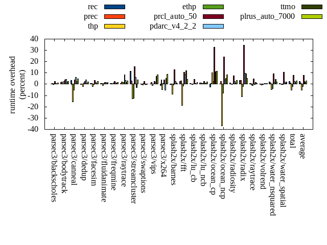 ======= Summary ======= runtime orig rec (overhead) prec (overhead) thp (overhead) ethp (overhead) prcl_auto_50 (overhead) pdarc_v4_2_2 (overhead) ttmo (overhead) plrus_auto_7000 (overhead) parsec3/blackscholes 139.325 139.612 (0.21) 140.514 (0.85) 138.963 (-0.26) 140.240 (0.66) 142.640 (2.38) 140.352 (0.74) 139.947 (0.45) 140.807 (1.06) parsec3/bodytrack 124.642 126.793 (1.73) 127.015 (1.90) 124.997 (0.28) 127.683 (2.44) 129.190 (3.65) 129.870 (4.19) 127.208 (2.06) 127.706 (2.46) parsec3/canneal 217.694 225.220 (3.46) 216.650 (-0.48) 183.891 (-15.53) 206.181 (-5.29) 225.601 (3.63) 231.163 (6.19) 222.867 (2.38) 227.777 (4.63) parsec3/dedup 18.129 18.049 (-0.44) 18.154 (0.14) 17.791 (-1.87) 18.296 (0.92) 18.618 (2.69) 18.786 (3.62) 18.234 (0.58) 18.458 (1.81) parsec3/facesim 347.149 350.165 (0.87) 349.990 (0.82) 339.628 (-2.17) 346.877 (-0.08) 359.669 (3.61) 353.380 (1.79) 349.382 (0.64) 355.507 (2.41) parsec3/fluidanimate 333.084 335.620 (0.76) 336.064 (0.89) 329.634 (-1.04) 335.151 (0.62) 338.036 (1.49) 338.198 (1.54) 335.805 (0.82) 338.629 (1.66) parsec3/freqmine 434.109 436.515 (0.55) 437.421 (0.76) 434.343 (0.05) 439.045 (1.14) 445.872 (2.71) 439.063 (1.14) 439.174 (1.17) 440.097 (1.38) parsec3/raytrace 181.881 183.030 (0.63) 185.951 (2.24) 184.551 (1.47) 184.455 (1.42) 197.472 (8.57) 188.267 (3.51) 184.948 (1.69) 186.854 (2.73) parsec3/streamcluster 635.607 709.273 (11.59) 655.218 (3.09) 553.216 (-12.96) 556.842 (-12.39) 733.319 (15.37) 673.738 (6.00) 615.734 (-3.13) 660.279 (3.88) parsec3/swaptions 221.778 221.960 (0.08) 221.102 (-0.31) 220.693 (-0.49) 223.134 (0.61) 227.263 (2.47) 221.652 (-0.06) 221.155 (-0.28) 222.327 (0.25) parsec3/vips 88.033 88.422 (0.44) 89.227 (1.36) 87.159 (-0.99) 88.395 (0.41) 90.087 (2.33) 89.492 (1.66) 94.124 (6.92) 95.579 (8.57) parsec3/x264 114.444 113.378 (-0.93) 118.920 (3.91) 109.086 (-4.68) 115.123 (0.59) 118.927 (3.92) 108.378 (-5.30) 120.460 (5.26) 124.629 (8.90) splash2x/barnes 131.180 131.076 (-0.08) 131.079 (-0.08) 119.494 (-8.91) 130.023 (-0.88) 148.000 (12.82) 134.257 (2.35) 132.851 (1.27) 131.747 (0.43) splash2x/fft 61.301 62.846 (2.52) 63.131 (2.99) 49.679 (-18.96) 60.394 (-1.48) 67.913 (10.79) 66.534 (8.54) 68.642 (11.98) 64.040 (4.47) splash2x/lu_cb 133.166 134.029 (0.65) 133.556 (0.29) 132.748 (-0.31) 133.586 (0.32) 138.734 (4.18) 134.226 (0.80) 133.549 (0.29) 135.325 (1.62) splash2x/lu_ncb 150.087 151.480 (0.93) 151.726 (1.09) 150.999 (0.61) 151.347 (0.84) 153.674 (2.39) 151.781 (1.13) 151.186 (0.73) 153.371 (2.19) splash2x/ocean_cp 81.186 79.104 (-2.56) 81.736 (0.68) 89.520 (10.26) 83.197 (2.48) 107.610 (32.55) 82.011 (1.02) 90.154 (11.05) 90.389 (11.34) splash2x/ocean_ncp 164.769 165.035 (0.16) 168.918 (2.52) 104.007 (-36.88) 151.722 (-7.92) 204.822 (24.31) 171.290 (3.96) 173.321 (5.19) 178.729 (8.47) splash2x/radiosity 142.435 143.848 (0.99) 142.761 (0.23) 142.400 (-0.02) 142.932 (0.35) 153.196 (7.56) 146.015 (2.51) 143.748 (0.92) 147.250 (3.38) splash2x/radix 50.529 52.301 (3.51) 52.326 (3.56) 44.843 (-11.25) 49.583 (-1.87) 67.897 (34.37) 55.379 (9.60) 55.170 (9.18) 53.046 (4.98) splash2x/raytrace 135.709 136.575 (0.64) 136.547 (0.62) 134.768 (-0.69) 133.996 (-1.26) 142.006 (4.64) 135.528 (-0.13) 137.746 (1.50) 136.794 (0.80) splash2x/volrend 120.991 121.425 (0.36) 120.950 (-0.03) 120.252 (-0.61) 120.725 (-0.22) 121.363 (0.31) 121.705 (0.59) 121.000 (0.01) 122.028 (0.86) splash2x/water_nsquared 374.888 381.883 (1.87) 379.761 (1.30) 356.345 (-4.95) 361.104 (-3.68) 410.178 (9.41) 381.460 (1.75) 390.811 (4.25) 382.006 (1.90) splash2x/water_spatial 134.225 135.203 (0.73) 134.754 (0.39) 134.173 (-0.04) 133.966 (-0.19) 148.506 (10.64) 136.910 (2.00) 135.600 (1.02) 136.800 (1.92) total 4536.340 4642.840 (2.35) 4593.490 (1.26) 4303.180 (-5.14) 4434.010 (-2.26) 4890.590 (7.81) 4649.440 (2.49) 4602.810 (1.47) 4670.180 (2.95) average 189.014 193.452 (1.19) 191.395 (1.20) 179.299 (-4.58) 184.750 (-0.94) 203.775 (8.62) 193.727 (2.46) 191.784 (2.75) 194.591 (3.42) kdamond_cpu_util orig rec (overhead) prec (overhead) thp (overhead) ethp (overhead) prcl_auto_50 (overhead) pdarc_v4_2_2 (overhead) ttmo (overhead) plrus_auto_7000 (overhead) parsec3/blackscholes 0.000 1.755 (1.75) 0.908 (0.91) 0.000 (0.00) 1.513 (1.51) 3.832 (3.83) 4.240 (4.24) 0.000 (0.00) 2.192 (2.19) parsec3/bodytrack 0.000 1.928 (1.93) 0.864 (0.86) 0.000 (0.00) 1.729 (1.73) 3.244 (3.24) 4.461 (4.46) 0.000 (0.00) 2.087 (2.09) parsec3/canneal 0.000 2.342 (2.34) 3.856 (3.86) 0.000 (0.00) 1.929 (1.93) 5.084 (5.08) 6.028 (6.03) 0.000 (0.00) 2.089 (2.09) parsec3/dedup 0.000 1.700 (1.70) 0.917 (0.92) 0.000 (0.00) 1.936 (1.94) 1.638 (1.64) 7.760 (7.76) 0.000 (0.00) 0.893 (0.89) parsec3/facesim 0.000 1.631 (1.63) 0.889 (0.89) 0.000 (0.00) 2.368 (2.37) 3.938 (3.94) 5.195 (5.20) 0.000 (0.00) 2.217 (2.22) parsec3/fluidanimate 0.000 1.482 (1.48) 0.885 (0.88) 0.000 (0.00) 1.456 (1.46) 1.763 (1.76) 5.243 (5.24) 0.000 (0.00) 1.656 (1.66) parsec3/freqmine 0.000 1.512 (1.51) 0.897 (0.90) 0.000 (0.00) 1.646 (1.65) 5.073 (5.07) 4.859 (4.86) 0.000 (0.00) 2.190 (2.19) parsec3/raytrace 0.000 1.617 (1.62) 0.911 (0.91) 0.000 (0.00) 1.581 (1.58) 8.484 (8.48) 5.400 (5.40) 0.000 (0.00) 2.122 (2.12) parsec3/streamcluster 0.000 17.289 (17.29) 5.042 (5.04) 0.000 (0.00) 1.758 (1.76) 17.274 (17.27) 7.436 (7.44) 0.000 (0.00) 3.244 (3.24) parsec3/swaptions 0.000 1.269 (1.27) 0.892 (0.89) 0.000 (0.00) 2.163 (2.16) 1.538 (1.54) 5.090 (5.09) 0.000 (0.00) 1.862 (1.86) parsec3/vips 0.000 5.037 (5.04) 0.861 (0.86) 0.000 (0.00) 2.031 (2.03) 5.519 (5.52) 5.532 (5.53) 0.000 (0.00) 1.900 (1.90) parsec3/x264 0.000 3.336 (3.34) 0.873 (0.87) 0.000 (0.00) 3.533 (3.53) 3.403 (3.40) 4.855 (4.86) 0.000 (0.00) 2.028 (2.03) splash2x/barnes 0.000 1.420 (1.42) 0.981 (0.98) 0.000 (0.00) 1.720 (1.72) 14.834 (14.83) 7.443 (7.44) 0.000 (0.00) 1.863 (1.86) splash2x/fft 0.000 1.817 (1.82) 1.014 (1.01) 0.000 (0.00) 1.798 (1.80) 21.896 (21.90) 6.829 (6.83) 0.000 (0.00) 1.864 (1.86) splash2x/lu_cb 0.000 1.656 (1.66) 0.876 (0.88) 0.000 (0.00) 1