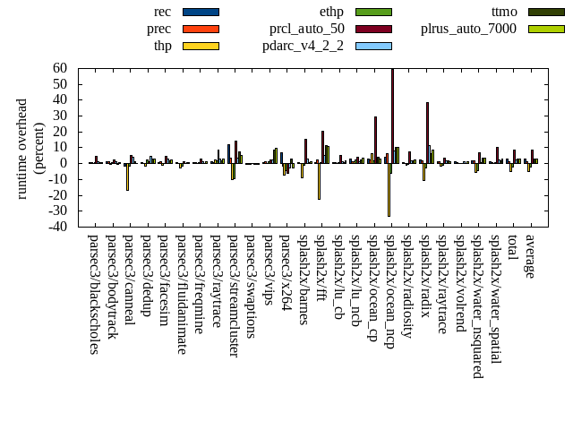 ======= Summary ======= runtime orig rec (overhead) prec (overhead) thp (overhead) ethp (overhead) prcl_auto_50 (overhead) pdarc_v4_2_2 (overhead) ttmo (overhead) plrus_auto_7000 (overhead) parsec3/blackscholes 139.210 140.336 (0.81) 140.412 (0.86) 139.237 (0.02) 140.022 (0.58) 145.291 (4.37) 140.948 (1.25) 140.147 (0.67) 140.475 (0.91) parsec3/bodytrack 126.237 127.796 (1.23) 127.462 (0.97) 125.388 (-0.67) 127.101 (0.68) 129.192 (2.34) 127.989 (1.39) 125.569 (-0.53) 127.161 (0.73) parsec3/canneal 219.255 215.249 (-1.83) 218.685 (-0.26) 182.960 (-16.55) 215.891 (-1.53) 230.892 (5.31) 228.729 (4.32) 221.362 (0.96) 219.586 (0.15) parsec3/dedup 18.034 18.194 (0.89) 18.030 (-0.02) 17.726 (-1.71) 18.431 (2.20) 18.243 (1.16) 18.905 (4.83) 18.569 (2.97) 18.593 (3.10) parsec3/facesim 346.206 347.779 (0.45) 349.650 (1.00) 343.403 (-0.81) 347.454 (0.36) 361.471 (4.41) 355.815 (2.78) 352.234 (1.74) 354.149 (2.29) parsec3/fluidanimate 336.190 338.864 (0.80) 335.796 (-0.12) 326.297 (-2.94) 331.347 (-1.44) 340.697 (1.34) 335.648 (-0.16) 339.199 (0.90) 337.797 (0.48) parsec3/freqmine 435.156 438.342 (0.73) 438.925 (0.87) 436.744 (0.36) 437.406 (0.52) 448.514 (3.07) 440.833 (1.30) 436.290 (0.26) 439.358 (0.97) parsec3/raytrace 182.848 185.280 (1.33) 184.114 (0.69) 187.400 (2.49) 185.958 (1.70) 198.137 (8.36) 188.334 (3.00) 185.699 (1.56) 187.880 (2.75) parsec3/streamcluster 645.569 721.780 (11.81) 668.775 (3.59) 581.593 (-9.91) 584.015 (-9.53) 738.952 (14.47) 668.011 (3.48) 695.271 (7.70) 677.766 (4.99) parsec3/swaptions 223.821 222.447 (-0.61) 222.942 (-0.39) 222.693 (-0.50) 224.319 (0.22) 223.779 (-0.02) 222.336 (-0.66) 223.077 (-0.33) 222.778 (-0.47) parsec3/vips 87.916 88.280 (0.41) 89.042 (1.28) 87.798 (-0.13) 88.993 (1.23) 90.201 (2.60) 90.141 (2.53) 95.353 (8.46) 96.247 (9.48) parsec3/x264 117.815 126.065 (7.00) 115.759 (-1.75) 109.607 (-6.97) 112.741 (-4.31) 110.303 (-6.38) 114.540 (-2.78) 121.069 (2.76) 114.888 (-2.48) splash2x/barnes 131.164 131.698 (0.41) 131.115 (-0.04) 119.375 (-8.99) 129.642 (-1.16) 151.549 (15.54) 135.231 (3.10) 132.351 (0.91) 132.823 (1.27) splash2x/fft 61.902 62.353 (0.73) 63.308 (2.27) 48.093 (-22.31) 62.149 (0.40) 74.514 (20.38) 65.032 (5.06) 68.986 (11.45) 68.566 (10.77) splash2x/lu_cb 132.840 133.923 (0.82) 133.735 (0.67) 132.809 (-0.02) 133.707 (0.65) 139.535 (5.04) 134.169 (1.00) 134.020 (0.89) 135.442 (1.96) splash2x/lu_ncb 149.561 154.374 (3.22) 151.285 (1.15) 151.462 (1.27) 153.072 (2.35) 155.405 (3.91) 151.458 (1.27) 152.935 (2.26) 154.734 (3.46) splash2x/ocean_cp 80.379 82.520 (2.66) 82.234 (2.31) 85.415 (6.27) 81.725 (1.68) 103.926 (29.30) 81.868 (1.85) 83.562 (3.96) 82.957 (3.21) splash2x/ocean_ncp 159.388 165.446 (3.80) 169.069 (6.07) 106.815 (-32.98) 149.268 (-6.35) 253.769 (59.21) 172.512 (8.23) 175.615 (10.18) 176.031 (10.44) splash2x/radiosity 143.460 144.527 (0.74) 143.335 (-0.09) 141.853 (-1.12) 143.070 (-0.27) 154.144 (7.45) 146.371 (2.03) 145.809 (1.64) 146.738 (2.28) splash2x/radix 50.770 51.894 (2.21) 51.736 (1.90) 45.509 (-10.36) 49.439 (-2.62) 70.418 (38.70) 56.607 (11.50) 53.933 (6.23) 55.201 (8.73) splash2x/raytrace 135.349 137.393 (1.51) 136.815 (1.08) 133.319 (-1.50) 133.989 (-1.00) 139.816 (3.30) 137.656 (1.70) 137.969 (1.94) 137.140 (1.32) splash2x/volrend 120.522 121.784 (1.05) 121.015 (0.41) 120.362 (-0.13) 120.592 (0.06) 120.895 (0.31) 121.983 (1.21) 120.883 (0.30) 121.986 (1.21) splash2x/water_nsquared 377.923 385.059 (1.89) 385.346 (1.96) 355.944 (-5.82) 361.725 (-4.29) 403.242 (6.70) 379.628 (0.45) 391.264 (3.53) 390.932 (3.44) splash2x/water_spatial 134.346 135.874 (1.14) 135.273 (0.69) 134.848 (0.37) 135.483 (0.85) 148.532 (10.56) 137.477 (2.33) 136.425 (1.55) 138.371 (3.00) total 4555.870 4677.250 (2.66) 4613.880 (1.27) 4336.650 (-4.81) 4467.550 (-1.94) 4951.420 (8.68) 4652.220 (2.11) 4687.590 (2.89) 4677.610 (2.67) average 189.828 194.885 (1.80) 192.245 (1.05) 180.694 (-4.69) 186.148 (-0.79) 206.309 (10.06) 193.843 (2.54) 195.316 (3.00) 194.900 (3.08) kdamond_cpu_util orig rec (overhead) prec (overhead) thp (overhead) ethp (overhead) prcl_auto_50 (overhead) pdarc_v4_2_2 (overhead) ttmo (overhead) plrus_auto_7000 (overhead) parsec3/blackscholes 0.000 1.655 (1.66) 0.881 (0.88) 0.000 (0.00) 1.468 (1.47) 4.905 (4.91) 3.821 (3.82) 0.000 (0.00) 2.198 (2.20) parsec3/bodytrack 0.000 2.151 (2.15) 0.862 (0.86) 0.000 (0.00) 2.056 (2.06) 3.227 (3.23) 4.527 (4.53) 0.000 (0.00) 2.100 (2.10) parsec3/canneal 0.000 2.343 (2.34) 2.519 (2.52) 0.000 (0.00) 2.112 (2.11) 5.299 (5.30) 5.780 (5.78) 0.000 (0.00) 3.931 (3.93) parsec3/dedup 0.000 1.880 (1.88) 0.932 (0.93) 0.000 (0.00) 1.648 (1.65) 1.776 (1.78) 6.896 (6.90) 0.000 (0.00) 0.869 (0.87) parsec3/facesim 0.000 1.669 (1.67) 0.870 (0.87) 0.000 (0.00) 2.277 (2.28) 2.981 (2.98) 5.234 (5.23) 0.000 (0.00) 1.985 (1.99) parsec3/fluidanimate 0.000 1.559 (1.56) 0.886 (0.89) 0.000 (0.00) 1.553 (1.55) 1.785 (1.79) 5.173 (5.17) 0.000 (0.00) 1.841 (1.84) parsec3/freqmine 0.000 1.496 (1.50) 0.896 (0.90) 0.000 (0.00) 1.631 (1.63) 5.139 (5.14) 4.888 (4.89) 0.000 (0.00) 2.365 (2.37) parsec3/raytrace 0.000 1.587 (1.59) 0.900 (0.90) 0.000 (0.00) 1.625 (1.62) 8.397 (8.40) 4.758 (4.76) 0.000 (0.00) 2.189 (2.19) parsec3/streamcluster 0.000 17.001 (17.00) 8.009 (8.01) 0.000 (0.00) 1.472 (1.47) 17.218 (17.22) 8.035 (8.03) 0.000 (0.00) 5.037 (5.04) parsec3/swaptions 0.000 1.516 (1.52) 0.897 (0.90) 0.000 (0.00) 2.001 (2.00) 1.488 (1.49) 5.097 (5.10) 0.000 (0.00) 1.687 (1.69) parsec3/vips 0.000 4.252 (4.25) 0.829 (0.83) 0.000 (0.00) 1.984 (1.98) 5.485 (5.49) 5.327 (5.33) 0.000 (0.00) 1.876 (1.88) parsec3/x264 0.000 2.868 (2.87) 0.879 (0.88) 0.000 (0.00) 3.848 (3.85) 3.554 (3.55) 4.694 (4.69) 0.000 (0.00) 2.063 (2.06) splash2x/barnes 0.000 1.386 (1.39) 0.946 (0.95) 0.000 (0.00) 1.614 (1.61) 16.385 (16.38) 7.230 (7.23) 0.000 (0.00) 1.950 (1.95) splash2x/fft 0.000 1.771 (1.77) 0.988 (0.99) 0.000 (0.00) 1.806 (1.81) 32.075 (32.08) 4.949 (4.95) 0.000 (0.00) 1.841 (1.84) splash2x/lu_cb 0.000 1.563 (1.56) 0.868 (0.87) 0.000 (0.00