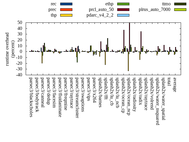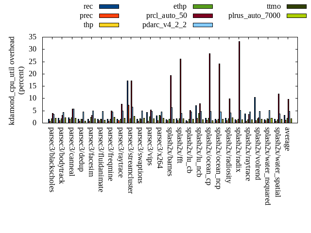 ======= Summary ======= runtime orig rec (overhead) prec (overhead) thp (overhead) ethp (overhead) prcl_auto_50 (overhead) pdarc_v4_2_2 (overhead) ttmo (overhead) plrus_auto_7000 (overhead) parsec3/blackscholes 139.349 140.302 (0.68) 140.095 (0.54) 139.759 (0.29) 140.432 (0.78) 143.236 (2.79) 140.653 (0.94) 140.259 (0.65) 141.493 (1.54) parsec3/bodytrack 124.905 126.617 (1.37) 125.778 (0.70) 124.839 (-0.05) 124.821 (-0.07) 126.959 (1.64) 125.919 (0.81) 124.359 (-0.44) 125.933 (0.82) parsec3/canneal 212.467 226.397 (6.56) 210.121 (-1.10) 170.419 (-19.79) 198.326 (-6.66) 235.360 (10.77) 230.523 (8.50) 244.032 (14.86) 229.941 (8.22) parsec3/dedup 18.070 18.366 (1.64) 18.325 (1.41) 18.384 (1.74) 18.668 (3.31) 18.530 (2.55) 18.591 (2.89) 18.574 (2.79) 18.339 (1.49) parsec3/facesim 344.031 346.504 (0.72) 343.568 (-0.13) 335.443 (-2.50) 340.984 (-0.89) 360.806 (4.88) 351.768 (2.25) 354.488 (3.04) 350.550 (1.89) parsec3/fluidanimate 337.026 333.484 (-1.05) 333.073 (-1.17) 326.491 (-3.13) 329.065 (-2.36) 336.205 (-0.24) 333.103 (-1.16) 337.618 (0.18) 337.618 (0.18) parsec3/freqmine 436.521 438.931 (0.55) 437.959 (0.33) 439.377 (0.65) 437.749 (0.28) 449.859 (3.06) 442.010 (1.26) 439.664 (0.72) 441.238 (1.08) parsec3/raytrace 181.118 184.018 (1.60) 183.360 (1.24) 188.712 (4.19) 182.724 (0.89) 195.511 (7.95) 187.441 (3.49) 185.140 (2.22) 185.840 (2.61) parsec3/streamcluster 637.876 676.539 (6.06) 676.332 (6.03) 579.898 (-9.09) 520.828 (-18.35) 693.696 (8.75) 701.516 (9.98) 664.980 (4.25) 624.096 (-2.16) parsec3/swaptions 222.058 222.914 (0.39) 222.053 (-0.00) 225.530 (1.56) 222.936 (0.40) 223.040 (0.44) 223.964 (0.86) 223.369 (0.59) 224.855 (1.26) parsec3/vips 89.458 88.965 (-0.55) 88.596 (-0.96) 87.638 (-2.03) 88.636 (-0.92) 90.249 (0.88) 89.095 (-0.41) 98.828 (10.48) 98.546 (10.16) parsec3/x264 121.579 123.398 (1.50) 113.751 (-6.44) 116.011 (-4.58) 116.365 (-4.29) 121.045 (-0.44) 120.731 (-0.70) 115.846 (-4.72) 124.236 (2.19) splash2x/barnes 130.362 131.172 (0.62) 131.357 (0.76) 119.648 (-8.22) 128.232 (-1.63) 152.789 (17.20) 135.970 (4.30) 132.837 (1.90) 132.381 (1.55) splash2x/fft 60.420 62.208 (2.96) 61.746 (2.19) 47.050 (-22.13) 60.780 (0.60) 67.581 (11.85) 63.785 (5.57) 74.364 (23.08) 65.237 (7.97) splash2x/lu_cb 133.087 133.160 (0.05) 133.667 (0.44) 133.183 (0.07) 133.035 (-0.04) 137.581 (3.38) 134.667 (1.19) 134.161 (0.81) 134.519 (1.08) splash2x/lu_ncb 152.441 151.468 (-0.64) 150.964 (-0.97) 152.856 (0.27) 150.981 (-0.96) 155.491 (2.00) 153.194 (0.49) 154.452 (1.32) 156.320 (2.54) splash2x/ocean_cp 80.917 79.142 (-2.19) 80.397 (-0.64) 84.225 (4.09) 78.748 (-2.68) 110.889 (37.04) 81.602 (0.85) 85.989 (6.27) 88.410 (9.26) splash2x/ocean_ncp 159.176 168.122 (5.62) 165.323 (3.86) 106.687 (-32.98) 153.024 (-3.86) 238.174 (49.63) 171.443 (7.71) 177.899 (11.76) 170.557 (7.15) splash2x/radiosity 143.800 142.531 (-0.88) 142.591 (-0.84) 142.136 (-1.16) 143.986 (0.13) 155.083 (7.85) 146.194 (1.67) 145.569 (1.23) 147.152 (2.33) splash2x/radix 51.363 51.169 (-0.38) 51.174 (-0.37) 44.289 (-13.77) 49.368 (-3.88) 69.133 (34.60) 54.409 (5.93) 54.609 (6.32) 56.088 (9.20) splash2x/raytrace 136.750 137.594 (0.62) 137.598 (0.62) 134.918 (-1.34) 132.852 (-2.85) 142.157 (3.95) 135.417 (-0.97) 138.697 (1.42) 139.544 (2.04) splash2x/volrend 120.900 121.630 (0.60) 121.951 (0.87) 120.335 (-0.47) 120.545 (-0.29) 120.967 (0.06) 121.652 (0.62) 121.114 (0.18) 122.543 (1.36) splash2x/water_nsquared 378.006 384.127 (1.62) 382.379 (1.16) 355.116 (-6.06) 364.490 (-3.58) 413.528 (9.40) 382.289 (1.13) 396.963 (5.02) 393.313 (4.05) splash2x/water_spatial 133.754 133.205 (-0.41) 134.437 (0.51) 135.505 (1.31) 134.499 (0.56) 149.028 (11.42) 136.519 (2.07) 135.494 (1.30) 136.886 (2.34) total 4545.450 4621.960 (1.68) 4586.600 (0.91) 4328.460 (-4.77) 4372.080 (-3.81) 4906.900 (7.95) 4682.460 (3.01) 4699.300 (3.38) 4645.650 (2.20) average 189.394 192.582 (1.13) 191.108 (0.33) 180.352 (-4.71) 182.170 (-1.93) 204.454 (9.64) 195.102 (2.47) 195.804 (3.97) 193.569 (3.34) kdamond_cpu_util orig rec (overhead) prec (overhead) thp (overhead) ethp (overhead) prcl_auto_50 (overhead) pdarc_v4_2_2 (overhead) ttmo (overhead) plrus_auto_7000 (overhead) parsec3/blackscholes 0.000 1.657 (1.66) 0.879 (0.88) 0.000 (0.00) 1.729 (1.73) 3.870 (3.87) 3.590 (3.59) 0.000 (0.00) 2.000 (2.00) parsec3/bodytrack 0.000 1.939 (1.94) 1.037 (1.04) 0.000 (0.00) 1.819 (1.82) 3.144 (3.14) 4.331 (4.33) 0.000 (0.00) 2.149 (2.15) parsec3/canneal 0.000 2.258 (2.26) 1.497 (1.50) 0.000 (0.00) 2.118 (2.12) 5.719 (5.72) 5.784 (5.78) 0.000 (0.00) 1.883 (1.88) parsec3/dedup 0.000 1.616 (1.62) 0.865 (0.87) 0.000 (0.00) 1.625 (1.63) 1.545 (1.55) 4.514 (4.51) 0.000 (0.00) 0.838 (0.84) parsec3/facesim 0.000 1.662 (1.66) 0.882 (0.88) 0.000 (0.00) 2.353 (2.35) 3.068 (3.07) 4.970 (4.97) 0.000 (0.00) 1.859 (1.86) parsec3/fluidanimate 0.000 1.589 (1.59) 0.890 (0.89) 0.000 (0.00) 1.569 (1.57) 1.504 (1.50) 4.801 (4.80) 0.000 (0.00) 1.146 (1.15) parsec3/freqmine 0.000 1.627 (1.63) 0.889 (0.89) 0.000 (0.00) 1.550 (1.55) 4.939 (4.94) 4.556 (4.56) 0.000 (0.00) 2.284 (2.28) parsec3/raytrace 0.000 1.560 (1.56) 0.892 (0.89) 0.000 (0.00) 1.610 (1.61) 7.803 (7.80) 4.860 (4.86) 0.000 (0.00) 2.058 (2.06) parsec3/streamcluster 0.000 17.214 (17.21) 7.305 (7.30) 0.000 (0.00) 1.777 (1.78) 17.223 (17.22) 6.603 (6.60) 0.000 (0.00) 2.824 (2.82) parsec3/swaptions 0.000 1.540 (1.54) 0.889 (0.89) 0.000 (0.00) 1.836 (1.84) 1.662 (1.66) 4.857 (4.86) 0.000 (0.00) 1.896 (1.90) parsec3/vips 0.000 4.260 (4.26) 0.852 (0.85) 0.000 (0.00) 2.658 (2.66) 5.247 (5.25) 4.711 (4.71) 0.000 (0.00) 1.872 (1.87) parsec3/x264 0.000 2.953 (2.95) 0.913 (0.91) 0.000 (0.00) 3.219 (3.22) 3.052 (3.05) 4.558 (4.56) 0.000 (0.00) 2.042 (2.04) splash2x/barnes 0.000 1.449 (1.45) 0.940 (0.94) 0.000 (0.00) 1.630 (1.63) 19.323 (19.32) 6.265 (6.26) 0.000 (0.00) 1.644 (1.64) splash2x/fft 0.000 1.792 (1.79) 0.985 (0.99) 0.000 (0.00) 1.713 (1.71) 26.021 (26.02) 3.960 (3.96) 0.000 (0.00) 1.778 (1.78) splash2x/lu_cb 0.000 1.042 (1.04) 0.601 (0.60) 0