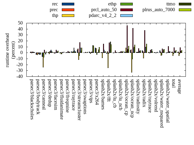 ======= Summary ======= runtime orig rec (overhead) prec (overhead) thp (overhead) ethp (overhead) prcl_auto_50 (overhead) pdarc_v4_2_2 (overhead) ttmo (overhead) plrus_auto_7000 (overhead) parsec3/blackscholes 139.507 140.933 (1.02) 141.578 (1.48) 139.136 (-0.27) 140.187 (0.49) 141.942 (1.75) 141.495 (1.43) 141.147 (1.18) 140.482 (0.70) parsec3/bodytrack 128.464 125.055 (-2.65) 125.461 (-2.34) 124.205 (-3.32) 128.177 (-0.22) 126.225 (-1.74) 125.659 (-2.18) 124.999 (-2.70) 125.115 (-2.61) parsec3/canneal 224.774 210.455 (-6.37) 217.689 (-3.15) 170.564 (-24.12) 207.992 (-7.47) 235.219 (4.65) 225.154 (0.17) 219.064 (-2.54) 228.790 (1.79) parsec3/dedup 18.075 18.155 (0.44) 18.244 (0.93) 17.733 (-1.89) 18.430 (1.96) 18.612 (2.97) 18.889 (4.50) 18.541 (2.58) 18.269 (1.07) parsec3/facesim 344.794 347.645 (0.83) 341.650 (-0.91) 343.199 (-0.46) 343.334 (-0.42) 361.017 (4.71) 351.901 (2.06) 351.484 (1.94) 355.997 (3.25) parsec3/fluidanimate 335.678 334.431 (-0.37) 338.521 (0.85) 329.589 (-1.81) 329.687 (-1.78) 340.257 (1.36) 335.780 (0.03) 335.765 (0.03) 340.545 (1.45) parsec3/freqmine 436.072 437.762 (0.39) 438.944 (0.66) 438.943 (0.66) 437.052 (0.22) 448.286 (2.80) 441.012 (1.13) 438.177 (0.48) 442.644 (1.51) parsec3/raytrace 182.185 185.874 (2.02) 183.672 (0.82) 185.386 (1.76) 186.116 (2.16) 197.278 (8.28) 189.300 (3.90) 186.404 (2.32) 185.664 (1.91) parsec3/streamcluster 624.169 658.317 (5.47) 665.254 (6.58) 551.818 (-11.59) 592.842 (-5.02) 734.293 (17.64) 674.985 (8.14) 644.882 (3.32) 674.424 (8.05) parsec3/swaptions 222.347 222.407 (0.03) 222.525 (0.08) 222.278 (-0.03) 222.398 (0.02) 224.473 (0.96) 222.893 (0.25) 223.240 (0.40) 224.934 (1.16) parsec3/vips 88.785 90.192 (1.58) 89.268 (0.54) 87.788 (-1.12) 89.261 (0.54) 90.416 (1.84) 89.976 (1.34) 99.724 (12.32) 99.481 (12.05) parsec3/x264 114.786 124.116 (8.13) 123.417 (7.52) 123.164 (7.30) 111.276 (-3.06) 115.372 (0.51) 114.884 (0.09) 120.693 (5.15) 125.651 (9.47) splash2x/barnes 129.338 130.152 (0.63) 130.435 (0.85) 118.702 (-8.22) 130.143 (0.62) 148.490 (14.81) 135.257 (4.58) 131.704 (1.83) 132.428 (2.39) splash2x/fft 61.582 60.785 (-1.29) 63.041 (2.37) 46.169 (-25.03) 60.644 (-1.52) 72.136 (17.14) 64.514 (4.76) 73.025 (18.58) 69.985 (13.65) splash2x/lu_cb 133.477 133.695 (0.16) 133.298 (-0.13) 133.803 (0.24) 133.857 (0.28) 138.732 (3.94) 134.216 (0.55) 133.951 (0.36) 135.385 (1.43) splash2x/lu_ncb 149.964 150.966 (0.67) 150.542 (0.39) 151.371 (0.94) 151.121 (0.77) 154.185 (2.81) 151.679 (1.14) 151.654 (1.13) 154.278 (2.88) splash2x/ocean_cp 78.238 79.397 (1.48) 78.778 (0.69) 84.549 (8.07) 80.512 (2.91) 114.317 (46.11) 80.379 (2.74) 82.733 (5.74) 87.319 (11.61) splash2x/ocean_ncp 158.829 165.729 (4.34) 167.527 (5.48) 106.550 (-32.91) 142.428 (-10.33) 224.597 (41.41) 169.968 (7.01) 174.809 (10.06) 179.757 (13.18) splash2x/radiosity 142.290 143.790 (1.05) 144.137 (1.30) 142.197 (-0.06) 143.852 (1.10) 152.396 (7.10) 145.935 (2.56) 146.964 (3.28) 147.301 (3.52) splash2x/radix 50.399 52.234 (3.64) 51.668 (2.52) 45.821 (-9.08) 50.664 (0.52) 69.529 (37.96) 54.827 (8.79) 55.405 (9.93) 57.996 (15.07) splash2x/raytrace 134.557 134.868 (0.23) 136.328 (1.32) 134.140 (-0.31) 134.223 (-0.25) 141.212 (4.95) 138.190 (2.70) 142.466 (5.88) 137.663 (2.31) splash2x/volrend 120.891 121.860 (0.80) 121.409 (0.43) 120.801 (-0.07) 120.260 (-0.52) 121.299 (0.34) 122.215 (1.09) 120.828 (-0.05) 121.312 (0.35) splash2x/water_nsquared 374.332 388.863 (3.88) 380.632 (1.68) 358.338 (-4.27) 359.203 (-4.04) 400.321 (6.94) 381.554 (1.93) 393.888 (5.22) 396.186 (5.84) splash2x/water_spatial 133.833 134.320 (0.36) 133.295 (-0.40) 134.175 (0.26) 134.463 (0.47) 148.384 (10.87) 136.790 (2.21) 136.194 (1.76) 137.020 (2.38) total 4527.380 4592.000 (1.43) 4597.320 (1.54) 4310.430 (-4.79) 4448.110 (-1.75) 4919.000 (8.65) 4647.460 (2.65) 4647.730 (2.66) 4718.630 (4.22) average 188.641 191.333 (1.10) 191.555 (1.23) 179.601 (-4.39) 185.338 (-0.94) 204.958 (10.00) 193.644 (2.54) 193.655 (3.67) 196.610 (4.77) kdamond_cpu_util orig rec (overhead) prec (overhead) thp (overhead) ethp (overhead) prcl_auto_50 (overhead) pdarc_v4_2_2 (overhead) ttmo (overhead) plrus_auto_7000 (overhead) parsec3/blackscholes 0.000 1.734 (1.73) 0.863 (0.86) 0.000 (0.00) 1.790 (1.79) 3.875 (3.88) 3.995 (3.99) 0.000 (0.00) 2.246 (2.25) parsec3/bodytrack 0.000 2.220 (2.22) 0.856 (0.86) 0.000 (0.00) 1.908 (1.91) 3.476 (3.48) 4.561 (4.56) 0.000 (0.00) 2.156 (2.16) parsec3/canneal 0.000 2.334 (2.33) 2.914 (2.91) 0.000 (0.00) 2.241 (2.24) 5.847 (5.85) 5.602 (5.60) 0.000 (0.00) 2.509 (2.51) parsec3/dedup 0.000 1.676 (1.68) 0.910 (0.91) 0.000 (0.00) 1.650 (1.65) 1.815 (1.82) 5.165 (5.16) 0.000 (0.00) 0.905 (0.90) parsec3/facesim 0.000 1.737 (1.74) 0.896 (0.90) 0.000 (0.00) 2.357 (2.36) 3.132 (3.13) 5.159 (5.16) 0.000 (0.00) 1.775 (1.77) parsec3/fluidanimate 0.000 1.541 (1.54) 0.893 (0.89) 0.000 (0.00) 1.570 (1.57) 1.718 (1.72) 5.265 (5.26) 0.000 (0.00) 1.597 (1.60) parsec3/freqmine 0.000 1.561 (1.56) 0.893 (0.89) 0.000 (0.00) 1.597 (1.60) 5.253 (5.25) 5.035 (5.04) 0.000 (0.00) 2.314 (2.31) parsec3/raytrace 0.000 1.610 (1.61) 0.902 (0.90) 0.000 (0.00) 1.673 (1.67) 9.041 (9.04) 4.498 (4.50) 0.000 (0.00) 2.230 (2.23) parsec3/streamcluster 0.000 16.832 (16.83) 5.521 (5.52) 0.000 (0.00) 1.553 (1.55) 18.351 (18.35) 11.726 (11.73) 0.000 (0.00) 9.415 (9.42) parsec3/swaptions 0.000 1.339 (1.34) 0.869 (0.87) 0.000 (0.00) 1.974 (1.97) 1.978 (1.98) 5.039 (5.04) 0.000 (0.00) 1.820 (1.82) parsec3/vips 0.000 4.415 (4.41) 0.867 (0.87) 0.000 (0.00) 2.776 (2.78) 5.978 (5.98) 5.718 (5.72) 0.000 (0.00) 1.884 (1.88) parsec3/x264 0.000 3.059 (3.06) 0.878 (0.88) 0.000 (0.00) 4.006 (4.01) 3.523 (3.52) 4.998 (5.00) 0.000 (0.00) 2.063 (2.06) splash2x/barnes 0.000 1.578 (1.58) 0.930 (0.93) 0.000 (0.00) 1.578 (1.58) 16.177 (16.18) 7.170 (7.17) 0.000 (0.00) 1.693 (1.69) splash2x/fft 0.000 1.885 (1.88) 1.020 (1.02) 0.000 (0.00) 1.814 (1.81) 31.769 (31.77) 5.210 (5.21) 0.000 (0.00) 1.836 (1.84) splash2x/lu_cb 0.000 1.848 (1.85) 0.984 (0.98) 0.000 (0.