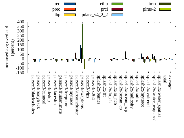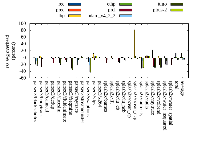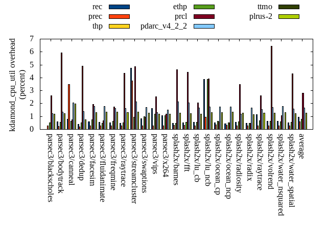 ======= Summary ======= runtime orig rec (overhead) prec (overhead) thp (overhead) ethp (overhead) prcl (overhead) pdarc_v4_2_2 (overhead) ttmo (overhead) plrus-2 (overhead) parsec3/blackscholes 139.814 139.631 (-0.13) 139.997 (0.13) 139.468 (-0.25) 139.296 (-0.37) 143.512 (2.64) 140.039 (0.16) 140.657 (0.60) 140.088 (0.20) parsec3/bodytrack 128.357 126.618 (-1.36) 126.724 (-1.27) 126.395 (-1.53) 126.883 (-1.15) 132.644 (3.34) 127.684 (-0.52) 128.984 (0.49) 127.529 (-0.65) parsec3/canneal 233.368 212.061 (-9.13) 219.119 (-6.11) 190.296 (-18.46) 234.022 (0.28) 229.938 (-1.47) 229.493 (-1.66) 226.209 (-3.07) 231.622 (-0.75) parsec3/dedup 18.617 18.892 (1.48) 18.665 (0.26) 18.242 (-2.01) 18.648 (0.17) 19.534 (4.92) 18.919 (1.62) 18.628 (0.06) 18.664 (0.25) parsec3/facesim 348.945 349.188 (0.07) 352.265 (0.95) 343.809 (-1.47) 342.920 (-1.73) 354.610 (1.62) 349.468 (0.15) 354.535 (1.60) 353.297 (1.25) parsec3/fluidanimate 334.993 337.717 (0.81) 337.584 (0.77) 331.398 (-1.07) 336.749 (0.52) 338.942 (1.18) 339.428 (1.32) 340.739 (1.72) 341.023 (1.80) parsec3/freqmine 436.224 435.618 (-0.14) 435.000 (-0.28) 434.960 (-0.29) 438.285 (0.47) 440.511 (0.98) 436.959 (0.17) 437.622 (0.32) 435.290 (-0.21) parsec3/raytrace 183.389 184.095 (0.39) 185.820 (1.33) 186.101 (1.48) 184.656 (0.69) 190.431 (3.84) 186.449 (1.67) 188.339 (2.70) 187.486 (2.23) parsec3/streamcluster 635.259 706.188 (11.17) 685.607 (7.93) 592.861 (-6.67) 614.899 (-3.20) 692.650 (9.03) 677.881 (6.71) 727.168 (14.47) 714.957 (12.55) parsec3/swaptions 221.500 222.372 (0.39) 221.815 (0.14) 222.197 (0.31) 224.402 (1.31) 223.994 (1.13) 220.907 (-0.27) 220.943 (-0.25) 220.997 (-0.23) parsec3/vips 93.235 93.539 (0.33) 92.356 (-0.94) 92.973 (-0.28) 93.120 (-0.12) 93.932 (0.75) 93.742 (0.54) 92.191 (-1.12) 92.581 (-0.70) parsec3/x264 120.869 109.580 (-9.34) 110.482 (-8.59) 125.560 (3.88) 119.997 (-0.72) 119.618 (-1.03) 125.059 (3.47) 121.222 (0.29) 127.816 (5.75) splash2x/barnes 130.047 131.405 (1.04) 131.580 (1.18) 119.078 (-8.43) 130.256 (0.16) 137.311 (5.59) 132.993 (2.27) 132.613 (1.97) 132.919 (2.21) splash2x/fft 62.052 62.406 (0.57) 62.161 (0.18) 47.441 (-23.55) 61.135 (-1.48) 64.464 (3.89) 63.768 (2.77) 69.400 (11.84) 69.238 (11.58) splash2x/lu_cb 134.287 134.019 (-0.20) 133.178 (-0.83) 133.445 (-0.63) 133.650 (-0.47) 135.056 (0.57) 133.237 (-0.78) 134.322 (0.03) 134.243 (-0.03) splash2x/lu_ncb 152.296 153.172 (0.57) 150.879 (-0.93) 150.609 (-1.11) 152.803 (0.33) 152.549 (0.17) 150.981 (-0.86) 152.483 (0.12) 154.294 (1.31) splash2x/ocean_cp 90.750 81.217 (-10.50) 81.546 (-10.14) 77.781 (-14.29) 83.869 (-7.58) 89.022 (-1.90) 83.816 (-7.64) 87.286 (-3.82) 85.645 (-5.62) splash2x/ocean_ncp 171.122 164.948 (-3.61) 164.131 (-4.09) 107.230 (-37.34) 165.266 (-3.42) 172.712 (0.93) 170.727 (-0.23) 186.580 (9.03) 178.425 (4.27) splash2x/radiosity 142.038 142.326 (0.20) 144.450 (1.70) 141.431 (-0.43) 142.358 (0.23) 147.529 (3.87) 143.775 (1.22) 144.669 (1.85) 145.126 (2.17) splash2x/radix 50.172 52.875 (5.39) 54.461 (8.55) 44.581 (-11.14) 54.292 (8.21) 53.446 (6.53) 53.219 (6.07) 55.389 (10.40) 55.202 (10.03) splash2x/raytrace 137.823 136.758 (-0.77) 135.253 (-1.87) 132.694 (-3.72) 134.462 (-2.44) 139.779 (1.42) 136.473 (-0.98) 137.724 (-0.07) 139.337 (1.10) splash2x/volrend 120.531 121.155 (0.52) 121.338 (0.67) 121.404 (0.72) 120.740 (0.17) 124.315 (3.14) 120.764 (0.19) 120.804 (0.23) 121.146 (0.51) splash2x/water_nsquared 370.050 372.961 (0.79) 371.471 (0.38) 357.206 (-3.47) 368.391 (-0.45) 383.979 (3.76) 375.499 (1.47) 381.877 (3.20) 388.893 (5.09) splash2x/water_spatial 134.645 135.251 (0.45) 134.892 (0.18) 135.061 (0.31) 136.010 (1.01) 139.514 (3.62) 135.729 (0.80) 135.887 (0.92) 134.927 (0.21) total 4590.380 4624.000 (0.73) 4610.780 (0.44) 4372.210 (-4.75) 4557.120 (-0.72) 4719.980 (2.82) 4647.020 (1.23) 4736.260 (3.18) 4730.760 (3.06) average 191.266 192.667 (-0.46) 192.116 (-0.45) 182.175 (-5.39) 189.880 (-0.40) 196.666 (2.44) 193.626 (0.74) 197.344 (2.23) 197.115 (2.26) kdamond_cpu_util orig rec (overhead) prec (overhead) thp (overhead) ethp (overhead) prcl (overhead) pdarc_v4_2_2 (overhead) ttmo (overhead) plrus-2 (overhead) parsec3/blackscholes 0.000 0.000 (0.00) 0.268 (0.27) 0.000 (0.00) 0.504 (0.50) 2.627 (2.63) 1.240 (1.24) 0.000 (0.00) 1.187 (1.19) parsec3/bodytrack 0.000 0.575 (0.58) 0.244 (0.24) 0.000 (0.00) 0.552 (0.55) 5.938 (5.94) 1.347 (1.35) 0.000 (0.00) 1.222 (1.22) parsec3/canneal 0.000 0.778 (0.78) 3.485 (3.48) 0.000 (0.00) 0.626 (0.63) 0.770 (0.77) 2.058 (2.06) 0.000 (0.00) 1.979 (1.98) parsec3/dedup 0.000 0.411 (0.41) 0.213 (0.21) 0.000 (0.00) 0.503 (0.50) 4.909 (4.91) 1.375 (1.38) 0.000 (0.00) 0.734 (0.73) parsec3/facesim 0.000 0.577 (0.58) 0.289 (0.29) 0.000 (0.00) 0.749 (0.75) 1.923 (1.92) 1.764 (1.76) 0.000 (0.00) 1.305 (1.31) parsec3/fluidanimate 0.000 0.537 (0.54) 0.287 (0.29) 0.000 (0.00) 0.494 (0.49) 0.681 (0.68) 1.761 (1.76) 0.000 (0.00) 1.329 (1.33) parsec3/freqmine 0.000 0.496 (0.50) 0.290 (0.29) 0.000 (0.00) 0.630 (0.63) 1.758 (1.76) 1.632 (1.63) 0.000 (0.00) 1.349 (1.35) parsec3/raytrace 0.000 0.485 (0.49) 0.288 (0.29) 0.000 (0.00) 0.509 (0.51) 4.356 (4.36) 1.617 (1.62) 0.000 (0.00) 1.314 (1.31) parsec3/streamcluster 0.000 4.738 (4.74) 3.772 (3.77) 0.000 (0.00) 0.956 (0.96) 4.860 (4.86) 2.143 (2.14) 0.000 (0.00) 1.349 (1.35) parsec3/swaptions 0.000 0.847 (0.85) 0.277 (0.28) 0.000 (0.00) 0.979 (0.98) 0.968 (0.97) 1.690 (1.69) 0.000 (0.00) 1.260 (1.26) parsec3/vips 0.000 1.624 (1.62) 0.278 (0.28) 0.000 (0.00) 1.198 (1.20) 2.515 (2.51) 1.292 (1.29) 0.000 (0.00) 1.188 (1.19) parsec3/x264 0.000 1.064 (1.06) 0.295 (0.29) 0.000 (0.00) 1.064 (1.06) 1.191 (1.19) 1.518 (1.52) 0.000 (0.00) 1.191 (1.19) splash2x/barnes 0.000 0.465 (0.46) 0.312 (0.31) 0.000 (0.00) 0.456 (0.46) 4.633 (4.63) 2.155 (2.16) 0.000 (0.00) 1.268 (1.27) splash2x/fft 0.000 0.503 (0.50) 0.313 (0.31) 0.000 (0.00) 0.547 (0.55) 4.439 (4.44) 2.064 (2.06) 0.000 (0.00) 1.220 (1.22) splash2x/lu_cb 0.000 0.554 (0.55) 0.283 (0.28) 0.000 (0.00) 0.573 (0.57) 2