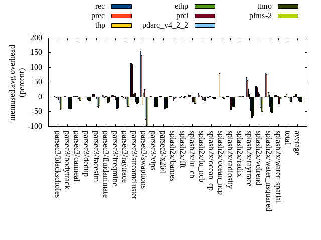 ======= Summary ======= runtime orig rec (overhead) prec (overhead) thp (overhead) ethp (overhead) prcl (overhead) pdarc_v4_2_2 (overhead) ttmo (overhead) plrus-2 (overhead) parsec3/blackscholes 139.352 139.728 (0.27) 139.289 (-0.04) 138.840 (-0.37) 139.691 (0.24) 144.939 (4.01) 139.663 (0.22) 139.824 (0.34) 140.497 (0.82) parsec3/bodytrack 125.248 125.807 (0.45) 126.068 (0.65) 125.344 (0.08) 125.947 (0.56) 137.256 (9.59) 125.726 (0.38) 125.734 (0.39) 126.076 (0.66) parsec3/canneal 209.896 214.413 (2.15) 218.639 (4.17) 179.363 (-14.55) 220.749 (5.17) 221.302 (5.43) 219.774 (4.71) 215.353 (2.60) 230.996 (10.05) parsec3/dedup 18.163 18.501 (1.86) 18.509 (1.91) 18.225 (0.34) 18.317 (0.85) 19.562 (7.71) 18.360 (1.09) 18.283 (0.66) 18.265 (0.56) parsec3/facesim 346.713 345.075 (-0.47) 347.187 (0.14) 340.984 (-1.65) 347.473 (0.22) 353.326 (1.91) 349.986 (0.94) 349.183 (0.71) 350.049 (0.96) parsec3/fluidanimate 328.869 332.618 (1.14) 340.220 (3.45) 333.244 (1.33) 336.628 (2.36) 340.359 (3.49) 335.325 (1.96) 335.343 (1.97) 340.648 (3.58) parsec3/freqmine 436.201 438.525 (0.53) 436.896 (0.16) 436.573 (0.09) 437.267 (0.24) 443.434 (1.66) 437.423 (0.28) 437.308 (0.25) 438.163 (0.45) parsec3/raytrace 183.269 181.776 (-0.81) 182.979 (-0.16) 185.681 (1.32) 183.607 (0.18) 195.032 (6.42) 187.244 (2.17) 185.391 (1.16) 187.840 (2.49) parsec3/streamcluster 667.915 690.759 (3.42) 658.042 (-1.48) 605.948 (-9.28) 716.724 (7.31) 719.869 (7.78) 654.405 (-2.02) 679.299 (1.70) 674.867 (1.04) parsec3/swaptions 219.503 221.608 (0.96) 221.391 (0.86) 221.480 (0.90) 221.997 (1.14) 224.273 (2.17) 222.106 (1.19) 221.648 (0.98) 223.288 (1.72) parsec3/vips 88.363 88.150 (-0.24) 87.603 (-0.86) 87.513 (-0.96) 88.673 (0.35) 89.870 (1.71) 91.687 (3.76) 93.263 (5.55) 93.658 (5.99) parsec3/x264 119.828 123.034 (2.68) 116.553 (-2.73) 122.417 (2.16) 116.139 (-3.08) 114.962 (-4.06) 118.087 (-1.45) 120.876 (0.87) 118.478 (-1.13) splash2x/barnes 130.793 130.132 (-0.51) 132.062 (0.97) 119.239 (-8.83) 131.131 (0.26) 141.700 (8.34) 131.476 (0.52) 131.778 (0.75) 133.627 (2.17) splash2x/fft 61.224 61.121 (-0.17) 62.260 (1.69) 48.468 (-20.83) 61.790 (0.92) 64.239 (4.92) 62.443 (1.99) 70.348 (14.90) 68.891 (12.52) splash2x/lu_cb 131.951 133.005 (0.80) 132.334 (0.29) 132.707 (0.57) 133.325 (1.04) 136.753 (3.64) 133.719 (1.34) 133.826 (1.42) 134.531 (1.95) splash2x/lu_ncb 149.877 150.795 (0.61) 153.118 (2.16) 151.655 (1.19) 152.380 (1.67) 154.190 (2.88) 150.401 (0.35) 152.716 (1.89) 152.922 (2.03) splash2x/ocean_cp 79.715 81.435 (2.16) 81.291 (1.98) 81.777 (2.59) 79.963 (0.31) 84.374 (5.85) 80.940 (1.54) 82.331 (3.28) 85.384 (7.11) splash2x/ocean_ncp 153.089 165.123 (7.86) 164.861 (7.69) 108.807 (-28.93) 165.970 (8.41) 165.250 (7.94) 166.708 (8.90) 172.959 (12.98) 177.533 (15.97) splash2x/radiosity 141.900 142.531 (0.44) 141.961 (0.04) 143.434 (1.08) 142.916 (0.72) 150.620 (6.14) 142.817 (0.65) 145.032 (2.21) 145.832 (2.77) splash2x/radix 49.786 50.982 (2.40) 51.305 (3.05) 45.680 (-8.25) 51.862 (4.17) 52.751 (5.96) 54.268 (9.00) 53.642 (7.75) 54.354 (9.17) splash2x/raytrace 134.651 136.242 (1.18) 134.828 (0.13) 133.564 (-0.81) 134.292 (-0.27) 141.826 (5.33) 135.623 (0.72) 137.663 (2.24) 138.533 (2.88) splash2x/volrend 120.114 120.347 (0.19) 120.918 (0.67) 119.972 (-0.12) 121.377 (1.05) 127.710 (6.32) 121.040 (0.77) 120.758 (0.54) 120.741 (0.52) splash2x/water_nsquared 370.628 371.531 (0.24) 371.222 (0.16) 353.331 (-4.67) 371.216 (0.16) 397.452 (7.24) 373.772 (0.85) 382.991 (3.34) 385.425 (3.99) splash2x/water_spatial 134.097 133.803 (-0.22) 133.815 (-0.21) 133.404 (-0.52) 133.912 (-0.14) 143.641 (7.12) 135.019 (0.69) 135.043 (0.71) 136.504 (1.79) total 4541.140 4597.020 (1.23) 4573.340 (0.71) 4367.650 (-3.82) 4633.360 (2.03) 4764.670 (4.92) 4588.010 (1.03) 4640.600 (2.19) 4677.080 (2.99) average 189.214 191.543 (1.12) 190.556 (1.03) 181.985 (-3.67) 193.057 (1.41) 198.528 (4.98) 191.167 (1.69) 193.358 (2.88) 194.878 (3.75) kdamond_cpu_util orig rec (overhead) prec (overhead) thp (overhead) ethp (overhead) prcl (overhead) pdarc_v4_2_2 (overhead) ttmo (overhead) plrus-2 (overhead) parsec3/blackscholes 0.000 0.000 (0.00) 0.000 (0.00) 0.000 (0.00) 0.000 (0.00) 0.000 (0.00) 0.000 (0.00) 0.000 (0.00) 0.000 (0.00) parsec3/bodytrack 0.000 0.000 (0.00) 0.000 (0.00) 0.000 (0.00) 0.000 (0.00) 0.000 (0.00) 0.000 (0.00) 0.000 (0.00) 0.000 (0.00) parsec3/canneal 0.000 0.000 (0.00) 0.000 (0.00) 0.000 (0.00) 0.000 (0.00) 0.000 (0.00) 0.000 (0.00) 0.000 (0.00) 0.000 (0.00) parsec3/dedup 0.000 0.000 (0.00) 0.000 (0.00) 0.000 (0.00) 0.000 (0.00) 0.000 (0.00) 0.000 (0.00) 0.000 (0.00) 0.000 (0.00) parsec3/facesim 0.000 0.000 (0.00) 0.000 (0.00) 0.000 (0.00) 0.000 (0.00) 0.000 (0.00) 0.000 (0.00) 0.000 (0.00) 0.000 (0.00) parsec3/fluidanimate 0.000 0.000 (0.00) 0.000 (0.00) 0.000 (0.00) 0.000 (0.00) 0.000 (0.00) 0.000 (0.00) 0.000 (0.00) 0.000 (0.00) parsec3/freqmine 0.000 0.000 (0.00) 0.000 (0.00) 0.000 (0.00) 0.000 (0.00) 0.000 (0.00) 0.000 (0.00) 0.000 (0.00) 0.000 (0.00) parsec3/raytrace 0.000 0.000 (0.00) 0.000 (0.00) 0.000 (0.00) 0.000 (0.00) 0.000 (0.00) 0.000 (0.00) 0.000 (0.00) 0.000 (0.00) parsec3/streamcluster 0.000 0.000 (0.00) 0.000 (0.00) 0.000 (0.00) 0.000 (0.00) 0.000 (0.00) 0.000 (0.00) 0.000 (0.00) 0.000 (0.00) parsec3/swaptions 0.000 0.000 (0.00) 0.000 (0.00) 0.000 (0.00) 0.000 (0.00) 0.000 (0.00) 0.000 (0.00) 0.000 (0.00) 0.000 (0.00) parsec3/vips 0.000 0.000 (0.00) 0.000 (0.00) 0.000 (0.00) 0.000 (0.00) 0.000 (0.00) 0.000 (0.00) 0.000 (0.00) 0.000 (0.00) parsec3/x264 0.000 0.000 (0.00) 0.000 (0.00) 0.000 (0.00) 0.000 (0.00) 0.000 (0.00) 0.000 (0.00) 0.000 (0.00) 0.000 (0.00) splash2x/barnes 0.000 0.000 (0.00) 0.000 (0.00) 0.000 (0.00) 0.000 (0.00) 0.000 (0.00) 0.000 (0.00) 0.000 (0.00) 0.000 (0.00) splash2x/fft 0.000 0.000 (0.00) 0.000 (0.00) 0.000 (0.00) 0.000 (0.00) 0.000 (0.00) 0.000 (0.00) 0.000 (0.00) 0.000 (0.00) splash2x/lu_cb 0.000 0.000 (0.00) 0.000 (0.00) 0.000 (0.00) 0.000 (0.00) 0.000 (0.00) 0.000 (0.00) 0.000 (0.00) 0.000 (0.00) 
