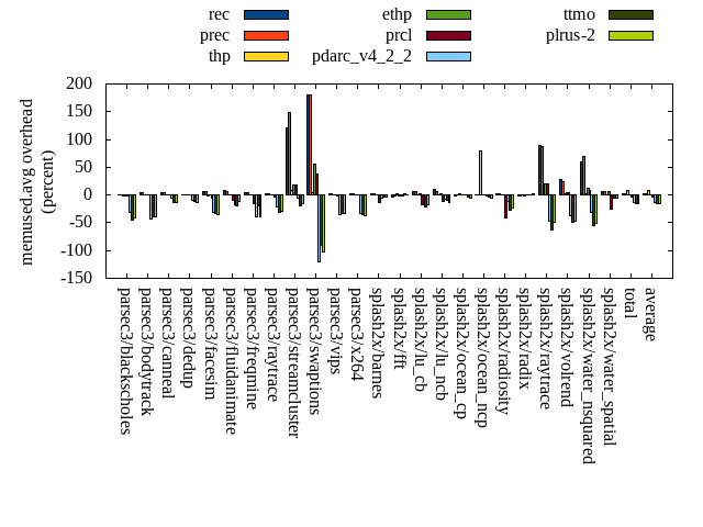 ======= Summary ======= runtime orig rec (overhead) prec (overhead) thp (overhead) ethp (overhead) prcl (overhead) pdarc_v4_2_2 (overhead) ttmo (overhead) plrus-2 (overhead) parsec3/blackscholes 139.835 140.502 (0.48) 139.475 (-0.26) 139.073 (-0.54) 139.543 (-0.21) 145.027 (3.71) 140.196 (0.26) 139.787 (-0.03) 140.566 (0.52) parsec3/bodytrack 124.558 125.497 (0.75) 126.352 (1.44) 124.935 (0.30) 125.434 (0.70) 135.327 (8.65) 126.014 (1.17) 125.749 (0.96) 125.786 (0.99) parsec3/canneal 223.107 224.780 (0.75) 224.358 (0.56) 194.491 (-12.83) 224.041 (0.42) 230.843 (3.47) 230.480 (3.30) 228.959 (2.62) 227.707 (2.06) parsec3/dedup 18.183 18.483 (1.65) 18.232 (0.27) 17.996 (-1.03) 18.462 (1.54) 19.612 (7.86) 18.421 (1.31) 18.442 (1.42) 18.392 (1.15) parsec3/facesim 345.285 351.315 (1.75) 350.567 (1.53) 341.967 (-0.96) 348.706 (0.99) 356.976 (3.39) 354.105 (2.55) 347.185 (0.55) 351.591 (1.83) parsec3/fluidanimate 339.900 337.582 (-0.68) 339.521 (-0.11) 327.751 (-3.57) 339.237 (-0.20) 339.899 (-0.00) 335.238 (-1.37) 339.441 (-0.14) 335.999 (-1.15) parsec3/freqmine 434.990 437.146 (0.50) 436.517 (0.35) 436.449 (0.34) 436.129 (0.26) 443.808 (2.03) 436.715 (0.40) 436.494 (0.35) 440.682 (1.31) parsec3/raytrace 183.912 183.905 (-0.00) 185.688 (0.97) 185.810 (1.03) 185.036 (0.61) 195.886 (6.51) 185.099 (0.65) 185.816 (1.04) 186.434 (1.37) parsec3/streamcluster 692.386 714.532 (3.20) 705.061 (1.83) 596.031 (-13.92) 702.362 (1.44) 724.035 (4.57) 671.145 (-3.07) 678.577 (-1.99) 713.611 (3.07) parsec3/swaptions 219.949 222.817 (1.30) 222.416 (1.12) 221.168 (0.55) 221.544 (0.72) 223.593 (1.66) 224.587 (2.11) 221.320 (0.62) 221.764 (0.83) parsec3/vips 87.689 89.173 (1.69) 88.386 (0.80) 88.314 (0.71) 88.854 (1.33) 90.179 (2.84) 92.779 (5.81) 94.082 (7.29) 94.725 (8.02) parsec3/x264 110.163 124.181 (12.73) 118.666 (7.72) 119.333 (8.32) 115.782 (5.10) 118.338 (7.42) 113.090 (2.66) 115.897 (5.20) 119.668 (8.63) splash2x/barnes 131.241 131.221 (-0.02) 131.733 (0.37) 119.233 (-9.15) 132.512 (0.97) 139.952 (6.64) 133.104 (1.42) 131.067 (-0.13) 132.390 (0.88) splash2x/fft 61.503 61.578 (0.12) 62.009 (0.82) 49.246 (-19.93) 62.387 (1.44) 63.484 (3.22) 62.599 (1.78) 69.185 (12.49) 68.797 (11.86) splash2x/lu_cb 133.129 133.288 (0.12) 132.986 (-0.11) 133.489 (0.27) 133.963 (0.63) 136.674 (2.66) 133.558 (0.32) 134.373 (0.93) 133.493 (0.27) splash2x/lu_ncb 151.001 153.767 (1.83) 151.297 (0.20) 151.686 (0.45) 151.812 (0.54) 154.026 (2.00) 151.868 (0.57) 152.509 (1.00) 154.337 (2.21) splash2x/ocean_cp 84.041 85.598 (1.85) 86.215 (2.59) 80.058 (-4.74) 85.323 (1.52) 86.081 (2.43) 83.259 (-0.93) 85.436 (1.66) 85.094 (1.25) splash2x/ocean_ncp 168.591 164.748 (-2.28) 166.929 (-0.99) 104.802 (-37.84) 168.830 (0.14) 168.931 (0.20) 166.801 (-1.06) 171.904 (1.96) 175.168 (3.90) splash2x/radiosity 142.376 143.021 (0.45) 142.673 (0.21) 142.411 (0.03) 142.649 (0.19) 149.509 (5.01) 142.967 (0.42) 144.792 (1.70) 145.347 (2.09) splash2x/radix 51.475 52.138 (1.29) 51.601 (0.24) 45.453 (-11.70) 52.088 (1.19) 52.806 (2.58) 53.314 (3.57) 54.241 (5.37) 56.740 (10.23) splash2x/raytrace 133.583 135.565 (1.48) 136.018 (1.82) 133.142 (-0.33) 135.210 (1.22) 140.113 (4.89) 136.898 (2.48) 138.341 (3.56) 137.350 (2.82) splash2x/volrend 119.862 120.646 (0.65) 120.661 (0.67) 120.005 (0.12) 120.978 (0.93) 127.674 (6.52) 120.894 (0.86) 120.607 (0.62) 120.796 (0.78) splash2x/water_nsquared 370.274 371.941 (0.45) 371.715 (0.39) 356.008 (-3.85) 373.446 (0.86) 398.088 (7.51) 373.907 (0.98) 379.771 (2.56) 380.752 (2.83) splash2x/water_spatial 134.173 134.384 (0.16) 134.689 (0.38) 134.471 (0.22) 135.301 (0.84) 145.697 (8.59) 135.787 (1.20) 134.751 (0.43) 136.089 (1.43) total 4601.200 4657.810 (1.23) 4643.780 (0.93) 4363.320 (-5.17) 4639.620 (0.83) 4786.550 (4.03) 4622.820 (0.47) 4648.720 (1.03) 4703.270 (2.22) average 191.717 194.075 (1.26) 193.491 (0.95) 181.805 (-4.50) 193.317 (0.97) 199.440 (4.35) 192.617 (1.14) 193.697 (2.09) 195.970 (2.88) kdamond_cpu_util orig rec (overhead) prec (overhead) thp (overhead) ethp (overhead) prcl (overhead) pdarc_v4_2_2 (overhead) ttmo (overhead) plrus-2 (overhead) parsec3/blackscholes 0.000 0.000 (0.00) 0.000 (0.00) 0.000 (0.00) 0.000 (0.00) 0.000 (0.00) 0.000 (0.00) 0.000 (0.00) 0.000 (0.00) parsec3/bodytrack 0.000 0.000 (0.00) 0.000 (0.00) 0.000 (0.00) 0.000 (0.00) 0.000 (0.00) 0.000 (0.00) 0.000 (0.00) 0.000 (0.00) parsec3/canneal 0.000 0.000 (0.00) 0.000 (0.00) 0.000 (0.00) 0.000 (0.00) 0.000 (0.00) 0.000 (0.00) 0.000 (0.00) 0.000 (0.00) parsec3/dedup 0.000 0.000 (0.00) 0.000 (0.00) 0.000 (0.00) 0.000 (0.00) 0.000 (0.00) 0.000 (0.00) 0.000 (0.00) 0.000 (0.00) parsec3/facesim 0.000 0.000 (0.00) 0.000 (0.00) 0.000 (0.00) 0.000 (0.00) 0.000 (0.00) 0.000 (0.00) 0.000 (0.00) 0.000 (0.00) parsec3/fluidanimate 0.000 0.000 (0.00) 0.000 (0.00) 0.000 (0.00) 0.000 (0.00) 0.000 (0.00) 0.000 (0.00) 0.000 (0.00) 0.000 (0.00) parsec3/freqmine 0.000 0.000 (0.00) 0.000 (0.00) 0.000 (0.00) 0.000 (0.00) 0.000 (0.00) 0.000 (0.00) 0.000 (0.00) 0.000 (0.00) parsec3/raytrace 0.000 0.000 (0.00) 0.000 (0.00) 0.000 (0.00) 0.000 (0.00) 0.000 (0.00) 0.000 (0.00) 0.000 (0.00) 0.000 (0.00) parsec3/streamcluster 0.000 0.000 (0.00) 0.000 (0.00) 0.000 (0.00) 0.000 (0.00) 0.000 (0.00) 0.000 (0.00) 0.000 (0.00) 0.000 (0.00) parsec3/swaptions 0.000 0.000 (0.00) 0.000 (0.00) 0.000 (0.00) 0.000 (0.00) 0.000 (0.00) 0.000 (0.00) 0.000 (0.00) 0.000 (0.00) parsec3/vips 0.000 0.000 (0.00) 0.000 (0.00) 0.000 (0.00) 0.000 (0.00) 0.000 (0.00) 0.000 (0.00) 0.000 (0.00) 0.000 (0.00) parsec3/x264 0.000 0.000 (0.00) 0.000 (0.00) 0.000 (0.00) 0.000 (0.00) 0.000 (0.00) 0.000 (0.00) 0.000 (0.00) 0.000 (0.00) splash2x/barnes 0.000 0.000 (0.00) 0.000 (0.00) 0.000 (0.00) 0.000 (0.00) 0.000 (0.00) 0.000 (0.00) 0.000 (0.00) 0.000 (0.00) splash2x/fft 0.000 0.000 (0.00) 0.000 (0.00) 0.000 (0.00) 0.000 (0.00) 0.000 (0.00) 0.000 (0.00) 0.000 (0.00) 0.000 (0.00) splash2x/lu_cb 0.000 0.000 (0.00) 0.000 (0.00) 0.000 (0.00) 0.000 (0.00) 0.000 (0.00) 0.000 (0.00) 0.000 (0.00) 0.000 (0.00