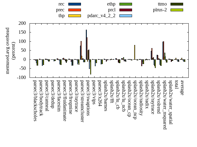 ======= Summary ======= runtime orig rec (overhead) prec (overhead) thp (overhead) ethp (overhead) prcl (overhead) pdarc_v4_2_2 (overhead) ttmo (overhead) plrus-2 (overhead) parsec3/blackscholes 139.777 140.232 (0.33) 139.792 (0.01) 139.181 (-0.43) 140.566 (0.56) 143.313 (2.53) 139.563 (-0.15) 139.941 (0.12) 141.562 (1.28) parsec3/bodytrack 125.469 127.053 (1.26) 126.554 (0.87) 125.468 (-0.00) 126.579 (0.88) 134.588 (7.27) 126.507 (0.83) 126.328 (0.68) 125.829 (0.29) parsec3/canneal 220.878 221.208 (0.15) 221.728 (0.39) 187.332 (-15.19) 226.171 (2.40) 228.268 (3.35) 235.035 (6.41) 233.234 (5.59) 237.132 (7.36) parsec3/dedup 18.131 18.595 (2.56) 18.401 (1.49) 17.870 (-1.44) 18.240 (0.60) 19.403 (7.01) 18.621 (2.70) 18.338 (1.14) 18.307 (0.97) parsec3/facesim 352.153 349.316 (-0.81) 349.181 (-0.84) 343.301 (-2.51) 355.170 (0.86) 360.257 (2.30) 352.727 (0.16) 351.108 (-0.30) 356.410 (1.21) parsec3/fluidanimate 335.607 337.739 (0.64) 338.893 (0.98) 332.728 (-0.86) 341.677 (1.81) 340.507 (1.46) 340.525 (1.47) 342.077 (1.93) 343.238 (2.27) parsec3/freqmine 436.109 438.006 (0.43) 435.004 (-0.25) 437.019 (0.21) 436.932 (0.19) 442.498 (1.46) 438.263 (0.49) 438.805 (0.62) 436.586 (0.11) parsec3/raytrace 183.939 186.517 (1.40) 184.880 (0.51) 185.476 (0.84) 186.041 (1.14) 191.991 (4.38) 188.380 (2.41) 186.517 (1.40) 188.503 (2.48) parsec3/streamcluster 682.145 712.993 (4.52) 729.468 (6.94) 623.245 (-8.63) 710.405 (4.14) 731.226 (7.20) 706.867 (3.62) 705.804 (3.47) 691.596 (1.39) parsec3/swaptions 221.890 223.085 (0.54) 221.539 (-0.16) 222.396 (0.23) 222.034 (0.06) 223.406 (0.68) 222.219 (0.15) 221.403 (-0.22) 221.419 (-0.21) parsec3/vips 87.892 88.363 (0.54) 88.456 (0.64) 87.702 (-0.22) 88.687 (0.90) 91.007 (3.54) 92.284 (5.00) 92.905 (5.70) 93.519 (6.40) parsec3/x264 123.484 119.064 (-3.58) 118.668 (-3.90) 122.457 (-0.83) 115.507 (-6.46) 117.623 (-4.75) 120.872 (-2.11) 113.871 (-7.78) 121.743 (-1.41) splash2x/barnes 131.084 131.360 (0.21) 131.051 (-0.02) 119.208 (-9.06) 131.130 (0.04) 142.520 (8.72) 132.322 (0.94) 132.117 (0.79) 132.816 (1.32) splash2x/fft 62.134 62.307 (0.28) 63.549 (2.28) 48.740 (-21.56) 62.688 (0.89) 65.375 (5.22) 63.884 (2.82) 69.274 (11.49) 64.891 (4.44) splash2x/lu_cb 133.485 133.361 (-0.09) 133.526 (0.03) 133.532 (0.03) 133.035 (-0.34) 136.700 (2.41) 132.969 (-0.39) 134.110 (0.47) 134.646 (0.87) splash2x/lu_ncb 150.872 151.319 (0.30) 151.018 (0.10) 152.315 (0.96) 153.004 (1.41) 152.855 (1.31) 152.571 (1.13) 153.306 (1.61) 153.615 (1.82) splash2x/ocean_cp 82.470 84.811 (2.84) 87.009 (5.50) 83.087 (0.75) 87.044 (5.55) 87.521 (6.13) 84.210 (2.11) 85.611 (3.81) 86.049 (4.34) splash2x/ocean_ncp 163.644 165.646 (1.22) 170.286 (4.06) 103.984 (-36.46) 168.012 (2.67) 169.837 (3.78) 168.909 (3.22) 174.593 (6.69) 175.401 (7.18) splash2x/radiosity 142.177 142.967 (0.56) 142.282 (0.07) 142.248 (0.05) 142.824 (0.45) 146.823 (3.27) 144.089 (1.34) 144.021 (1.30) 144.136 (1.38) splash2x/radix 52.224 52.549 (0.62) 52.048 (-0.34) 46.892 (-10.21) 52.622 (0.76) 52.298 (0.14) 55.318 (5.93) 54.371 (4.11) 54.203 (3.79) splash2x/raytrace 133.462 136.642 (2.38) 134.807 (1.01) 133.251 (-0.16) 134.650 (0.89) 141.061 (5.69) 134.483 (0.76) 138.936 (4.10) 136.965 (2.62) splash2x/volrend 120.044 120.477 (0.36) 121.407 (1.13) 119.884 (-0.13) 120.835 (0.66) 123.673 (3.02) 120.835 (0.66) 120.515 (0.39) 120.926 (0.73) splash2x/water_nsquared 370.961 373.322 (0.64) 373.672 (0.73) 356.914 (-3.79) 372.682 (0.46) 399.343 (7.65) 372.111 (0.31) 380.214 (2.49) 383.111 (3.28) splash2x/water_spatial 134.728 135.168 (0.33) 135.362 (0.47) 136.092 (1.01) 134.333 (-0.29) 141.471 (5.01) 135.466 (0.55) 137.529 (2.08) 135.695 (0.72) total 4604.730 4652.110 (1.03) 4668.600 (1.39) 4400.320 (-4.44) 4660.850 (1.22) 4783.580 (3.88) 4679.030 (1.61) 4694.940 (1.96) 4698.300 (2.03) average 191.864 193.838 (0.73) 194.525 (0.90) 183.347 (-4.47) 194.202 (0.84) 199.316 (3.70) 194.960 (1.68) 195.622 (2.15) 195.763 (2.28) kdamond_cpu_util orig rec (overhead) prec (overhead) thp (overhead) ethp (overhead) prcl (overhead) pdarc_v4_2_2 (overhead) ttmo (overhead) plrus-2 (overhead) parsec3/blackscholes 0.000 0.000 (0.00) 0.000 (0.00) 0.000 (0.00) 0.000 (0.00) 0.000 (0.00) 0.000 (0.00) 0.000 (0.00) 0.000 (0.00) parsec3/bodytrack 0.000 0.000 (0.00) 0.000 (0.00) 0.000 (0.00) 0.000 (0.00) 0.000 (0.00) 0.000 (0.00) 0.000 (0.00) 0.000 (0.00) parsec3/canneal 0.000 0.000 (0.00) 0.000 (0.00) 0.000 (0.00) 0.000 (0.00) 0.000 (0.00) 0.000 (0.00) 0.000 (0.00) 0.000 (0.00) parsec3/dedup 0.000 0.000 (0.00) 0.000 (0.00) 0.000 (0.00) 0.000 (0.00) 0.000 (0.00) 0.000 (0.00) 0.000 (0.00) 0.000 (0.00) parsec3/facesim 0.000 0.000 (0.00) 0.000 (0.00) 0.000 (0.00) 0.000 (0.00) 0.000 (0.00) 0.000 (0.00) 0.000 (0.00) 0.000 (0.00) parsec3/fluidanimate 0.000 0.000 (0.00) 0.000 (0.00) 0.000 (0.00) 0.000 (0.00) 0.000 (0.00) 0.000 (0.00) 0.000 (0.00) 0.000 (0.00) parsec3/freqmine 0.000 0.000 (0.00) 0.000 (0.00) 0.000 (0.00) 0.000 (0.00) 0.000 (0.00) 0.000 (0.00) 0.000 (0.00) 0.000 (0.00) parsec3/raytrace 0.000 0.000 (0.00) 0.000 (0.00) 0.000 (0.00) 0.000 (0.00) 0.000 (0.00) 0.000 (0.00) 0.000 (0.00) 0.000 (0.00) parsec3/streamcluster 0.000 0.000 (0.00) 0.000 (0.00) 0.000 (0.00) 0.000 (0.00) 0.000 (0.00) 0.000 (0.00) 0.000 (0.00) 0.000 (0.00) parsec3/swaptions 0.000 0.000 (0.00) 0.000 (0.00) 0.000 (0.00) 0.000 (0.00) 0.000 (0.00) 0.000 (0.00) 0.000 (0.00) 0.000 (0.00) parsec3/vips 0.000 0.000 (0.00) 0.000 (0.00) 0.000 (0.00) 0.000 (0.00) 0.000 (0.00) 0.000 (0.00) 0.000 (0.00) 0.000 (0.00) parsec3/x264 0.000 0.000 (0.00) 0.000 (0.00) 0.000 (0.00) 0.000 (0.00) 0.000 (0.00) 0.000 (0.00) 0.000 (0.00) 0.000 (0.00) splash2x/barnes 0.000 0.000 (0.00) 0.000 (0.00) 0.000 (0.00) 0.000 (0.00) 0.000 (0.00) 0.000 (0.00) 0.000 (0.00) 0.000 (0.00) splash2x/fft 0.000 0.000 (0.00) 0.000 (0.00) 0.000 (0.00) 0.000 (0.00) 0.000 (0.00) 0.000 (0.00) 0.000 (0.00) 0.000 (0.00) splash2x/lu_cb 0.000 0.000 (0.00) 0.000 (0.00) 0.000 (0.00) 0.000 (0.00) 0.000 (0.00) 0.000 (0.00) 0.000 (0.00) 0.000 (0.00