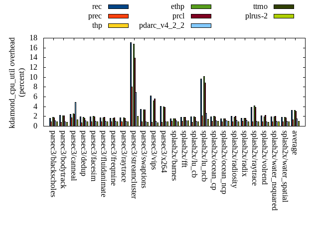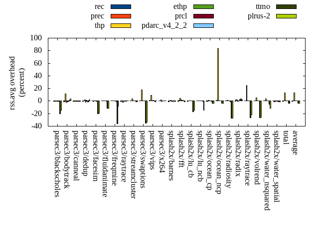======= Summary ======= runtime orig rec (overhead) prec (overhead) thp (overhead) ethp (overhead) prcl (overhead) pdarc_v4_2_2 (overhead) ttmo (overhead) plrus-2 (overhead) parsec3/blackscholes 139.815 139.855 (0.03) 139.463 (-0.25) 138.038 (-1.27) 139.700 (-0.08) 139.490 (-0.23) 140.473 (0.47) 138.724 (-0.78) 140.004 (0.14) parsec3/bodytrack 125.464 130.123 (3.71) 126.694 (0.98) 126.581 (0.89) 127.451 (1.58) 127.840 (1.89) 127.672 (1.76) 124.923 (-0.43) 126.351 (0.71) parsec3/canneal 220.896 220.293 (-0.27) 234.382 (6.11) 189.362 (-14.28) 212.142 (-3.96) 219.991 (-0.41) 219.208 (-0.76) 212.606 (-3.75) 211.839 (-4.10) parsec3/dedup 18.616 18.142 (-2.55) 18.144 (-2.54) 18.200 (-2.24) 18.201 (-2.23) 18.358 (-1.38) 18.241 (-2.02) 18.001 (-3.30) 18.373 (-1.31) parsec3/facesim 341.017 350.806 (2.87) 342.952 (0.57) 340.311 (-0.21) 342.258 (0.36) 343.466 (0.72) 347.690 (1.96) 346.667 (1.66) 354.029 (3.82) parsec3/fluidanimate 337.731 340.895 (0.94) 345.389 (2.27) 328.888 (-2.62) 348.870 (3.30) 332.713 (-1.49) 339.901 (0.64) 332.007 (-1.69) 344.234 (1.93) parsec3/freqmine 433.267 433.819 (0.13) 436.722 (0.80) 436.356 (0.71) 436.736 (0.80) 437.799 (1.05) 436.061 (0.64) 441.251 (1.84) 436.398 (0.72) parsec3/raytrace 179.716 182.370 (1.48) 182.551 (1.58) 184.073 (2.42) 181.606 (1.05) 184.532 (2.68) 183.776 (2.26) 183.053 (1.86) 185.751 (3.36) parsec3/streamcluster 675.924 710.185 (5.07) 652.838 (-3.42) 568.430 (-15.90) 740.889 (9.61) 719.145 (6.39) 642.838 (-4.90) 641.243 (-5.13) 635.622 (-5.96) parsec3/swaptions 222.313 220.626 (-0.76) 223.915 (0.72) 222.485 (0.08) 220.747 (-0.70) 222.728 (0.19) 221.627 (-0.31) 221.366 (-0.43) 220.394 (-0.86) parsec3/vips 87.535 89.342 (2.07) 88.232 (0.80) 87.248 (-0.33) 88.941 (1.61) 88.618 (1.24) 88.158 (0.71) 90.997 (3.96) 93.136 (6.40) parsec3/x264 106.279 115.571 (8.74) 108.143 (1.75) 114.694 (7.92) 108.941 (2.51) 114.966 (8.17) 126.864 (19.37) 114.050 (7.31) 120.667 (13.54) splash2x/barnes 129.790 132.689 (2.23) 131.282 (1.15) 118.965 (-8.34) 130.815 (0.79) 131.789 (1.54) 132.808 (2.32) 131.991 (1.70) 134.517 (3.64) splash2x/fft 62.553 60.714 (-2.94) 62.204 (-0.56) 46.768 (-25.23) 62.104 (-0.72) 63.608 (1.69) 64.620 (3.30) 66.530 (6.36) 63.302 (1.20) splash2x/lu_cb 131.925 133.222 (0.98) 133.135 (0.92) 132.226 (0.23) 133.749 (1.38) 132.682 (0.57) 134.180 (1.71) 133.548 (1.23) 133.823 (1.44) splash2x/lu_ncb 151.713 152.523 (0.53) 153.334 (1.07) 152.668 (0.63) 152.780 (0.70) 151.464 (-0.16) 151.032 (-0.45) 151.502 (-0.14) 152.385 (0.44) splash2x/ocean_cp 78.744 87.231 (10.78) 84.504 (7.31) 87.074 (10.58) 80.836 (2.66) 87.588 (11.23) 86.428 (9.76) 80.933 (2.78) 81.619 (3.65) splash2x/ocean_ncp 159.091 164.795 (3.59) 177.179 (11.37) 103.630 (-34.86) 159.789 (0.44) 159.610 (0.33) 173.096 (8.80) 172.283 (8.29) 175.549 (10.35) splash2x/radiosity 142.265 142.022 (-0.17) 144.159 (1.33) 142.177 (-0.06) 141.866 (-0.28) 143.867 (1.13) 142.301 (0.03) 144.272 (1.41) 144.222 (1.37) splash2x/radix 50.972 50.607 (-0.72) 52.683 (3.36) 45.225 (-11.27) 50.403 (-1.12) 50.976 (0.01) 52.600 (3.19) 57.831 (13.46) 54.675 (7.26) splash2x/raytrace 137.746 138.231 (0.35) 134.809 (-2.13) 132.939 (-3.49) 138.029 (0.21) 137.119 (-0.46) 134.811 (-2.13) 140.207 (1.79) 139.765 (1.47) splash2x/volrend 119.776 120.468 (0.58) 120.293 (0.43) 121.354 (1.32) 120.940 (0.97) 120.598 (0.69) 120.880 (0.92) 119.941 (0.14) 120.354 (0.48) splash2x/water_nsquared 370.943 375.307 (1.18) 370.601 (-0.09) 352.114 (-5.08) 374.398 (0.93) 373.233 (0.62) 371.909 (0.26) 379.593 (2.33) 383.714 (3.44) splash2x/water_spatial 133.768 133.755 (-0.01) 136.418 (1.98) 135.161 (1.04) 135.147 (1.03) 137.020 (2.43) 134.067 (0.22) 134.114 (0.26) 136.668 (2.17) total 4557.860 4643.600 (1.88) 4600.000 (0.92) 4324.950 (-5.11) 4647.350 (1.96) 4639.220 (1.79) 4591.260 (0.73) 4577.620 (0.43) 4607.380 (1.09) average 189.911 193.483 (1.58) 191.667 (1.48) 180.206 (-4.14) 193.640 (0.87) 193.301 (1.60) 191.303 (1.99) 190.734 (1.70) 191.974 (2.30) kdamond_cpu_util orig rec (overhead) prec (overhead) thp (overhead) ethp (overhead) prcl (overhead) pdarc_v4_2_2 (overhead) ttmo (overhead) plrus-2 (overhead) parsec3/blackscholes 0.000 1.613 (1.61) 0.868 (0.87) 0.000 (0.00) 1.831 (1.83) 1.718 (1.72) 1.071 (1.07) 0.000 (0.00) 0.907 (0.91) parsec3/bodytrack 0.000 2.209 (2.21) 0.852 (0.85) 0.000 (0.00) 2.087 (2.09) 2.151 (2.15) 0.964 (0.96) 0.000 (0.00) 0.854 (0.85) parsec3/canneal 0.000 2.459 (2.46) 1.701 (1.70) 0.000 (0.00) 2.498 (2.50) 2.482 (2.48) 4.923 (4.92) 0.000 (0.00) 1.340 (1.34) parsec3/dedup 0.000 1.937 (1.94) 0.762 (0.76) 0.000 (0.00) 1.871 (1.87) 1.617 (1.62) 1.119 (1.12) 0.000 (0.00) 0.895 (0.89) parsec3/facesim 0.000 1.967 (1.97) 0.899 (0.90) 0.000 (0.00) 1.987 (1.99) 1.946 (1.95) 0.987 (0.99) 0.000 (0.00) 0.890 (0.89) parsec3/fluidanimate 0.000 1.773 (1.77) 0.895 (0.89) 0.000 (0.00) 1.768 (1.77) 1.795 (1.79) 1.000 (1.00) 0.000 (0.00) 0.912 (0.91) parsec3/freqmine 0.000 1.617 (1.62) 0.887 (0.89) 0.000 (0.00) 1.604 (1.60) 1.716 (1.72) 1.031 (1.03) 0.000 (0.00) 0.917 (0.92) parsec3/raytrace 0.000 1.715 (1.71) 0.897 (0.90) 0.000 (0.00) 1.757 (1.76) 1.667 (1.67) 1.034 (1.03) 0.000 (0.00) 0.930 (0.93) parsec3/streamcluster 0.000 17.129 (17.13) 8.027 (8.03) 0.000 (0.00) 16.830 (16.83) 13.894 (13.89) 6.918 (6.92) 0.000 (0.00) 2.028 (2.03) parsec3/swaptions 0.000 3.477 (3.48) 0.896 (0.90) 0.000 (0.00) 3.331 (3.33) 3.403 (3.40) 0.963 (0.96) 0.000 (0.00) 0.861 (0.86) parsec3/vips 0.000 6.206 (6.21) 0.854 (0.85) 0.000 (0.00) 5.201 (5.20) 5.598 (5.60) 1.003 (1.00) 0.000 (0.00) 0.747 (0.75) parsec3/x264 0.000 4.020 (4.02) 0.860 (0.86) 0.000 (0.00) 3.958 (3.96) 3.850 (3.85) 0.965 (0.97) 0.000 (0.00) 0.895 (0.90) splash2x/barnes 0.000 1.572 (1.57) 1.031 (1.03) 0.000 (0.00) 1.553 (1.55) 1.531 (1.53) 1.075 (1.07) 0.000 (0.00) 0.922 (0.92) splash2x/fft 0.000 1.847 (1.85) 1.005 (1.00) 0.000 (0.00) 1.802 (1.80) 1.801 (1.80) 1.109 (1.11) 0.000 (0.00) 1.105 (1.10) splash2x/lu_cb 0.000 1.903 (1.90) 0.813 (0.81) 0.000 (0.00) 1.885 (1.88) 1.846 (1.85) 0.