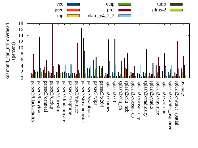 ======= Summary ======= runtime orig rec (overhead) prec (overhead) thp (overhead) ethp (overhead) prcl (overhead) pdarc_v4_2_2 (overhead) ttmo (overhead) plrus-2 (overhead) parsec3/blackscholes 139.369 139.824 (0.33) 139.686 (0.23) 138.843 (-0.38) 139.757 (0.28) 148.172 (6.32) 140.804 (1.03) 139.961 (0.42) 140.909 (1.11) parsec3/bodytrack 125.189 126.156 (0.77) 125.391 (0.16) 124.674 (-0.41) 125.663 (0.38) 141.652 (13.15) 126.620 (1.14) 125.315 (0.10) 126.594 (1.12) parsec3/canneal 218.825 242.697 (10.91) 232.738 (6.36) 182.713 (-16.50) 220.244 (0.65) 228.050 (4.22) 238.202 (8.86) 228.496 (4.42) 231.955 (6.00) parsec3/dedup 18.025 18.196 (0.95) 18.338 (1.74) 17.809 (-1.20) 18.365 (1.89) 20.467 (13.55) 18.511 (2.70) 18.167 (0.79) 18.190 (0.92) parsec3/facesim 349.747 348.418 (-0.38) 347.719 (-0.58) 348.501 (-0.36) 347.358 (-0.68) 358.553 (2.52) 352.702 (0.84) 350.411 (0.19) 352.010 (0.65) parsec3/fluidanimate 342.777 341.979 (-0.23) 343.012 (0.07) 326.092 (-4.87) 332.943 (-2.87) 346.264 (1.02) 335.543 (-2.11) 338.626 (-1.21) 343.351 (0.17) parsec3/freqmine 436.894 436.273 (-0.14) 437.717 (0.19) 436.264 (-0.14) 436.615 (-0.06) 448.046 (2.55) 440.034 (0.72) 439.927 (0.69) 440.755 (0.88) parsec3/raytrace 184.258 186.270 (1.09) 186.760 (1.36) 184.580 (0.17) 183.114 (-0.62) 199.468 (8.25) 186.061 (0.98) 185.697 (0.78) 185.811 (0.84) parsec3/streamcluster 670.526 700.648 (4.49) 689.482 (2.83) 544.907 (-18.73) 612.140 (-8.71) 736.213 (9.80) 682.622 (1.80) 706.794 (5.41) 679.330 (1.31) parsec3/swaptions 220.385 221.534 (0.52) 222.428 (0.93) 221.568 (0.54) 223.048 (1.21) 224.512 (1.87) 222.243 (0.84) 223.184 (1.27) 224.155 (1.71) parsec3/vips 87.709 89.365 (1.89) 88.520 (0.92) 88.341 (0.72) 88.721 (1.15) 91.184 (3.96) 93.386 (6.47) 94.849 (8.14) 95.251 (8.60) parsec3/x264 110.857 116.352 (4.96) 117.613 (6.09) 125.180 (12.92) 119.030 (7.37) 113.993 (2.83) 118.089 (6.52) 123.673 (11.56) 115.950 (4.59) splash2x/barnes 130.810 130.652 (-0.12) 130.669 (-0.11) 119.678 (-8.51) 129.638 (-0.90) 148.398 (13.45) 135.562 (3.63) 133.492 (2.05) 132.949 (1.64) splash2x/fft 61.698 62.611 (1.48) 63.323 (2.63) 48.099 (-22.04) 62.786 (1.76) 65.940 (6.88) 63.759 (3.34) 72.306 (17.19) 71.690 (16.20) splash2x/lu_cb 132.620 133.851 (0.93) 133.470 (0.64) 133.654 (0.78) 133.812 (0.90) 139.281 (5.02) 133.772 (0.87) 134.935 (1.75) 134.574 (1.47) splash2x/lu_ncb 150.007 154.026 (2.68) 153.955 (2.63) 150.198 (0.13) 152.593 (1.72) 154.573 (3.04) 154.756 (3.17) 152.886 (1.92) 152.912 (1.94) splash2x/ocean_cp 84.442 85.645 (1.42) 81.157 (-3.89) 79.192 (-6.22) 84.430 (-0.01) 86.543 (2.49) 83.684 (-0.90) 87.090 (3.14) 89.510 (6.00) splash2x/ocean_ncp 163.955 172.962 (5.49) 173.151 (5.61) 101.538 (-38.07) 155.797 (-4.98) 173.690 (5.94) 174.638 (6.52) 181.342 (10.60) 182.610 (11.38) splash2x/radiosity 142.964 142.713 (-0.18) 143.092 (0.09) 142.185 (-0.55) 142.934 (-0.02) 152.712 (6.82) 144.623 (1.16) 145.372 (1.68) 144.881 (1.34) splash2x/radix 51.391 52.632 (2.42) 53.612 (4.32) 44.360 (-13.68) 51.854 (0.90) 52.482 (2.12) 56.584 (10.10) 58.606 (14.04) 55.673 (8.33) splash2x/raytrace 134.465 135.418 (0.71) 135.078 (0.46) 132.046 (-1.80) 135.952 (1.11) 145.442 (8.16) 135.212 (0.56) 137.379 (2.17) 138.137 (2.73) splash2x/volrend 120.850 121.397 (0.45) 121.526 (0.56) 119.888 (-0.80) 120.397 (-0.37) 126.400 (4.59) 121.569 (0.59) 120.575 (-0.23) 121.445 (0.49) splash2x/water_nsquared 369.913 374.045 (1.12) 373.813 (1.05) 355.624 (-3.86) 365.528 (-1.19) 405.120 (9.52) 376.634 (1.82) 388.735 (5.09) 390.719 (5.62) splash2x/water_spatial 134.592 135.211 (0.46) 134.238 (-0.26) 135.046 (0.34) 134.159 (-0.32) 150.399 (11.74) 136.479 (1.40) 136.136 (1.15) 137.156 (1.91) total 4582.260 4668.860 (1.89) 4646.480 (1.40) 4300.980 (-6.14) 4516.880 (-1.43) 4857.540 (6.01) 4672.070 (1.96) 4723.970 (3.09) 4706.530 (2.71) average 190.928 194.536 (1.75) 193.603 (1.42) 179.207 (-5.10) 188.203 (-0.06) 202.398 (6.24) 194.670 (2.59) 196.832 (3.88) 196.105 (3.62) kdamond_cpu_util orig rec (overhead) prec (overhead) thp (overhead) ethp (overhead) prcl (overhead) pdarc_v4_2_2 (overhead) ttmo (overhead) plrus-2 (overhead) parsec3/blackscholes 0.000 1.727 (1.73) 0.990 (0.99) 0.000 (0.00) 1.393 (1.39) 7.834 (7.83) 2.663 (2.66) 0.000 (0.00) 1.881 (1.88) parsec3/bodytrack 0.000 2.169 (2.17) 0.660 (0.66) 0.000 (0.00) 1.704 (1.70) 13.675 (13.67) 3.113 (3.11) 0.000 (0.00) 2.060 (2.06) parsec3/canneal 0.000 2.497 (2.50) 3.753 (3.75) 0.000 (0.00) 1.756 (1.76) 2.419 (2.42) 5.851 (5.85) 0.000 (0.00) 2.205 (2.21) parsec3/dedup 0.000 1.824 (1.82) 0.736 (0.74) 0.000 (0.00) 1.671 (1.67) 17.802 (17.80) 3.994 (3.99) 0.000 (0.00) 1.101 (1.10) parsec3/facesim 0.000 1.943 (1.94) 0.701 (0.70) 0.000 (0.00) 2.050 (2.05) 4.722 (4.72) 4.180 (4.18) 0.000 (0.00) 1.634 (1.63) parsec3/fluidanimate 0.000 1.789 (1.79) 0.732 (0.73) 0.000 (0.00) 1.371 (1.37) 2.099 (2.10) 4.271 (4.27) 0.000 (0.00) 1.632 (1.63) parsec3/freqmine 0.000 1.676 (1.68) 0.718 (0.72) 0.000 (0.00) 1.343 (1.34) 4.606 (4.61) 3.985 (3.98) 0.000 (0.00) 1.646 (1.65) parsec3/raytrace 0.000 1.723 (1.72) 0.731 (0.73) 0.000 (0.00) 1.445 (1.44) 11.451 (11.45) 2.691 (2.69) 0.000 (0.00) 1.613 (1.61) parsec3/streamcluster 0.000 16.604 (16.60) 11.381 (11.38) 0.000 (0.00) 1.418 (1.42) 13.173 (13.17) 8.861 (8.86) 0.000 (0.00) 1.763 (1.76) parsec3/swaptions 0.000 3.245 (3.25) 0.772 (0.77) 0.000 (0.00) 2.731 (2.73) 3.107 (3.11) 4.100 (4.10) 0.000 (0.00) 0.537 (0.54) parsec3/vips 0.000 5.867 (5.87) 0.719 (0.72) 0.000 (0.00) 3.032 (3.03) 7.032 (7.03) 3.121 (3.12) 0.000 (0.00) 0.444 (0.44) parsec3/x264 0.000 4.028 (4.03) 0.717 (0.72) 0.000 (0.00) 3.143 (3.14) 3.259 (3.26) 3.878 (3.88) 0.000 (0.00) 0.523 (0.52) splash2x/barnes 0.000 1.599 (1.60) 0.791 (0.79) 0.000 (0.00) 1.348 (1.35) 12.669 (12.67) 5.655 (5.66) 0.000 (0.00) 0.529 (0.53) splash2x/fft 0.000 1.797 (1.80) 0.827 (0.83) 0.000 (0.00) 1.495 (1.49) 12.943 (12.94) 4.350 (4.35) 0.000 (0.00) 0.586 (0.59) splash2x/lu_cb 0.000 1.924 (1.92) 0.740 (0.74) 0.000 (0.00) 1.464 (1.46) 5.619 (5.62) 3