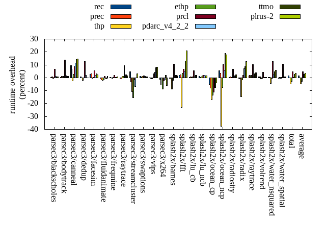 ======= Summary ======= runtime orig rec (overhead) prec (overhead) thp (overhead) ethp (overhead) prcl (overhead) pdarc_v4_2_2 (overhead) ttmo (overhead) plrus-2 (overhead) parsec3/blackscholes 139.308 139.552 (0.18) 140.255 (0.68) 138.476 (-0.60) 139.850 (0.39) 148.704 (6.75) 140.691 (0.99) 139.704 (0.28) 140.158 (0.61) parsec3/bodytrack 124.964 125.393 (0.34) 126.167 (0.96) 124.790 (-0.14) 126.314 (1.08) 142.255 (13.84) 126.888 (1.54) 125.726 (0.61) 126.209 (1.00) parsec3/canneal 207.574 227.158 (9.43) 221.081 (6.51) 202.127 (-2.62) 213.101 (2.66) 225.213 (8.50) 230.963 (11.27) 236.851 (14.10) 238.170 (14.74) parsec3/dedup 18.239 18.351 (0.61) 18.208 (-0.17) 17.888 (-1.93) 18.233 (-0.03) 20.509 (12.44) 18.599 (1.97) 18.221 (-0.10) 18.207 (-0.18) parsec3/facesim 343.105 352.690 (2.79) 353.666 (3.08) 340.881 (-0.65) 343.843 (0.22) 361.609 (5.39) 349.091 (1.74) 354.235 (3.24) 351.576 (2.47) parsec3/fluidanimate 338.886 336.922 (-0.58) 333.318 (-1.64) 332.242 (-1.96) 333.436 (-1.61) 343.151 (1.26) 337.107 (-0.53) 336.171 (-0.80) 342.281 (1.00) parsec3/freqmine 435.867 436.810 (0.22) 436.269 (0.09) 434.732 (-0.26) 437.269 (0.32) 444.874 (2.07) 437.538 (0.38) 437.899 (0.47) 439.262 (0.78) parsec3/raytrace 184.919 183.727 (-0.64) 182.991 (-1.04) 186.893 (1.07) 186.990 (1.12) 202.170 (9.33) 187.243 (1.26) 189.004 (2.21) 187.729 (1.52) parsec3/streamcluster 706.088 740.257 (4.84) 682.186 (-3.39) 629.124 (-10.90) 596.588 (-15.51) 695.075 (-1.56) 658.221 (-6.78) 706.384 (0.04) 726.799 (2.93) parsec3/swaptions 221.101 223.467 (1.07) 221.745 (0.29) 223.644 (1.15) 222.678 (0.71) 224.225 (1.41) 223.269 (0.98) 222.554 (0.66) 222.313 (0.55) parsec3/vips 88.199 88.308 (0.12) 87.957 (-0.27) 87.463 (-0.83) 88.129 (-0.08) 91.008 (3.18) 92.139 (4.47) 95.253 (8.00) 95.410 (8.18) parsec3/x264 121.972 120.377 (-1.31) 115.857 (-5.01) 122.094 (0.10) 111.127 (-8.89) 118.788 (-2.61) 119.949 (-1.66) 124.548 (2.11) 114.635 (-6.02) splash2x/barnes 131.458 130.614 (-0.64) 131.061 (-0.30) 119.727 (-8.92) 128.677 (-2.12) 145.516 (10.69) 133.031 (1.20) 133.762 (1.75) 133.335 (1.43) splash2x/fft 61.109 62.186 (1.76) 62.618 (2.47) 47.052 (-23.00) 63.210 (3.44) 65.132 (6.58) 63.988 (4.71) 69.136 (13.14) 73.964 (21.04) splash2x/lu_cb 132.695 133.316 (0.47) 133.641 (0.71) 133.241 (0.41) 133.724 (0.77) 139.845 (5.39) 133.612 (0.69) 135.501 (2.11) 135.244 (1.92) splash2x/lu_ncb 150.522 151.956 (0.95) 150.889 (0.24) 151.518 (0.66) 152.677 (1.43) 153.317 (1.86) 153.335 (1.87) 153.066 (1.69) 152.770 (1.49) splash2x/ocean_cp 92.856 88.027 (-5.20) 85.468 (-7.96) 77.038 (-17.03) 80.210 (-13.62) 82.522 (-11.13) 86.065 (-7.31) 85.931 (-7.46) 88.963 (-4.19) splash2x/ocean_ncp 160.622 169.723 (5.67) 166.024 (3.36) 100.491 (-37.44) 148.523 (-7.53) 176.924 (10.15) 169.400 (5.47) 190.877 (18.84) 189.337 (17.88) splash2x/radiosity 142.785 143.121 (0.24) 143.664 (0.62) 142.986 (0.14) 143.136 (0.25) 152.282 (6.65) 144.890 (1.47) 144.550 (1.24) 145.897 (2.18) splash2x/radix 52.066 51.784 (-0.54) 51.659 (-0.78) 44.349 (-14.82) 51.129 (-1.80) 53.102 (1.99) 55.834 (7.24) 56.502 (8.52) 58.549 (12.45) splash2x/raytrace 132.945 135.050 (1.58) 135.396 (1.84) 133.757 (0.61) 135.532 (1.95) 146.760 (10.39) 134.089 (0.86) 137.215 (3.21) 137.941 (3.76) splash2x/volrend 120.690 121.412 (0.60) 121.491 (0.66) 119.799 (-0.74) 120.307 (-0.32) 126.096 (4.48) 120.963 (0.23) 121.239 (0.45) 121.215 (0.43) splash2x/water_nsquared 371.353 372.381 (0.28) 372.518 (0.31) 355.373 (-4.30) 367.572 (-1.02) 417.817 (12.51) 380.587 (2.49) 388.754 (4.69) 392.478 (5.69) splash2x/water_spatial 135.023 134.275 (-0.55) 135.332 (0.23) 134.223 (-0.59) 135.316 (0.22) 149.450 (10.69) 135.792 (0.57) 135.680 (0.49) 136.142 (0.83) total 4614.370 4686.880 (1.57) 4609.470 (-0.11) 4399.890 (-4.65) 4477.590 (-2.96) 4826.350 (4.59) 4633.270 (0.41) 4738.750 (2.70) 4768.570 (3.34) average 192.265 195.287 (0.90) 192.061 (0.06) 183.329 (-5.11) 186.566 (-1.58) 201.098 (5.43) 193.053 (1.46) 197.448 (3.31) 198.690 (3.85) kdamond_cpu_util orig rec (overhead) prec (overhead) thp (overhead) ethp (overhead) prcl (overhead) pdarc_v4_2_2 (overhead) ttmo (overhead) plrus-2 (overhead) parsec3/blackscholes 0.000 1.740 (1.74) 0.927 (0.93) 0.000 (0.00) 1.392 (1.39) 7.835 (7.83) 2.720 (2.72) 0.000 (0.00) 1.548 (1.55) parsec3/bodytrack 0.000 2.254 (2.25) 0.685 (0.68) 0.000 (0.00) 1.728 (1.73) 14.308 (14.31) 3.310 (3.31) 0.000 (0.00) 1.550 (1.55) parsec3/canneal 0.000 2.445 (2.44) 3.573 (3.57) 0.000 (0.00) 1.931 (1.93) 2.579 (2.58) 7.432 (7.43) 0.000 (0.00) 1.250 (1.25) parsec3/dedup 0.000 1.989 (1.99) 0.682 (0.68) 0.000 (0.00) 1.605 (1.60) 17.212 (17.21) 4.548 (4.55) 0.000 (0.00) 0.183 (0.18) parsec3/facesim 0.000 1.975 (1.98) 0.701 (0.70) 0.000 (0.00) 2.045 (2.05) 4.872 (4.87) 4.116 (4.12) 0.000 (0.00) 0.546 (0.55) parsec3/fluidanimate 0.000 1.782 (1.78) 0.718 (0.72) 0.000 (0.00) 1.426 (1.43) 2.284 (2.28) 4.266 (4.27) 0.000 (0.00) 0.551 (0.55) parsec3/freqmine 0.000 1.716 (1.72) 0.708 (0.71) 0.000 (0.00) 1.471 (1.47) 4.478 (4.48) 3.907 (3.91) 0.000 (0.00) 0.550 (0.55) parsec3/raytrace 0.000 1.749 (1.75) 0.714 (0.71) 0.000 (0.00) 1.418 (1.42) 11.457 (11.46) 3.723 (3.72) 0.000 (0.00) 0.505 (0.51) parsec3/streamcluster 0.000 17.188 (17.19) 10.978 (10.98) 0.000 (0.00) 1.382 (1.38) 12.401 (12.40) 8.193 (8.19) 0.000 (0.00) 0.973 (0.97) parsec3/swaptions 0.000 3.404 (3.40) 0.696 (0.70) 0.000 (0.00) 2.647 (2.65) 3.243 (3.24) 3.044 (3.04) 0.000 (0.00) 0.531 (0.53) parsec3/vips 0.000 5.076 (5.08) 0.704 (0.70) 0.000 (0.00) 2.660 (2.66) 7.273 (7.27) 2.372 (2.37) 0.000 (0.00) 0.492 (0.49) parsec3/x264 0.000 4.146 (4.15) 0.715 (0.72) 0.000 (0.00) 3.281 (3.28) 3.309 (3.31) 2.733 (2.73) 0.000 (0.00) 0.457 (0.46) splash2x/barnes 0.000 1.572 (1.57) 0.860 (0.86) 0.000 (0.00) 1.300 (1.30) 11.065 (11.06) 4.022 (4.02) 0.000 (0.00) 0.403 (0.40) splash2x/fft 0.000 1.824 (1.82) 0.808 (0.81) 0.000 (0.00) 1.523 (1.52) 13.619 (13.62) 2.493 (2.49) 0.000 (0.00) 0.000 (0.00) splash2x/lu_cb 0.000 1.903 (1.90) 0.716 (0.72) 0.000 (0.00) 1.529 