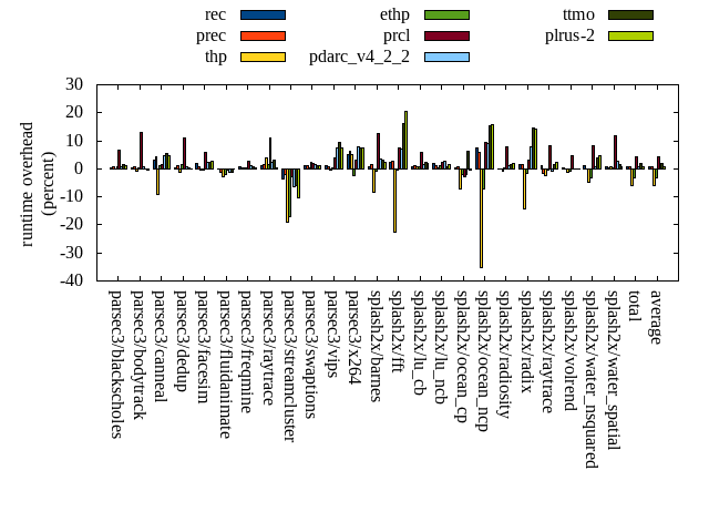 ======= Summary ======= runtime orig rec (overhead) prec (overhead) thp (overhead) ethp (overhead) prcl (overhead) pdarc_v4_2_2 (overhead) ttmo (overhead) plrus-2 (overhead) parsec3/blackscholes 139.073 139.787 (0.51) 139.881 (0.58) 138.729 (-0.25) 140.195 (0.81) 148.426 (6.73) 140.109 (0.75) 141.090 (1.45) 140.642 (1.13) parsec3/bodytrack 125.524 125.967 (0.35) 126.446 (0.73) 124.314 (-0.96) 125.719 (0.16) 141.766 (12.94) 126.399 (0.70) 125.210 (-0.25) 124.782 (-0.59) parsec3/canneal 219.311 226.197 (3.14) 228.701 (4.28) 199.221 (-9.16) 221.471 (0.99) 222.505 (1.46) 229.226 (4.52) 231.655 (5.63) 229.426 (4.61) parsec3/dedup 18.152 18.238 (0.47) 18.387 (1.30) 17.934 (-1.20) 18.416 (1.46) 20.144 (10.98) 18.308 (0.86) 18.184 (0.18) 18.145 (-0.04) parsec3/facesim 344.048 350.410 (1.85) 346.482 (0.71) 342.101 (-0.57) 343.104 (-0.27) 364.638 (5.98) 352.154 (2.36) 351.703 (2.22) 353.036 (2.61) parsec3/fluidanimate 340.476 340.229 (-0.07) 336.331 (-1.22) 330.975 (-2.79) 332.896 (-2.23) 339.294 (-0.35) 336.797 (-1.08) 336.375 (-1.20) 340.715 (0.07) parsec3/freqmine 435.310 438.845 (0.81) 437.045 (0.40) 436.292 (0.23) 436.565 (0.29) 447.689 (2.84) 440.154 (1.11) 438.468 (0.73) 437.635 (0.53) parsec3/raytrace 182.524 184.376 (1.01) 184.995 (1.35) 189.553 (3.85) 185.094 (1.41) 202.841 (11.13) 186.793 (2.34) 187.979 (2.99) 183.383 (0.47) parsec3/streamcluster 729.272 702.250 (-3.71) 715.214 (-1.93) 590.455 (-19.03) 605.050 (-17.03) 707.484 (-2.99) 683.587 (-6.26) 686.935 (-5.81) 652.508 (-10.53) parsec3/swaptions 220.107 222.924 (1.28) 222.583 (1.12) 220.991 (0.40) 225.233 (2.33) 224.008 (1.77) 223.105 (1.36) 222.598 (1.13) 222.597 (1.13) parsec3/vips 87.879 88.997 (1.27) 88.590 (0.81) 87.618 (-0.30) 88.198 (0.36) 91.226 (3.81) 94.463 (7.49) 96.090 (9.34) 94.340 (7.35) parsec3/x264 112.089 117.958 (5.24) 118.928 (6.10) 117.722 (5.03) 109.553 (-2.26) 115.385 (2.94) 121.080 (8.02) 120.305 (7.33) 120.607 (7.60) splash2x/barnes 129.890 130.911 (0.79) 131.972 (1.60) 119.074 (-8.33) 129.001 (-0.68) 146.488 (12.78) 134.191 (3.31) 133.986 (3.15) 133.096 (2.47) splash2x/fft 61.096 62.487 (2.28) 62.828 (2.83) 47.336 (-22.52) 60.740 (-0.58) 65.739 (7.60) 65.308 (6.89) 71.034 (16.27) 73.525 (20.34) splash2x/lu_cb 132.242 133.093 (0.64) 133.727 (1.12) 133.109 (0.66) 133.450 (0.91) 139.884 (5.78) 134.032 (1.35) 135.427 (2.41) 134.798 (1.93) splash2x/lu_ncb 150.517 153.706 (2.12) 152.448 (1.28) 151.234 (0.48) 152.116 (1.06) 154.231 (2.47) 154.551 (2.68) 151.358 (0.56) 152.588 (1.38) splash2x/ocean_cp 84.571 84.941 (0.44) 85.234 (0.78) 78.590 (-7.07) 82.749 (-2.15) 82.225 (-2.77) 83.013 (-1.84) 89.939 (6.35) 84.329 (-0.29) splash2x/ocean_ncp 158.779 170.622 (7.46) 168.156 (5.91) 102.639 (-35.36) 147.632 (-7.02) 173.871 (9.51) 173.246 (9.11) 183.307 (15.45) 183.684 (15.69) splash2x/radiosity 142.990 143.010 (0.01) 142.688 (-0.21) 142.020 (-0.68) 143.331 (0.24) 153.967 (7.68) 144.871 (1.32) 145.369 (1.66) 145.668 (1.87) splash2x/radix 51.563 52.276 (1.38) 52.411 (1.64) 44.217 (-14.25) 50.732 (-1.61) 53.163 (3.10) 55.582 (7.79) 59.155 (14.72) 58.780 (14.00) splash2x/raytrace 135.836 137.245 (1.04) 133.494 (-1.72) 132.334 (-2.58) 135.392 (-0.33) 146.840 (8.10) 134.596 (-0.91) 138.001 (1.59) 139.021 (2.34) splash2x/volrend 120.950 121.196 (0.20) 120.944 (-0.01) 119.369 (-1.31) 120.029 (-0.76) 126.466 (4.56) 120.724 (-0.19) 120.962 (0.01) 121.058 (0.09) splash2x/water_nsquared 372.884 377.265 (1.17) 372.134 (-0.20) 354.571 (-4.91) 361.553 (-3.04) 403.674 (8.26) 376.220 (0.89) 387.736 (3.98) 390.470 (4.72) splash2x/water_spatial 133.929 134.689 (0.57) 134.414 (0.36) 135.095 (0.87) 134.394 (0.35) 149.630 (11.72) 137.745 (2.85) 136.191 (1.69) 134.774 (0.63) total 4629.010 4657.640 (0.62) 4654.010 (0.54) 4355.470 (-5.91) 4482.600 (-3.16) 4821.570 (4.16) 4666.230 (0.80) 4709.070 (1.73) 4669.620 (0.88) average 192.875 194.068 (1.26) 193.917 (1.15) 181.478 (-4.99) 186.775 (-1.15) 200.899 (5.67) 194.426 (2.31) 196.211 (3.82) 194.567 (3.31) kdamond_cpu_util orig rec (overhead) prec (overhead) thp (overhead) ethp (overhead) prcl (overhead) pdarc_v4_2_2 (overhead) ttmo (overhead) plrus-2 (overhead) parsec3/blackscholes 0.000 1.735 (1.73) 0.953 (0.95) 0.000 (0.00) 1.338 (1.34) 7.310 (7.31) 3.109 (3.11) 0.000 (0.00) 2.072 (2.07) parsec3/bodytrack 0.000 2.226 (2.23) 0.706 (0.71) 0.000 (0.00) 1.612 (1.61) 14.014 (14.01) 3.221 (3.22) 0.000 (0.00) 1.998 (2.00) parsec3/canneal 0.000 2.401 (2.40) 1.929 (1.93) 0.000 (0.00) 1.829 (1.83) 2.460 (2.46) 6.831 (6.83) 0.000 (0.00) 0.936 (0.94) parsec3/dedup 0.000 1.708 (1.71) 0.693 (0.69) 0.000 (0.00) 1.438 (1.44) 17.874 (17.87) 4.360 (4.36) 0.000 (0.00) 0.390 (0.39) parsec3/facesim 0.000 1.931 (1.93) 0.775 (0.77) 0.000 (0.00) 1.980 (1.98) 4.764 (4.76) 4.119 (4.12) 0.000 (0.00) 0.528 (0.53) parsec3/fluidanimate 0.000 1.787 (1.79) 0.736 (0.74) 0.000 (0.00) 1.372 (1.37) 1.920 (1.92) 4.264 (4.26) 0.000 (0.00) 0.534 (0.53) parsec3/freqmine 0.000 1.945 (1.94) 0.710 (0.71) 0.000 (0.00) 1.457 (1.46) 4.617 (4.62) 3.904 (3.90) 0.000 (0.00) 0.546 (0.55) parsec3/raytrace 0.000 1.729 (1.73) 0.729 (0.73) 0.000 (0.00) 1.363 (1.36) 11.467 (11.47) 3.240 (3.24) 0.000 (0.00) 0.525 (0.53) parsec3/streamcluster 0.000 16.786 (16.79) 6.585 (6.58) 0.000 (0.00) 1.329 (1.33) 13.013 (13.01) 8.200 (8.20) 0.000 (0.00) 0.697 (0.70) parsec3/swaptions 0.000 3.349 (3.35) 0.693 (0.69) 0.000 (0.00) 2.689 (2.69) 3.125 (3.12) 4.076 (4.08) 0.000 (0.00) 0.550 (0.55) parsec3/vips 0.000 5.654 (5.65) 0.687 (0.69) 0.000 (0.00) 3.033 (3.03) 7.291 (7.29) 3.111 (3.11) 0.000 (0.00) 0.500 (0.50) parsec3/x264 0.000 3.982 (3.98) 0.725 (0.72) 0.000 (0.00) 3.246 (3.25) 3.217 (3.22) 3.768 (3.77) 0.000 (0.00) 0.507 (0.51) splash2x/barnes 0.000 1.559 (1.56) 0.797 (0.80) 0.000 (0.00) 1.303 (1.30) 11.935 (11.93) 5.042 (5.04) 0.000 (0.00) 0.527 (0.53) splash2x/fft 0.000 1.842 (1.84) 0.796 (0.80) 0.000 (0.00) 1.495 (1.50) 12.097 (12.10) 6.264 (6.26) 0.000 (0.00) 0.546 (0.55) splash2x/lu_cb 0.000 1.899 (1.90) 0.715 (0.72) 0.000 (0.00) 1.530 (1.53) 5.929 (