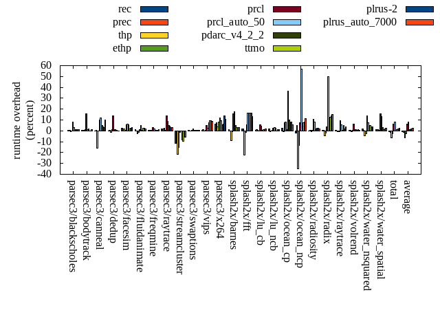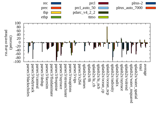 ======= Summary ======= runtime orig rec (overhead) prec (overhead) thp (overhead) ethp (overhead) prcl (overhead) prcl_auto_50 (overhead) pdarc_v4_2_2 (overhead) ttmo (overhead) plrus-2 (overhead) plrus_auto_7000 (overhead) parsec3/blackscholes 139.221 139.711 (0.35) 139.869 (0.47) 138.429 (-0.57) 138.974 (-0.18) 150.270 (7.94) 143.276 (2.91) 140.454 (0.89) 139.881 (0.47) 140.461 (0.89) 140.449 (0.88) parsec3/bodytrack 124.857 125.367 (0.41) 125.836 (0.78) 125.205 (0.28) 126.333 (1.18) 144.719 (15.91) 126.658 (1.44) 127.431 (2.06) 124.387 (-0.38) 124.961 (0.08) 126.086 (0.98) parsec3/canneal 214.068 213.743 (-0.15) 214.555 (0.23) 179.869 (-15.98) 213.859 (-0.10) 235.064 (9.81) 240.101 (12.16) 224.280 (4.77) 222.565 (3.97) 220.779 (3.13) 234.980 (9.77) parsec3/dedup 18.252 18.178 (-0.41) 18.330 (0.43) 18.005 (-1.36) 18.458 (1.13) 20.752 (13.70) 18.244 (-0.04) 18.482 (1.26) 18.391 (0.76) 18.242 (-0.05) 18.185 (-0.37) parsec3/facesim 340.588 347.907 (2.15) 346.088 (1.61) 346.287 (1.67) 341.768 (0.35) 360.432 (5.83) 362.736 (6.50) 360.489 (5.84) 346.833 (1.83) 349.716 (2.68) 350.796 (3.00) parsec3/fluidanimate 335.020 339.627 (1.38) 334.049 (-0.29) 325.783 (-2.76) 331.290 (-1.11) 339.185 (1.24) 350.738 (4.69) 336.043 (0.31) 342.598 (2.26) 342.357 (2.19) 340.881 (1.75) parsec3/freqmine 434.793 437.001 (0.51) 435.592 (0.18) 435.726 (0.21) 437.355 (0.59) 446.709 (2.74) 442.789 (1.84) 436.783 (0.46) 435.791 (0.23) 437.750 (0.68) 439.896 (1.17) parsec3/raytrace 181.133 184.159 (1.67) 184.066 (1.62) 185.221 (2.26) 182.441 (0.72) 206.006 (13.73) 197.478 (9.02) 189.988 (4.89) 188.899 (4.29) 186.811 (3.13) 186.348 (2.88) parsec3/streamcluster 718.382 637.473 (-11.26) 634.959 (-11.61) 563.265 (-21.59) 609.861 (-15.11) 709.940 (-1.18) 717.663 (-0.10) 660.029 (-8.12) 650.791 (-9.41) 675.096 (-6.03) 676.532 (-5.83) parsec3/swaptions 221.298 222.798 (0.68) 221.196 (-0.05) 220.909 (-0.18) 221.821 (0.24) 225.581 (1.94) 222.571 (0.58) 221.866 (0.26) 222.602 (0.59) 222.016 (0.32) 222.042 (0.34) parsec3/vips 87.685 88.209 (0.60) 88.562 (1.00) 87.674 (-0.01) 88.279 (0.68) 91.921 (4.83) 89.851 (2.47) 94.413 (7.67) 95.880 (9.35) 96.146 (9.65) 95.203 (8.57) parsec3/x264 109.045 115.977 (6.36) 117.122 (7.41) 112.995 (3.62) 117.996 (8.21) 122.244 (12.10) 119.106 (9.23) 114.973 (5.44) 116.145 (6.51) 123.990 (13.71) 120.821 (10.80) splash2x/barnes 129.793 131.341 (1.19) 129.828 (0.03) 118.228 (-8.91) 128.548 (-0.96) 150.347 (15.84) 152.458 (17.46) 136.265 (4.99) 133.563 (2.90) 132.661 (2.21) 133.886 (3.15) splash2x/fft 60.888 62.143 (2.06) 61.947 (1.74) 47.349 (-22.24) 60.065 (-1.35) 64.399 (5.77) 70.898 (16.44) 63.767 (4.73) 70.674 (16.07) 70.799 (16.28) 68.782 (12.97) splash2x/lu_cb 132.661 133.519 (0.65) 134.371 (1.29) 132.913 (0.19) 132.854 (0.15) 140.037 (5.56) 138.135 (4.13) 133.317 (0.49) 134.148 (1.12) 134.087 (1.08) 134.938 (1.72) splash2x/lu_ncb 151.036 153.644 (1.73) 150.130 (-0.60) 150.693 (-0.23) 152.037 (0.66) 154.945 (2.59) 155.806 (3.16) 154.587 (2.35) 150.777 (-0.17) 152.382 (0.89) 152.635 (1.06) splash2x/ocean_cp 79.183 81.269 (2.63) 78.461 (-0.91) 85.049 (7.41) 85.809 (8.37) 80.121 (1.18) 108.122 (36.55) 87.124 (10.03) 80.712 (1.93) 85.724 (8.26) 83.455 (5.39) splash2x/ocean_ncp 162.778 159.260 (-2.16) 170.992 (5.05) 105.649 (-35.10) 141.060 (-13.34) 175.306 (7.70) 254.870 (56.58) 163.187 (0.25) 175.227 (7.65) 175.709 (7.94) 181.090 (11.25) splash2x/radiosity 142.534 142.281 (-0.18) 143.554 (0.72) 141.704 (-0.58) 143.132 (0.42) 157.329 (10.38) 154.451 (8.36) 145.298 (1.94) 145.893 (2.36) 145.967 (2.41) 145.235 (1.89) splash2x/radix 50.618 50.974 (0.70) 50.879 (0.52) 48.213 (-4.75) 49.584 (-2.04) 52.563 (3.84) 75.738 (49.62) 55.584 (9.81) 56.914 (12.44) 57.748 (14.09) 58.118 (14.82) splash2x/raytrace 134.560 135.561 (0.74) 134.165 (-0.29) 133.297 (-0.94) 133.273 (-0.96) 147.019 (9.26) 142.348 (5.79) 135.362 (0.60) 141.160 (4.91) 137.129 (1.91) 139.559 (3.72) splash2x/volrend 120.102 120.895 (0.66) 120.433 (0.28) 119.270 (-0.69) 120.388 (0.24) 127.442 (6.11) 120.470 (0.31) 121.367 (1.05) 120.565 (0.39) 121.479 (1.15) 121.078 (0.81) splash2x/water_nsquared 370.425 375.952 (1.49) 372.282 (0.50) 353.773 (-4.50) 360.170 (-2.77) 420.719 (13.58) 398.949 (7.70) 374.948 (1.22) 388.704 (4.93) 384.538 (3.81) 384.798 (3.88) splash2x/water_spatial 133.187 134.833 (1.24) 134.571 (1.04) 134.636 (1.09) 133.846 (0.49) 153.803 (15.48) 151.093 (13.44) 137.321 (3.10) 134.779 (1.20) 135.734 (1.91) 136.760 (2.68) total 4592.110 4551.810 (-0.88) 4541.830 (-1.09) 4310.130 (-6.14) 4469.190 (-2.68) 4876.860 (6.20) 4954.550 (7.89) 4633.360 (0.90) 4637.870 (1.00) 4672.300 (1.75) 4692.550 (2.19) average 191.338 189.659 (0.54) 189.243 (0.46) 179.589 (-4.32) 186.216 (-0.60) 203.202 (7.74) 206.440 (11.26) 193.057 (2.76) 193.245 (3.17) 194.679 (3.85) 195.523 (4.05) kdamond_cpu_util orig rec (overhead) prec (overhead) thp (overhead) ethp (overhead) prcl (overhead) prcl_auto_50 (overhead) pdarc_v4_2_2 (overhead) ttmo (overhead) plrus-2 (overhead) plrus_auto_7000 (overhead) parsec3/blackscholes 0.000 1.704 (1.70) 0.911 (0.91) 0.000 (0.00) 1.702 (1.70) 9.619 (9.62) 4.208 (4.21) 3.298 (3.30) 0.000 (0.00) 2.462 (2.46) 2.164 (2.16) parsec3/bodytrack 0.000 2.138 (2.14) 0.848 (0.85) 0.000 (0.00) 2.207 (2.21) 17.797 (17.80) 3.483 (3.48) 3.812 (3.81) 0.000 (0.00) 2.419 (2.42) 2.090 (2.09) parsec3/canneal 0.000 2.362 (2.36) 2.400 (2.40) 0.000 (0.00) 2.268 (2.27) 3.273 (3.27) 5.254 (5.25) 6.536 (6.54) 0.000 (0.00) 3.816 (3.82) 3.348 (3.35) parsec3/dedup 0.000 2.105 (2.10) 0.838 (0.84) 0.000 (0.00) 1.923 (1.92) 21.377 (21.38) 1.886 (1.89) 4.880 (4.88) 0.000 (0.00) 1.650 (1.65) 0.878 (0.88) parsec3/facesim 0.000 1.917 (1.92) 0.880 (0.88) 0.000 (0.00) 2.471 (2.47) 5.433 (5.43) 5.294 (5.29) 5.181 (5.18) 0.000 (0.00) 2.637 (2.64) 1.717 (1.72) parsec3/fluidanimate 0.000 1.743 (1.74) 0.908 (0.91) 0.000 (0.00) 1.683 (1.68) 2.666 (2.67) 1.950 (1.95) 5.039 (5.04) 0.000 (0.00) 2.563 (2.56) 2.151 (2.15) parsec3/freqmine 0.000 1.723 (1.72) 0.895 (0.89) 0.00