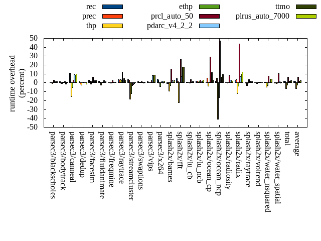 ======= Summary ======= runtime orig rec (overhead) prec (overhead) thp (overhead) ethp (overhead) prcl_auto_50 (overhead) pdarc_v4_2_2 (overhead) ttmo (overhead) plrus_auto_7000 (overhead) parsec3/blackscholes 139.363 139.895 (0.38) 139.759 (0.28) 138.558 (-0.58) 139.776 (0.30) 143.839 (3.21) 141.058 (1.22) 139.628 (0.19) 141.064 (1.22) parsec3/bodytrack 125.668 127.164 (1.19) 125.136 (-0.42) 124.557 (-0.88) 126.619 (0.76) 126.847 (0.94) 127.771 (1.67) 124.008 (-1.32) 126.983 (1.05) parsec3/canneal 213.613 236.774 (10.84) 216.637 (1.42) 180.760 (-15.38) 202.188 (-5.35) 220.571 (3.26) 233.616 (9.36) 232.567 (8.87) 234.465 (9.76) parsec3/dedup 18.407 18.676 (1.46) 18.143 (-1.43) 17.969 (-2.38) 18.414 (0.04) 18.575 (0.92) 18.470 (0.35) 18.413 (0.04) 18.191 (-1.17) parsec3/facesim 341.518 351.494 (2.92) 348.836 (2.14) 337.270 (-1.24) 346.804 (1.55) 364.068 (6.60) 347.496 (1.75) 350.322 (2.58) 349.713 (2.40) parsec3/fluidanimate 335.518 343.089 (2.26) 337.452 (0.58) 326.590 (-2.66) 336.518 (0.30) 338.795 (0.98) 343.538 (2.39) 336.439 (0.27) 339.363 (1.15) parsec3/freqmine 436.315 437.338 (0.23) 436.378 (0.01) 434.093 (-0.51) 435.722 (-0.14) 446.614 (2.36) 440.023 (0.85) 436.582 (0.06) 439.973 (0.84) parsec3/raytrace 178.822 184.951 (3.43) 183.955 (2.87) 185.744 (3.87) 183.465 (2.60) 200.040 (11.87) 184.585 (3.22) 187.499 (4.85) 183.706 (2.73) parsec3/streamcluster 689.929 714.174 (3.51) 709.582 (2.85) 563.475 (-18.33) 605.584 (-12.23) 668.373 (-3.12) 676.360 (-1.97) 683.873 (-0.88) 691.556 (0.24) parsec3/swaptions 220.869 223.651 (1.26) 222.619 (0.79) 222.515 (0.75) 223.324 (1.11) 224.037 (1.43) 223.094 (1.01) 220.699 (-0.08) 222.193 (0.60) parsec3/vips 87.676 88.689 (1.15) 88.013 (0.38) 88.087 (0.47) 87.811 (0.15) 89.685 (2.29) 94.795 (8.12) 95.093 (8.46) 95.292 (8.69) parsec3/x264 116.882 121.637 (4.07) 119.635 (2.35) 116.862 (-0.02) 111.976 (-4.20) 117.175 (0.25) 119.512 (2.25) 116.255 (-0.54) 119.000 (1.81) splash2x/barnes 132.034 130.659 (-1.04) 130.598 (-1.09) 119.996 (-9.12) 128.211 (-2.90) 152.608 (15.58) 135.216 (2.41) 132.207 (0.13) 135.626 (2.72) splash2x/fft 60.389 63.220 (4.69) 61.677 (2.13) 46.947 (-22.26) 60.650 (0.43) 76.403 (26.52) 64.558 (6.90) 71.003 (17.58) 71.245 (17.98) splash2x/lu_cb 133.080 134.162 (0.81) 133.631 (0.41) 133.146 (0.05) 132.945 (-0.10) 137.913 (3.63) 134.372 (0.97) 134.611 (1.15) 135.139 (1.55) splash2x/lu_ncb 149.709 152.361 (1.77) 152.925 (2.15) 151.117 (0.94) 152.975 (2.18) 154.612 (3.28) 152.877 (2.12) 152.942 (2.16) 154.566 (3.24) splash2x/ocean_cp 78.800 79.179 (0.48) 83.034 (5.37) 75.880 (-3.71) 79.497 (0.88) 101.939 (29.36) 82.531 (4.74) 88.119 (11.83) 81.462 (3.38) splash2x/ocean_ncp 167.962 170.846 (1.72) 177.289 (5.55) 98.976 (-41.07) 140.391 (-16.42) 247.534 (47.37) 168.139 (0.11) 178.580 (6.32) 183.946 (9.52) splash2x/radiosity 142.088 142.820 (0.52) 142.583 (0.35) 141.918 (-0.12) 142.630 (0.38) 153.806 (8.25) 146.413 (3.04) 145.374 (2.31) 144.719 (1.85) splash2x/radix 51.938 53.211 (2.45) 53.729 (3.45) 45.639 (-12.13) 50.102 (-3.53) 74.777 (43.97) 55.749 (7.34) 57.045 (9.83) 58.264 (12.18) splash2x/raytrace 134.903 134.755 (-0.11) 134.521 (-0.28) 130.943 (-2.94) 134.795 (-0.08) 139.854 (3.67) 137.250 (1.74) 136.242 (0.99) 136.773 (1.39) splash2x/volrend 120.203 120.610 (0.34) 120.432 (0.19) 119.449 (-0.63) 120.269 (0.05) 121.080 (0.73) 120.949 (0.62) 120.457 (0.21) 120.849 (0.54) splash2x/water_nsquared 372.078 374.975 (0.78) 375.769 (0.99) 354.592 (-4.70) 360.735 (-3.05) 400.648 (7.68) 372.656 (0.16) 388.491 (4.41) 387.310 (4.09) splash2x/water_spatial 135.366 135.024 (-0.25) 135.075 (-0.21) 134.584 (-0.58) 134.612 (-0.56) 149.853 (10.70) 138.369 (2.22) 135.153 (-0.16) 136.636 (0.94) total 4583.130 4679.350 (2.10) 4647.390 (1.40) 4289.680 (-6.40) 4455.980 (-2.77) 4869.630 (6.25) 4659.400 (1.66) 4681.580 (2.15) 4708.040 (2.73) average 190.964 194.973 (1.87) 193.641 (1.29) 178.737 (-5.55) 185.666 (-1.58) 202.901 (9.66) 194.142 (2.61) 195.066 (3.30) 196.168 (3.69) kdamond_cpu_util orig rec (overhead) prec (overhead) thp (overhead) ethp (overhead) prcl_auto_50 (overhead) pdarc_v4_2_2 (overhead) ttmo (overhead) plrus_auto_7000 (overhead) parsec3/blackscholes 0.000 1.775 (1.78) 0.897 (0.90) 0.000 (0.00) 1.824 (1.82) 4.146 (4.15) 3.109 (3.11) 0.000 (0.00) 2.154 (2.15) parsec3/bodytrack 0.000 2.128 (2.13) 0.856 (0.86) 0.000 (0.00) 2.098 (2.10) 3.451 (3.45) 4.083 (4.08) 0.000 (0.00) 2.037 (2.04) parsec3/canneal 0.000 2.414 (2.41) 3.950 (3.95) 0.000 (0.00) 2.317 (2.32) 5.148 (5.15) 6.436 (6.44) 0.000 (0.00) 4.189 (4.19) parsec3/dedup 0.000 2.312 (2.31) 0.892 (0.89) 0.000 (0.00) 1.822 (1.82) 1.860 (1.86) 4.874 (4.87) 0.000 (0.00) 0.892 (0.89) parsec3/facesim 0.000 1.919 (1.92) 0.877 (0.88) 0.000 (0.00) 2.455 (2.46) 4.873 (4.87) 5.203 (5.20) 0.000 (0.00) 2.079 (2.08) parsec3/fluidanimate 0.000 1.759 (1.76) 0.893 (0.89) 0.000 (0.00) 1.670 (1.67) 1.815 (1.81) 5.216 (5.22) 0.000 (0.00) 2.147 (2.15) parsec3/freqmine 0.000 1.900 (1.90) 0.866 (0.87) 0.000 (0.00) 1.756 (1.76) 5.021 (5.02) 4.944 (4.94) 0.000 (0.00) 2.360 (2.36) parsec3/raytrace 0.000 1.284 (1.28) 0.902 (0.90) 0.000 (0.00) 1.685 (1.68) 8.804 (8.80) 3.094 (3.09) 0.000 (0.00) 2.187 (2.19) parsec3/streamcluster 0.000 14.844 (14.84) 8.729 (8.73) 0.000 (0.00) 1.625 (1.62) 15.430 (15.43) 10.244 (10.24) 0.000 (0.00) 4.566 (4.57) parsec3/swaptions 0.000 3.351 (3.35) 0.874 (0.87) 0.000 (0.00) 3.220 (3.22) 3.154 (3.15) 4.961 (4.96) 0.000 (0.00) 1.749 (1.75) parsec3/vips 0.000 5.379 (5.38) 0.857 (0.86) 0.000 (0.00) 3.393 (3.39) 6.258 (6.26) 3.542 (3.54) 0.000 (0.00) 1.790 (1.79) parsec3/x264 0.000 3.947 (3.95) 0.862 (0.86) 0.000 (0.00) 3.740 (3.74) 4.142 (4.14) 3.668 (3.67) 0.000 (0.00) 2.045 (2.05) splash2x/barnes 0.000 1.540 (1.54) 1.051 (1.05) 0.000 (0.00) 1.557 (1.56) 17.134 (17.13) 6.682 (6.68) 0.000 (0.00) 1.823 (1.82) splash2x/fft 0.000 1.807 (1.81) 0.996 (1.00) 0.000 (0.00) 1.813 (1.81) 39.987 (39.99) 4.707 (4.71) 0.000 (0.00) 1.855 (1.86) splash2x/lu_cb 0.000 1.871 (1.87) 0.898 (0.90) 0.000 (0.