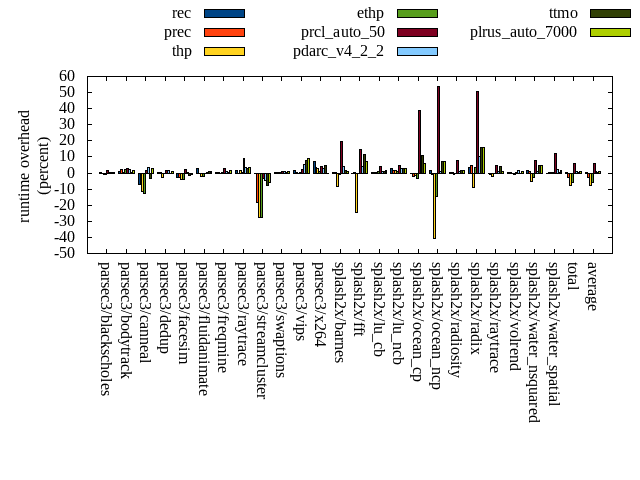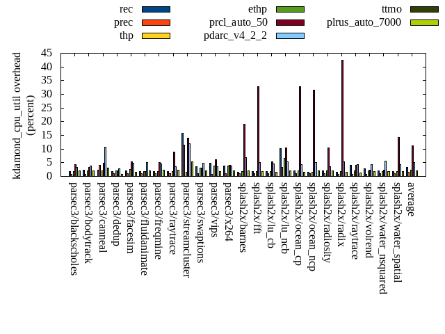 ======= Summary ======= runtime orig rec (overhead) prec (overhead) thp (overhead) ethp (overhead) prcl_auto_50 (overhead) pdarc_v4_2_2 (overhead) ttmo (overhead) plrus_auto_7000 (overhead) parsec3/blackscholes 139.766 139.928 (0.12) 139.407 (-0.26) 138.715 (-0.75) 138.933 (-0.60) 142.082 (1.66) 140.420 (0.47) 140.091 (0.23) 140.338 (0.41) parsec3/bodytrack 124.030 125.480 (1.17) 126.579 (2.06) 124.820 (0.64) 126.466 (1.96) 127.415 (2.73) 126.579 (2.06) 124.816 (0.63) 126.346 (1.87) parsec3/canneal 227.031 210.856 (-7.12) 220.016 (-3.09) 200.794 (-11.56) 198.603 (-12.52) 230.654 (1.60) 234.395 (3.24) 219.919 (-3.13) 232.939 (2.60) parsec3/dedup 18.262 18.291 (0.16) 18.368 (0.58) 17.812 (-2.46) 18.266 (0.02) 18.576 (1.72) 18.605 (1.88) 18.235 (-0.15) 18.494 (1.27) parsec3/facesim 354.589 344.425 (-2.87) 345.255 (-2.63) 339.340 (-4.30) 341.292 (-3.75) 363.003 (2.37) 355.258 (0.19) 349.198 (-1.52) 350.815 (-1.06) parsec3/fluidanimate 337.531 346.921 (2.78) 335.566 (-0.58) 329.600 (-2.35) 330.579 (-2.06) 337.187 (-0.10) 339.710 (0.65) 340.030 (0.74) 340.144 (0.77) parsec3/freqmine 434.759 437.266 (0.58) 436.427 (0.38) 433.692 (-0.25) 437.044 (0.53) 447.094 (2.84) 438.958 (0.97) 437.114 (0.54) 440.681 (1.36) parsec3/raytrace 181.965 184.350 (1.31) 180.886 (-0.59) 184.521 (1.40) 182.839 (0.48) 198.532 (9.10) 188.424 (3.55) 187.058 (2.80) 188.161 (3.41) parsec3/streamcluster 751.115 747.311 (-0.51) 611.806 (-18.55) 542.674 (-27.75) 543.040 (-27.70) 724.298 (-3.57) 714.965 (-4.81) 692.341 (-7.82) 709.026 (-5.60) parsec3/swaptions 220.650 221.619 (0.44) 221.605 (0.43) 221.027 (0.17) 221.999 (0.61) 223.272 (1.19) 222.413 (0.80) 221.006 (0.16) 222.311 (0.75) parsec3/vips 87.781 89.069 (1.47) 88.318 (0.61) 87.262 (-0.59) 88.292 (0.58) 89.783 (2.28) 92.251 (5.09) 94.772 (7.96) 95.589 (8.90) parsec3/x264 113.098 121.540 (7.46) 117.182 (3.61) 116.044 (2.60) 113.893 (0.70) 117.978 (4.31) 116.006 (2.57) 118.739 (4.99) 112.448 (-0.57) splash2x/barnes 130.896 131.178 (0.22) 131.237 (0.26) 120.187 (-8.18) 129.743 (-0.88) 156.419 (19.50) 135.897 (3.82) 133.173 (1.74) 132.028 (0.86) splash2x/fft 62.078 61.737 (-0.55) 62.378 (0.48) 46.756 (-24.68) 62.052 (-0.04) 71.271 (14.81) 64.705 (4.23) 69.354 (11.72) 66.640 (7.35) splash2x/lu_cb 132.500 132.705 (0.16) 132.661 (0.12) 132.795 (0.22) 133.427 (0.70) 137.977 (4.13) 133.850 (1.02) 133.811 (0.99) 134.671 (1.64) splash2x/lu_ncb 148.614 152.694 (2.75) 151.043 (1.63) 150.746 (1.43) 149.851 (0.83) 155.171 (4.41) 153.022 (2.97) 153.265 (3.13) 152.859 (2.86) splash2x/ocean_cp 80.050 79.726 (-0.40) 78.578 (-1.84) 78.808 (-1.55) 77.409 (-3.30) 110.952 (38.60) 82.725 (3.34) 88.597 (10.68) 84.945 (6.12) splash2x/ocean_ncp 164.711 167.434 (1.65) 162.781 (-1.17) 97.713 (-40.68) 140.712 (-14.57) 253.416 (53.86) 165.890 (0.72) 176.970 (7.44) 176.550 (7.19) splash2x/radiosity 142.781 143.111 (0.23) 143.307 (0.37) 141.643 (-0.80) 142.571 (-0.15) 154.146 (7.96) 144.495 (1.20) 144.890 (1.48) 145.396 (1.83) splash2x/radix 49.773 51.625 (3.72) 52.218 (4.91) 45.437 (-8.71) 51.431 (3.33) 74.875 (50.43) 54.753 (10.01) 57.545 (15.62) 57.740 (16.01) splash2x/raytrace 135.163 135.018 (-0.11) 133.638 (-1.13) 132.268 (-2.14) 134.552 (-0.45) 141.846 (4.94) 136.455 (0.96) 140.999 (4.32) 136.483 (0.98) splash2x/volrend 120.137 120.651 (0.43) 120.423 (0.24) 119.464 (-0.56) 119.314 (-0.69) 120.352 (0.18) 121.952 (1.51) 120.066 (-0.06) 121.036 (0.75) splash2x/water_nsquared 369.127 374.597 (1.48) 373.747 (1.25) 349.776 (-5.24) 358.325 (-2.93) 397.374 (7.65) 373.767 (1.26) 386.405 (4.68) 386.158 (4.61) splash2x/water_spatial 134.179 133.661 (-0.39) 135.047 (0.65) 134.640 (0.34) 134.893 (0.53) 150.476 (12.15) 137.453 (2.44) 134.898 (0.54) 136.529 (1.75) total 4660.580 4671.190 (0.23) 4518.490 (-3.05) 4286.530 (-8.03) 4375.500 (-6.12) 4944.150 (6.08) 4692.940 (0.69) 4683.290 (0.49) 4708.350 (1.02) average 194.191 194.633 (0.59) 188.270 (-0.51) 178.605 (-5.66) 182.312 (-2.47) 206.006 (10.20) 195.539 (2.09) 195.137 (2.82) 196.181 (2.75) kdamond_cpu_util orig rec (overhead) prec (overhead) thp (overhead) ethp (overhead) prcl_auto_50 (overhead) pdarc_v4_2_2 (overhead) ttmo (overhead) plrus_auto_7000 (overhead) parsec3/blackscholes 0.000 1.754 (1.75) 0.881 (0.88) 0.000 (0.00) 1.729 (1.73) 4.266 (4.27) 3.331 (3.33) 0.000 (0.00) 2.047 (2.05) parsec3/bodytrack 0.000 2.192 (2.19) 0.861 (0.86) 0.000 (0.00) 2.123 (2.12) 3.421 (3.42) 3.712 (3.71) 0.000 (0.00) 1.947 (1.95) parsec3/canneal 0.000 2.343 (2.34) 4.000 (4.00) 0.000 (0.00) 2.136 (2.14) 4.842 (4.84) 10.621 (10.62) 0.000 (0.00) 2.964 (2.96) parsec3/dedup 0.000 1.891 (1.89) 0.901 (0.90) 0.000 (0.00) 1.947 (1.95) 1.994 (1.99) 2.902 (2.90) 0.000 (0.00) 0.811 (0.81) parsec3/facesim 0.000 1.930 (1.93) 0.904 (0.90) 0.000 (0.00) 2.505 (2.51) 5.224 (5.22) 4.754 (4.75) 0.000 (0.00) 1.616 (1.62) parsec3/fluidanimate 0.000 1.728 (1.73) 0.910 (0.91) 0.000 (0.00) 1.692 (1.69) 1.859 (1.86) 5.000 (5.00) 0.000 (0.00) 1.915 (1.92) parsec3/freqmine 0.000 1.733 (1.73) 0.900 (0.90) 0.000 (0.00) 1.740 (1.74) 4.986 (4.99) 4.468 (4.47) 0.000 (0.00) 2.301 (2.30) parsec3/raytrace 0.000 1.654 (1.65) 0.896 (0.90) 0.000 (0.00) 1.681 (1.68) 8.823 (8.82) 3.680 (3.68) 0.000 (0.00) 2.208 (2.21) parsec3/streamcluster 0.000 15.871 (15.87) 11.412 (11.41) 0.000 (0.00) 1.586 (1.59) 14.023 (14.02) 11.980 (11.98) 0.000 (0.00) 5.252 (5.25) parsec3/swaptions 0.000 3.486 (3.49) 0.916 (0.92) 0.000 (0.00) 3.066 (3.07) 2.998 (3.00) 4.757 (4.76) 0.000 (0.00) 1.945 (1.95) parsec3/vips 0.000 4.922 (4.92) 0.881 (0.88) 0.000 (0.00) 3.771 (3.77) 6.094 (6.09) 3.590 (3.59) 0.000 (0.00) 1.821 (1.82) parsec3/x264 0.000 3.933 (3.93) 0.892 (0.89) 0.000 (0.00) 3.925 (3.92) 4.116 (4.12) 3.755 (3.75) 0.000 (0.00) 1.957 (1.96) splash2x/barnes 0.000 1.617 (1.62) 1.001 (1.00) 0.000 (0.00) 1.666 (1.67) 19.102 (19.10) 6.772 (6.77) 0.000 (0.00) 1.919 (1.92) splash2x/fft 0.000 1.763 (1.76) 0.994 (0.99) 0.000 (0.00) 1.827 (1.83) 32.845 (32.85) 5.010 (5.01) 0.000 (0.00) 1.744 (1.74) splash2x/lu_cb 0.000 1.866 (1.87) 0.89
