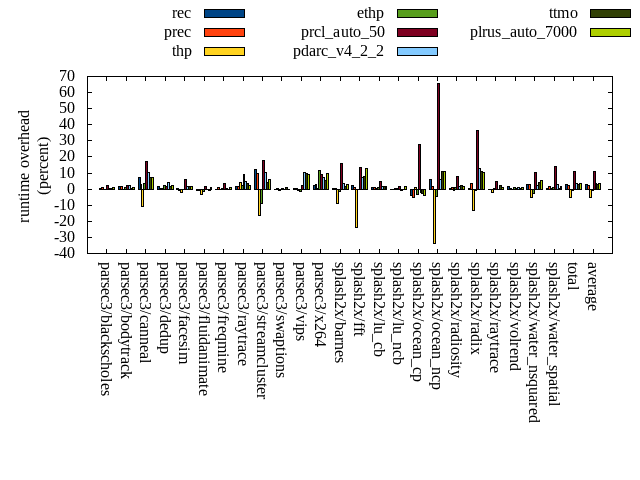 ======= Summary ======= runtime orig rec (overhead) prec (overhead) thp (overhead) ethp (overhead) prcl_auto_50 (overhead) pdarc_v4_2_2 (overhead) ttmo (overhead) plrus_auto_7000 (overhead) parsec3/blackscholes 139.525 139.928 (0.29) 141.153 (1.17) 139.065 (-0.33) 139.582 (0.04) 143.110 (2.57) 140.479 (0.68) 139.784 (0.19) 140.711 (0.85) parsec3/bodytrack 124.999 126.861 (1.49) 126.848 (1.48) 125.010 (0.01) 126.120 (0.90) 128.147 (2.52) 127.861 (2.29) 125.199 (0.16) 126.159 (0.93) parsec3/canneal 204.656 219.883 (7.44) 210.670 (2.94) 182.442 (-10.85) 211.825 (3.50) 239.788 (17.17) 225.607 (10.24) 220.004 (7.50) 219.185 (7.10) parsec3/dedup 18.117 18.443 (1.80) 18.183 (0.37) 18.140 (0.13) 18.535 (2.31) 18.448 (1.83) 18.912 (4.39) 18.384 (1.47) 18.538 (2.33) parsec3/facesim 344.388 345.358 (0.28) 340.863 (-1.02) 337.471 (-2.01) 342.734 (-0.48) 364.005 (5.70) 350.288 (1.71) 350.779 (1.86) 350.785 (1.86) parsec3/fluidanimate 335.375 332.159 (-0.96) 332.438 (-0.88) 323.558 (-3.52) 331.487 (-1.16) 341.275 (1.76) 334.583 (-0.24) 332.030 (-1.00) 338.290 (0.87) parsec3/freqmine 435.382 435.290 (-0.02) 438.685 (0.76) 435.491 (0.03) 438.331 (0.68) 449.930 (3.34) 437.888 (0.58) 435.680 (0.07) 439.101 (0.85) parsec3/raytrace 179.934 183.401 (1.93) 183.306 (1.87) 187.130 (4.00) 184.223 (2.38) 196.145 (9.01) 188.772 (4.91) 185.864 (3.30) 184.537 (2.56) parsec3/streamcluster 611.452 686.977 (12.35) 669.769 (9.54) 510.831 (-16.46) 558.431 (-8.67) 721.767 (18.04) 673.274 (10.11) 637.804 (4.31) 646.395 (5.71) parsec3/swaptions 222.548 221.719 (-0.37) 224.040 (0.67) 220.972 (-0.71) 222.598 (0.02) 223.400 (0.38) 221.791 (-0.34) 225.374 (1.27) 222.014 (-0.24) parsec3/vips 88.435 88.684 (0.28) 88.677 (0.27) 87.615 (-0.93) 87.386 (-1.19) 90.524 (2.36) 97.411 (10.15) 96.867 (9.53) 96.622 (9.26) parsec3/x264 111.572 114.007 (2.18) 114.976 (3.05) 111.747 (0.16) 124.203 (11.32) 121.490 (8.89) 119.593 (7.19) 117.430 (5.25) 122.092 (9.43) splash2x/barnes 130.162 130.430 (0.21) 130.622 (0.35) 118.237 (-9.16) 128.064 (-1.61) 150.932 (15.96) 134.347 (3.22) 131.945 (1.37) 133.565 (2.61) splash2x/fft 61.195 62.544 (2.20) 61.781 (0.96) 46.447 (-24.10) 60.889 (-0.50) 69.397 (13.40) 65.590 (7.18) 65.839 (7.59) 69.087 (12.90) splash2x/lu_cb 132.424 133.459 (0.78) 133.362 (0.71) 132.865 (0.33) 133.680 (0.95) 138.875 (4.87) 134.348 (1.45) 134.517 (1.58) 134.443 (1.52) splash2x/lu_ncb 151.515 151.365 (-0.10) 150.889 (-0.41) 151.724 (0.14) 152.113 (0.39) 153.566 (1.35) 150.320 (-0.79) 151.074 (-0.29) 153.718 (1.45) splash2x/ocean_cp 83.735 80.527 (-3.83) 79.420 (-5.15) 84.803 (1.27) 80.957 (-3.32) 106.958 (27.73) 81.790 (-2.32) 81.664 (-2.47) 80.164 (-4.26) splash2x/ocean_ncp 158.680 167.952 (5.84) 161.201 (1.59) 104.739 (-33.99) 151.004 (-4.84) 262.828 (65.63) 168.070 (5.92) 175.682 (10.72) 176.374 (11.15) splash2x/radiosity 142.276 142.543 (0.19) 143.623 (0.95) 141.210 (-0.75) 143.369 (0.77) 153.684 (8.02) 144.851 (1.81) 145.261 (2.10) 144.963 (1.89) splash2x/radix 50.451 50.738 (0.57) 52.183 (3.43) 43.893 (-13.00) 49.870 (-1.15) 68.871 (36.51) 56.956 (12.89) 55.904 (10.81) 55.722 (10.45) splash2x/raytrace 135.581 135.455 (-0.09) 135.070 (-0.38) 132.469 (-2.30) 136.265 (0.50) 141.797 (4.58) 134.981 (-0.44) 138.517 (2.17) 137.004 (1.05) splash2x/volrend 120.203 122.361 (1.79) 120.614 (0.34) 119.630 (-0.48) 121.156 (0.79) 120.909 (0.59) 121.210 (0.84) 120.486 (0.24) 121.185 (0.82) splash2x/water_nsquared 372.864 384.274 (3.06) 384.314 (3.07) 354.047 (-5.05) 362.005 (-2.91) 411.814 (10.45) 381.734 (2.38) 387.506 (3.93) 392.828 (5.35) splash2x/water_spatial 133.859 134.249 (0.29) 136.118 (1.69) 134.268 (0.31) 135.039 (0.88) 152.891 (14.22) 138.011 (3.10) 134.664 (0.60) 136.070 (1.65) total 4489.320 4608.600 (2.66) 4578.790 (1.99) 4243.820 (-5.47) 4439.850 (-1.10) 4970.550 (10.72) 4648.660 (3.55) 4608.240 (2.65) 4639.530 (3.35) average 187.055 192.025 (1.57) 190.783 (1.14) 176.826 (-4.89) 184.994 (-0.02) 207.106 (11.54) 193.694 (3.62) 192.010 (3.01) 193.314 (3.67) kdamond_cpu_util orig rec (overhead) prec (overhead) thp (overhead) ethp (overhead) prcl_auto_50 (overhead) pdarc_v4_2_2 (overhead) ttmo (overhead) plrus_auto_7000 (overhead) parsec3/blackscholes 0.000 1.577 (1.58) 0.887 (0.89) 0.000 (0.00) 1.702 (1.70) 3.730 (3.73) 3.641 (3.64) 0.000 (0.00) 2.049 (2.05) parsec3/bodytrack 0.000 1.927 (1.93) 0.848 (0.85) 0.000 (0.00) 1.817 (1.82) 3.351 (3.35) 4.554 (4.55) 0.000 (0.00) 2.008 (2.01) parsec3/canneal 0.000 2.181 (2.18) 2.876 (2.88) 0.000 (0.00) 1.973 (1.97) 5.582 (5.58) 11.784 (11.78) 0.000 (0.00) 2.252 (2.25) parsec3/dedup 0.000 1.580 (1.58) 0.862 (0.86) 0.000 (0.00) 1.806 (1.81) 1.632 (1.63) 7.023 (7.02) 0.000 (0.00) 0.885 (0.89) parsec3/facesim 0.000 1.611 (1.61) 0.888 (0.89) 0.000 (0.00) 2.338 (2.34) 4.538 (4.54) 5.091 (5.09) 0.000 (0.00) 2.025 (2.03) parsec3/fluidanimate 0.000 1.648 (1.65) 0.899 (0.90) 0.000 (0.00) 1.539 (1.54) 1.490 (1.49) 5.267 (5.27) 0.000 (0.00) 1.761 (1.76) parsec3/freqmine 0.000 1.612 (1.61) 0.893 (0.89) 0.000 (0.00) 1.575 (1.58) 5.159 (5.16) 4.851 (4.85) 0.000 (0.00) 2.300 (2.30) parsec3/raytrace 0.000 1.513 (1.51) 0.897 (0.90) 0.000 (0.00) 1.646 (1.65) 8.908 (8.91) 5.128 (5.13) 0.000 (0.00) 2.210 (2.21) parsec3/streamcluster 0.000 17.006 (17.01) 8.256 (8.26) 0.000 (0.00) 1.642 (1.64) 16.529 (16.53) 7.075 (7.08) 0.000 (0.00) 7.348 (7.35) parsec3/swaptions 0.000 1.801 (1.80) 0.871 (0.87) 0.000 (0.00) 1.672 (1.67) 1.536 (1.54) 5.099 (5.10) 0.000 (0.00) 1.974 (1.97) parsec3/vips 0.000 4.042 (4.04) 0.830 (0.83) 0.000 (0.00) 1.916 (1.92) 5.930 (5.93) 4.819 (4.82) 0.000 (0.00) 1.882 (1.88) parsec3/x264 0.000 3.297 (3.30) 0.856 (0.86) 0.000 (0.00) 3.468 (3.47) 3.293 (3.29) 5.021 (5.02) 0.000 (0.00) 2.076 (2.08) splash2x/barnes 0.000 1.464 (1.46) 0.997 (1.00) 0.000 (0.00) 1.611 (1.61) 15.565 (15.56) 7.126 (7.13) 0.000 (0.00) 1.772 (1.77) splash2x/fft 0.000 1.799 (1.80) 0.973 (0.97) 0.000 (0.00) 1.767 (1.77) 30.062 (30.06) 5.817 (5.82) 0.000 (0.00) 1.846 (1.85) splash2x/lu_cb 0.000 1.555 (1.56) 0.855 (0.86) 
