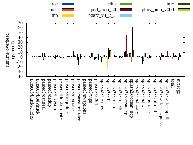 ======= Summary ======= runtime orig rec (overhead) prec (overhead) thp (overhead) ethp (overhead) prcl_auto_50 (overhead) pdarc_v4_2_2 (overhead) ttmo (overhead) plrus_auto_7000 (overhead) parsec3/blackscholes 138.725 139.175 (0.32) 138.768 (0.03) 138.614 (-0.08) 139.588 (0.62) 142.881 (3.00) 139.986 (0.91) 139.540 (0.59) 139.755 (0.74) parsec3/bodytrack 124.839 125.130 (0.23) 126.743 (1.53) 124.182 (-0.53) 125.279 (0.35) 127.908 (2.46) 127.947 (2.49) 124.364 (-0.38) 126.381 (1.24) parsec3/canneal 213.097 228.392 (7.18) 219.773 (3.13) 173.218 (-18.71) 203.898 (-4.32) 225.443 (5.79) 228.255 (7.11) 217.663 (2.14) 232.869 (9.28) parsec3/dedup 18.292 18.394 (0.55) 18.475 (1.00) 17.731 (-3.06) 18.331 (0.21) 18.466 (0.95) 18.515 (1.22) 18.197 (-0.52) 18.155 (-0.75) parsec3/facesim 346.219 349.029 (0.81) 347.667 (0.42) 338.126 (-2.34) 337.626 (-2.48) 361.178 (4.32) 349.525 (0.96) 345.597 (-0.18) 362.051 (4.57) parsec3/fluidanimate 337.718 344.765 (2.09) 334.438 (-0.97) 334.132 (-1.06) 330.691 (-2.08) 333.325 (-1.30) 338.591 (0.26) 335.536 (-0.65) 335.214 (-0.74) parsec3/freqmine 434.729 435.732 (0.23) 436.672 (0.45) 434.469 (-0.06) 435.850 (0.26) 443.588 (2.04) 439.814 (1.17) 437.745 (0.69) 437.895 (0.73) parsec3/raytrace 179.627 183.986 (2.43) 181.170 (0.86) 184.585 (2.76) 184.855 (2.91) 201.481 (12.17) 185.495 (3.27) 186.826 (4.01) 184.965 (2.97) parsec3/streamcluster 670.365 710.681 (6.01) 634.681 (-5.32) 597.761 (-10.83) 565.396 (-15.66) 672.018 (0.25) 714.494 (6.58) 644.166 (-3.91) 690.468 (3.00) parsec3/swaptions 221.265 222.327 (0.48) 221.978 (0.32) 224.041 (1.25) 221.590 (0.15) 221.186 (-0.04) 222.824 (0.70) 221.875 (0.28) 222.061 (0.36) parsec3/vips 87.859 88.051 (0.22) 88.485 (0.71) 87.570 (-0.33) 87.366 (-0.56) 89.716 (2.11) 94.330 (7.37) 95.919 (9.17) 96.605 (9.95) parsec3/x264 118.926 112.475 (-5.42) 115.352 (-3.00) 115.816 (-2.61) 116.935 (-1.67) 118.769 (-0.13) 116.565 (-1.98) 112.268 (-5.60) 125.025 (5.13) splash2x/barnes 129.959 131.279 (1.02) 130.353 (0.30) 118.082 (-9.14) 127.065 (-2.23) 159.445 (22.69) 135.897 (4.57) 132.431 (1.90) 134.735 (3.68) splash2x/fft 62.287 63.119 (1.34) 62.692 (0.65) 47.355 (-23.97) 60.534 (-2.81) 73.856 (18.58) 65.299 (4.84) 71.347 (14.55) 70.547 (13.26) splash2x/lu_cb 132.815 133.264 (0.34) 133.269 (0.34) 133.047 (0.17) 133.038 (0.17) 138.724 (4.45) 134.695 (1.42) 133.847 (0.78) 134.176 (1.02) splash2x/lu_ncb 151.717 152.015 (0.20) 151.364 (-0.23) 153.195 (0.97) 150.510 (-0.80) 154.826 (2.05) 150.438 (-0.84) 152.142 (0.28) 153.377 (1.09) splash2x/ocean_cp 79.645 87.814 (10.26) 81.218 (1.98) 88.744 (11.42) 80.102 (0.57) 115.871 (45.48) 81.702 (2.58) 84.650 (6.28) 88.482 (11.10) splash2x/ocean_ncp 157.112 168.347 (7.15) 168.406 (7.19) 104.701 (-33.36) 140.760 (-10.41) 252.609 (60.78) 167.452 (6.58) 178.867 (13.85) 181.373 (15.44) splash2x/radiosity 141.394 141.926 (0.38) 142.079 (0.48) 141.108 (-0.20) 142.688 (0.92) 153.336 (8.45) 145.274 (2.74) 144.575 (2.25) 145.596 (2.97) splash2x/radix 52.146 51.210 (-1.79) 52.912 (1.47) 45.010 (-13.68) 48.568 (-6.86) 77.935 (49.46) 56.140 (7.66) 56.017 (7.42) 55.990 (7.37) splash2x/raytrace 135.959 135.488 (-0.35) 134.578 (-1.02) 131.237 (-3.47) 132.752 (-2.36) 142.109 (4.52) 134.819 (-0.84) 137.682 (1.27) 139.066 (2.28) splash2x/volrend 120.079 120.267 (0.16) 120.167 (0.07) 119.575 (-0.42) 119.664 (-0.35) 120.325 (0.21) 121.218 (0.95) 120.511 (0.36) 120.316 (0.20) splash2x/water_nsquared 370.050 373.472 (0.92) 373.921 (1.05) 350.535 (-5.27) 360.703 (-2.53) 396.687 (7.20) 372.549 (0.68) 386.053 (4.32) 386.461 (4.43) splash2x/water_spatial 133.658 136.047 (1.79) 133.665 (0.01) 134.190 (0.40) 135.441 (1.33) 151.146 (13.08) 137.436 (2.83) 134.378 (0.54) 136.385 (2.04) total 4558.510 4652.400 (2.06) 4548.810 (-0.21) 4337.030 (-4.86) 4399.230 (-3.49) 4892.870 (7.33) 4679.260 (2.65) 4612.220 (1.18) 4717.940 (3.50) average 189.938 193.850 (1.52) 189.534 (0.48) 180.710 (-4.67) 183.301 (-1.98) 203.870 (11.19) 194.969 (2.63) 192.176 (2.48) 196.581 (4.22) kdamond_cpu_util orig rec (overhead) prec (overhead) thp (overhead) ethp (overhead) prcl_auto_50 (overhead) pdarc_v4_2_2 (overhead) ttmo (overhead) plrus_auto_7000 (overhead) parsec3/blackscholes 0.000 1.840 (1.84) 0.921 (0.92) 0.000 (0.00) 1.748 (1.75) 4.147 (4.15) 3.440 (3.44) 0.000 (0.00) 2.149 (2.15) parsec3/bodytrack 0.000 2.176 (2.18) 0.872 (0.87) 0.000 (0.00) 2.108 (2.11) 3.454 (3.45) 3.943 (3.94) 0.000 (0.00) 2.059 (2.06) parsec3/canneal 0.000 2.452 (2.45) 2.199 (2.20) 0.000 (0.00) 2.344 (2.34) 5.270 (5.27) 8.216 (8.22) 0.000 (0.00) 2.688 (2.69) parsec3/dedup 0.000 1.925 (1.93) 1.112 (1.11) 0.000 (0.00) 1.674 (1.67) 1.987 (1.99) 5.379 (5.38) 0.000 (0.00) 0.926 (0.93) parsec3/facesim 0.000 2.021 (2.02) 0.934 (0.93) 0.000 (0.00) 2.577 (2.58) 5.411 (5.41) 5.161 (5.16) 0.000 (0.00) 1.813 (1.81) parsec3/fluidanimate 0.000 1.810 (1.81) 0.926 (0.93) 0.000 (0.00) 1.773 (1.77) 2.042 (2.04) 5.124 (5.12) 0.000 (0.00) 1.854 (1.85) parsec3/freqmine 0.000 1.623 (1.62) 0.912 (0.91) 0.000 (0.00) 1.648 (1.65) 5.195 (5.19) 4.807 (4.81) 0.000 (0.00) 2.344 (2.34) parsec3/raytrace 0.000 1.798 (1.80) 0.901 (0.90) 0.000 (0.00) 1.809 (1.81) 8.897 (8.90) 3.293 (3.29) 0.000 (0.00) 2.185 (2.19) parsec3/streamcluster 0.000 16.956 (16.96) 11.339 (11.34) 0.000 (0.00) 1.743 (1.74) 14.909 (14.91) 9.174 (9.17) 0.000 (0.00) 5.054 (5.05) parsec3/swaptions 0.000 3.203 (3.20) 0.940 (0.94) 0.000 (0.00) 3.082 (3.08) 3.252 (3.25) 5.058 (5.06) 0.000 (0.00) 1.921 (1.92) parsec3/vips 0.000 5.147 (5.15) 0.852 (0.85) 0.000 (0.00) 3.495 (3.49) 6.066 (6.07) 3.463 (3.46) 0.000 (0.00) 1.914 (1.91) parsec3/x264 0.000 3.988 (3.99) 0.891 (0.89) 0.000 (0.00) 4.118 (4.12) 4.132 (4.13) 4.312 (4.31) 0.000 (0.00) 2.053 (2.05) splash2x/barnes 0.000 1.639 (1.64) 0.959 (0.96) 0.000 (0.00) 1.675 (1.67) 19.297 (19.30) 7.531 (7.53) 0.000 (0.00) 1.751 (1.75) splash2x/fft 0.000 1.906 (1.91) 1.013 (1.01) 0.000 (0.00) 1.856 (1.86) 40.244 (40.24) 4.553 (4.55) 0.000 (0.00) 1.909 (1.91) splash2x/lu_cb 0.000 1.878 (1.88) 0.914 (0.