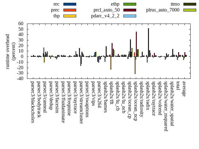 ======= Summary ======= runtime orig rec (overhead) prec (overhead) thp (overhead) ethp (overhead) prcl_auto_50 (overhead) pdarc_v4_2_2 (overhead) ttmo (overhead) plrus_auto_7000 (overhead) parsec3/blackscholes 138.686 140.190 (1.08) 139.759 (0.77) 138.787 (0.07) 139.441 (0.54) 143.146 (3.22) 140.020 (0.96) 139.874 (0.86) 140.149 (1.06) parsec3/bodytrack 125.938 126.590 (0.52) 128.223 (1.81) 124.715 (-0.97) 127.672 (1.38) 128.279 (1.86) 127.163 (0.97) 125.096 (-0.67) 126.110 (0.14) parsec3/canneal 204.615 216.935 (6.02) 238.791 (16.70) 183.971 (-10.09) 211.151 (3.19) 221.934 (8.46) 211.838 (3.53) 216.161 (5.64) 223.590 (9.27) parsec3/dedup 18.335 18.550 (1.17) 18.698 (1.98) 17.750 (-3.19) 18.383 (0.27) 18.644 (1.69) 18.640 (1.66) 18.376 (0.23) 18.224 (-0.61) parsec3/facesim 348.903 342.477 (-1.84) 346.339 (-0.73) 334.337 (-4.17) 342.207 (-1.92) 360.132 (3.22) 349.962 (0.30) 359.837 (3.13) 350.106 (0.34) parsec3/fluidanimate 331.545 342.146 (3.20) 333.463 (0.58) 336.826 (1.59) 334.689 (0.95) 341.830 (3.10) 334.123 (0.78) 335.658 (1.24) 337.820 (1.89) parsec3/freqmine 435.513 435.409 (-0.02) 436.410 (0.21) 432.666 (-0.65) 434.495 (-0.23) 446.730 (2.58) 439.033 (0.81) 435.011 (-0.12) 438.642 (0.72) parsec3/raytrace 180.863 181.452 (0.33) 184.877 (2.22) 183.981 (1.72) 182.369 (0.83) 198.658 (9.84) 186.689 (3.22) 189.026 (4.51) 184.729 (2.14) parsec3/streamcluster 649.526 748.407 (15.22) 669.256 (3.04) 543.777 (-16.28) 564.590 (-13.08) 703.541 (8.32) 689.399 (6.14) 674.362 (3.82) 658.788 (1.43) parsec3/swaptions 222.212 222.672 (0.21) 223.194 (0.44) 221.489 (-0.33) 222.610 (0.18) 223.100 (0.40) 223.868 (0.75) 220.221 (-0.90) 226.117 (1.76) parsec3/vips 87.802 88.708 (1.03) 88.364 (0.64) 87.670 (-0.15) 88.051 (0.28) 89.861 (2.35) 93.732 (6.75) 94.960 (8.15) 95.237 (8.47) parsec3/x264 119.252 108.938 (-8.65) 115.320 (-3.30) 106.531 (-10.67) 120.413 (0.97) 113.546 (-4.79) 114.996 (-3.57) 120.097 (0.71) 120.543 (1.08) splash2x/barnes 130.674 132.963 (1.75) 131.706 (0.79) 118.766 (-9.11) 127.613 (-2.34) 154.826 (18.48) 134.666 (3.06) 131.565 (0.68) 133.323 (2.03) splash2x/fft 61.461 63.315 (3.02) 63.778 (3.77) 47.321 (-23.01) 61.015 (-0.72) 76.619 (24.66) 64.669 (5.22) 70.096 (14.05) 68.443 (11.36) splash2x/lu_cb 132.414 134.479 (1.56) 132.565 (0.11) 133.415 (0.76) 134.433 (1.52) 138.371 (4.50) 133.718 (0.98) 134.375 (1.48) 134.447 (1.54) splash2x/lu_ncb 148.556 153.070 (3.04) 153.747 (3.49) 151.259 (1.82) 150.998 (1.64) 153.660 (3.44) 153.373 (3.24) 152.081 (2.37) 153.274 (3.18) splash2x/ocean_cp 81.466 78.145 (-4.08) 84.849 (4.15) 89.071 (9.33) 86.459 (6.13) 106.646 (30.91) 80.362 (-1.36) 88.384 (8.49) 93.851 (15.20) splash2x/ocean_ncp 161.662 162.005 (0.21) 173.627 (7.40) 111.349 (-31.12) 153.634 (-4.97) 234.497 (45.05) 170.341 (5.37) 183.259 (13.36) 182.981 (13.19) splash2x/radiosity 142.932 143.335 (0.28) 142.356 (-0.40) 142.938 (0.00) 142.130 (-0.56) 154.928 (8.39) 145.021 (1.46) 145.379 (1.71) 145.512 (1.80) splash2x/radix 51.097 51.037 (-0.12) 52.605 (2.95) 45.868 (-10.23) 50.312 (-1.54) 77.285 (51.25) 56.454 (10.48) 56.981 (11.51) 54.347 (6.36) splash2x/raytrace 135.464 136.465 (0.74) 139.145 (2.72) 133.806 (-1.22) 135.008 (-0.34) 144.368 (6.57) 136.561 (0.81) 138.907 (2.54) 137.684 (1.64) splash2x/volrend 120.276 120.726 (0.37) 119.966 (-0.26) 119.449 (-0.69) 119.383 (-0.74) 121.008 (0.61) 121.542 (1.05) 120.173 (-0.09) 120.693 (0.35) splash2x/water_nsquared 374.136 377.508 (0.90) 374.605 (0.13) 355.002 (-5.11) 363.515 (-2.84) 396.683 (6.03) 373.129 (-0.27) 383.872 (2.60) 389.666 (4.15) splash2x/water_spatial 133.535 134.511 (0.73) 133.970 (0.33) 136.204 (2.00) 135.818 (1.71) 151.625 (13.55) 138.541 (3.75) 137.084 (2.66) 137.375 (2.88) total 4536.860 4660.040 (2.72) 4625.640 (1.96) 4296.960 (-5.29) 4446.390 (-1.99) 4899.940 (8.00) 4637.840 (2.23) 4670.820 (2.95) 4671.650 (2.97) average 189.036 194.168 (1.11) 192.735 (2.06) 179.040 (-4.57) 185.266 (-0.40) 204.164 (10.57) 193.243 (2.34) 194.617 (3.67) 194.652 (3.81) kdamond_cpu_util orig rec (overhead) prec (overhead) thp (overhead) ethp (overhead) prcl_auto_50 (overhead) pdarc_v4_2_2 (overhead) ttmo (overhead) plrus_auto_7000 (overhead) parsec3/blackscholes 0.000 1.895 (1.90) 0.955 (0.95) 0.000 (0.00) 1.802 (1.80) 4.217 (4.22) 3.296 (3.30) 0.000 (0.00) 2.146 (2.15) parsec3/bodytrack 0.000 2.274 (2.27) 0.869 (0.87) 0.000 (0.00) 2.090 (2.09) 3.468 (3.47) 3.887 (3.89) 0.000 (0.00) 1.880 (1.88) parsec3/canneal 0.000 2.409 (2.41) 4.475 (4.47) 0.000 (0.00) 2.369 (2.37) 5.314 (5.31) 8.769 (8.77) 0.000 (0.00) 3.007 (3.01) parsec3/dedup 0.000 1.896 (1.90) 0.868 (0.87) 0.000 (0.00) 1.929 (1.93) 2.234 (2.23) 4.734 (4.73) 0.000 (0.00) 0.790 (0.79) parsec3/facesim 0.000 2.018 (2.02) 0.889 (0.89) 0.000 (0.00) 2.514 (2.51) 5.362 (5.36) 4.949 (4.95) 0.000 (0.00) 1.657 (1.66) parsec3/fluidanimate 0.000 1.799 (1.80) 0.875 (0.87) 0.000 (0.00) 1.817 (1.82) 1.975 (1.97) 4.817 (4.82) 0.000 (0.00) 1.625 (1.63) parsec3/freqmine 0.000 1.659 (1.66) 0.902 (0.90) 0.000 (0.00) 1.679 (1.68) 5.038 (5.04) 4.575 (4.57) 0.000 (0.00) 2.255 (2.26) parsec3/raytrace 0.000 1.745 (1.74) 0.926 (0.93) 0.000 (0.00) 1.788 (1.79) 8.997 (9.00) 4.170 (4.17) 0.000 (0.00) 2.253 (2.25) parsec3/streamcluster 0.000 17.144 (17.14) 10.153 (10.15) 0.000 (0.00) 1.823 (1.82) 16.836 (16.84) 6.788 (6.79) 0.000 (0.00) 2.777 (2.78) parsec3/swaptions 0.000 3.348 (3.35) 0.907 (0.91) 0.000 (0.00) 3.197 (3.20) 3.395 (3.40) 4.897 (4.90) 0.000 (0.00) 1.914 (1.91) parsec3/vips 0.000 5.535 (5.53) 0.866 (0.87) 0.000 (0.00) 3.280 (3.28) 6.036 (6.04) 3.223 (3.22) 0.000 (0.00) 1.816 (1.82) parsec3/x264 0.000 3.898 (3.90) 0.885 (0.88) 0.000 (0.00) 4.004 (4.00) 4.097 (4.10) 3.994 (3.99) 0.000 (0.00) 2.021 (2.02) splash2x/barnes 0.000 1.581 (1.58) 0.994 (0.99) 0.000 (0.00) 1.634 (1.63) 15.580 (15.58) 5.975 (5.97) 0.000 (0.00) 1.825 (1.82) splash2x/fft 0.000 1.899 (1.90) 1.024 (1.02) 0.000 (0.00) 1.886 (1.89) 36.756 (36.76) 7.343 (7.34) 0.000 (0.00) 1.841 (1.84) splash2x/lu_cb 0.000 1.915 (1.91) 0.901 (0.90) 0.000