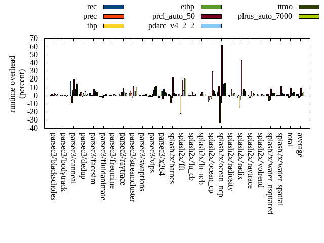 ======= Summary ======= runtime orig rec (overhead) prec (overhead) thp (overhead) ethp (overhead) prcl_auto_50 (overhead) pdarc_v4_2_2 (overhead) ttmo (overhead) plrus_auto_7000 (overhead) parsec3/blackscholes 138.248 139.519 (0.92) 140.297 (1.48) 138.166 (-0.06) 139.077 (0.60) 143.131 (3.53) 140.109 (1.35) 139.670 (1.03) 140.618 (1.71) parsec3/bodytrack 124.295 124.464 (0.14) 125.783 (1.20) 125.045 (0.60) 124.083 (-0.17) 125.342 (0.84) 124.564 (0.22) 122.837 (-1.17) 124.988 (0.56) parsec3/canneal 211.272 249.134 (17.92) 207.238 (-1.91) 193.918 (-8.21) 224.819 (6.41) 253.215 (19.85) 228.153 (7.99) 223.203 (5.65) 241.766 (14.43) parsec3/dedup 18.036 18.281 (1.36) 18.744 (3.92) 17.867 (-0.94) 18.564 (2.93) 18.224 (1.04) 19.034 (5.54) 18.145 (0.60) 18.307 (1.50) parsec3/facesim 338.774 348.872 (2.98) 341.085 (0.68) 339.025 (0.07) 339.379 (0.18) 365.521 (7.90) 358.393 (5.79) 351.282 (3.69) 352.547 (4.07) parsec3/fluidanimate 335.234 329.858 (-1.60) 332.111 (-0.93) 330.943 (-1.28) 326.256 (-2.68) 338.715 (1.04) 339.255 (1.20) 341.314 (1.81) 337.950 (0.81) parsec3/freqmine 434.475 435.040 (0.13) 436.224 (0.40) 437.144 (0.61) 433.943 (-0.12) 445.618 (2.56) 440.559 (1.40) 437.451 (0.68) 439.715 (1.21) parsec3/raytrace 181.041 185.322 (2.36) 182.877 (1.01) 188.802 (4.29) 181.828 (0.43) 198.419 (9.60) 189.529 (4.69) 187.006 (3.29) 185.930 (2.70) parsec3/streamcluster 632.702 656.413 (3.75) 670.906 (6.04) 649.484 (2.65) 615.427 (-2.73) 711.826 (12.51) 670.853 (6.03) 670.993 (6.05) 703.573 (11.20) parsec3/swaptions 221.162 222.164 (0.45) 221.777 (0.28) 220.959 (-0.09) 222.730 (0.71) 222.793 (0.74) 221.574 (0.19) 222.706 (0.70) 225.495 (1.96) parsec3/vips 88.891 88.071 (-0.92) 89.029 (0.16) 87.318 (-1.77) 87.548 (-1.51) 90.133 (1.40) 95.493 (7.43) 98.781 (11.13) 99.148 (11.54) parsec3/x264 112.255 109.036 (-2.87) 109.277 (-2.65) 111.854 (-0.36) 119.150 (6.14) 107.743 (-4.02) 121.671 (8.39) 116.759 (4.01) 116.210 (3.52) splash2x/barnes 130.762 132.756 (1.52) 130.879 (0.09) 119.188 (-8.85) 127.299 (-2.65) 159.460 (21.95) 135.568 (3.67) 131.991 (0.94) 133.070 (1.76) splash2x/fft 60.123 61.386 (2.10) 61.397 (2.12) 47.064 (-21.72) 60.263 (0.23) 71.620 (19.12) 64.231 (6.83) 73.174 (21.71) 72.412 (20.44) splash2x/lu_cb 132.284 133.460 (0.89) 132.899 (0.46) 132.845 (0.42) 133.327 (0.79) 137.994 (4.32) 133.170 (0.67) 133.902 (1.22) 134.815 (1.91) splash2x/lu_ncb 150.976 150.723 (-0.17) 150.753 (-0.15) 150.444 (-0.35) 153.345 (1.57) 156.805 (3.86) 154.393 (2.26) 150.663 (-0.21) 154.430 (2.29) splash2x/ocean_cp 84.529 77.875 (-7.87) 80.424 (-4.86) 83.682 (-1.00) 81.835 (-3.19) 109.356 (29.37) 90.698 (7.30) 89.543 (5.93) 85.917 (1.64) splash2x/ocean_ncp 154.310 161.254 (4.50) 172.077 (11.51) 103.392 (-33.00) 141.613 (-8.23) 250.161 (62.12) 177.103 (14.77) 174.597 (13.15) 177.924 (15.30) splash2x/radiosity 142.977 142.773 (-0.14) 143.500 (0.37) 142.099 (-0.61) 142.932 (-0.03) 154.412 (8.00) 145.833 (2.00) 147.936 (3.47) 146.983 (2.80) splash2x/radix 52.371 51.066 (-2.49) 52.736 (0.70) 44.372 (-15.27) 49.784 (-4.94) 74.985 (43.18) 54.366 (3.81) 56.623 (8.12) 55.322 (5.64) splash2x/raytrace 136.187 135.495 (-0.51) 136.355 (0.12) 133.051 (-2.30) 133.557 (-1.93) 144.352 (6.00) 134.381 (-1.33) 139.797 (2.65) 138.752 (1.88) splash2x/volrend 119.318 121.433 (1.77) 120.297 (0.82) 119.160 (-0.13) 119.216 (-0.09) 121.289 (1.65) 121.029 (1.43) 120.469 (0.96) 120.848 (1.28) splash2x/water_nsquared 375.809 381.927 (1.63) 384.781 (2.39) 352.062 (-6.32) 356.822 (-5.05) 406.743 (8.23) 376.998 (0.32) 389.503 (3.64) 387.203 (3.03) splash2x/water_spatial 132.920 133.562 (0.48) 133.723 (0.60) 133.478 (0.42) 133.680 (0.57) 148.630 (11.82) 137.893 (3.74) 134.214 (0.97) 136.041 (2.35) total 4508.940 4589.870 (1.79) 4575.190 (1.47) 4401.340 (-2.39) 4466.480 (-0.94) 4956.480 (9.93) 4674.840 (3.68) 4672.550 (3.63) 4729.950 (4.90) average 187.872 191.245 (1.10) 190.633 (0.99) 183.389 (-3.88) 186.103 (-0.53) 206.520 (11.52) 194.785 (3.99) 194.690 (4.17) 197.081 (4.81) kdamond_cpu_util orig rec (overhead) prec (overhead) thp (overhead) ethp (overhead) prcl_auto_50 (overhead) pdarc_v4_2_2 (overhead) ttmo (overhead) plrus_auto_7000 (overhead) parsec3/blackscholes 0.000 1.759 (1.76) 0.896 (0.90) 0.000 (0.00) 1.703 (1.70) 4.308 (4.31) 3.329 (3.33) 0.000 (0.00) 2.156 (2.16) parsec3/bodytrack 0.000 2.150 (2.15) 0.850 (0.85) 0.000 (0.00) 1.830 (1.83) 3.496 (3.50) 4.802 (4.80) 0.000 (0.00) 2.098 (2.10) parsec3/canneal 0.000 2.376 (2.38) 1.830 (1.83) 0.000 (0.00) 2.303 (2.30) 5.528 (5.53) 6.544 (6.54) 0.000 (0.00) 1.931 (1.93) parsec3/dedup 0.000 1.912 (1.91) 0.907 (0.91) 0.000 (0.00) 1.933 (1.93) 2.082 (2.08) 7.690 (7.69) 0.000 (0.00) 0.908 (0.91) parsec3/facesim 0.000 2.005 (2.01) 0.884 (0.88) 0.000 (0.00) 2.574 (2.57) 4.867 (4.87) 5.148 (5.15) 0.000 (0.00) 1.527 (1.53) parsec3/fluidanimate 0.000 1.766 (1.77) 0.893 (0.89) 0.000 (0.00) 1.688 (1.69) 1.782 (1.78) 5.202 (5.20) 0.000 (0.00) 1.274 (1.27) parsec3/freqmine 0.000 1.610 (1.61) 0.876 (0.88) 0.000 (0.00) 1.661 (1.66) 5.082 (5.08) 4.729 (4.73) 0.000 (0.00) 2.413 (2.41) parsec3/raytrace 0.000 1.766 (1.77) 0.893 (0.89) 0.000 (0.00) 1.754 (1.75) 8.460 (8.46) 5.238 (5.24) 0.000 (0.00) 2.178 (2.18) parsec3/streamcluster 0.000 16.432 (16.43) 9.015 (9.02) 0.000 (0.00) 1.655 (1.66) 16.154 (16.15) 6.452 (6.45) 0.000 (0.00) 8.742 (8.74) parsec3/swaptions 0.000 3.155 (3.16) 0.903 (0.90) 0.000 (0.00) 3.108 (3.11) 3.099 (3.10) 5.072 (5.07) 0.000 (0.00) 1.891 (1.89) parsec3/vips 0.000 5.159 (5.16) 0.860 (0.86) 0.000 (0.00) 3.570 (3.57) 6.002 (6.00) 4.604 (4.60) 0.000 (0.00) 1.996 (2.00) parsec3/x264 0.000 4.074 (4.07) 0.853 (0.85) 0.000 (0.00) 4.087 (4.09) 4.133 (4.13) 5.008 (5.01) 0.000 (0.00) 1.975 (1.97) splash2x/barnes 0.000 1.614 (1.61) 0.934 (0.93) 0.000 (0.00) 1.657 (1.66) 20.405 (20.40) 7.179 (7.18) 0.000 (0.00) 1.609 (1.61) splash2x/fft 0.000 1.840 (1.84) 1.013 (1.01) 0.000 (0.00) 1.858 (1.86) 30.493 (30.49) 5.445 (5.45) 0.000 (0.00) 1.899 (1.90) splash2x/lu_cb 0.000 1.921 (1.92) 0.881 (0.88) 0.000