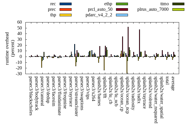 ======= Summary ======= runtime orig rec (overhead) prec (overhead) thp (overhead) ethp (overhead) prcl_auto_50 (overhead) pdarc_v4_2_2 (overhead) ttmo (overhead) plrus_auto_7000 (overhead) parsec3/blackscholes 139.221 139.772 (0.40) 139.301 (0.06) 138.413 (-0.58) 139.312 (0.07) 142.988 (2.71) 140.265 (0.75) 139.218 (-0.00) 140.074 (0.61) parsec3/bodytrack 124.601 126.160 (1.25) 125.884 (1.03) 124.760 (0.13) 125.509 (0.73) 128.483 (3.12) 126.004 (1.13) 124.736 (0.11) 126.061 (1.17) parsec3/canneal 223.626 225.789 (0.97) 224.443 (0.37) 181.162 (-18.99) 207.465 (-7.23) 220.613 (-1.35) 212.408 (-5.02) 241.558 (8.02) 224.460 (0.37) parsec3/dedup 18.302 18.321 (0.10) 18.438 (0.74) 17.853 (-2.46) 18.522 (1.20) 18.450 (0.81) 18.577 (1.50) 18.238 (-0.35) 18.284 (-0.10) parsec3/facesim 347.181 343.898 (-0.95) 342.602 (-1.32) 340.980 (-1.79) 341.180 (-1.73) 358.971 (3.40) 355.282 (2.33) 352.949 (1.66) 349.029 (0.53) parsec3/fluidanimate 339.669 332.383 (-2.15) 337.797 (-0.55) 333.306 (-1.87) 337.257 (-0.71) 346.820 (2.11) 333.810 (-1.72) 335.473 (-1.24) 336.652 (-0.89) parsec3/freqmine 435.919 437.010 (0.25) 435.993 (0.02) 435.065 (-0.20) 435.421 (-0.11) 446.332 (2.39) 440.412 (1.03) 436.688 (0.18) 438.807 (0.66) parsec3/raytrace 182.266 182.961 (0.38) 181.593 (-0.37) 186.966 (2.58) 182.447 (0.10) 197.765 (8.50) 190.849 (4.71) 183.227 (0.53) 183.378 (0.61) parsec3/streamcluster 627.486 763.723 (21.71) 659.949 (5.17) 525.534 (-16.25) 568.981 (-9.32) 697.237 (11.12) 636.163 (1.38) 673.005 (7.25) 662.089 (5.51) parsec3/swaptions 219.481 222.751 (1.49) 221.257 (0.81) 220.865 (0.63) 222.278 (1.27) 222.733 (1.48) 221.376 (0.86) 220.849 (0.62) 223.667 (1.91) parsec3/vips 87.744 88.184 (0.50) 87.921 (0.20) 87.836 (0.10) 87.976 (0.26) 89.810 (2.35) 94.651 (7.87) 96.440 (9.91) 96.458 (9.93) parsec3/x264 112.249 125.067 (11.42) 116.907 (4.15) 116.270 (3.58) 112.145 (-0.09) 117.154 (4.37) 119.548 (6.50) 117.251 (4.46) 113.753 (1.34) splash2x/barnes 132.122 130.136 (-1.50) 131.834 (-0.22) 118.478 (-10.33) 127.911 (-3.19) 156.232 (18.25) 133.456 (1.01) 134.977 (2.16) 132.804 (0.52) splash2x/fft 61.107 62.505 (2.29) 62.144 (1.70) 46.815 (-23.39) 62.712 (2.63) 72.639 (18.87) 66.277 (8.46) 71.171 (16.47) 68.214 (11.63) splash2x/lu_cb 133.532 132.757 (-0.58) 133.657 (0.09) 132.669 (-0.65) 133.542 (0.01) 138.754 (3.91) 133.539 (0.01) 134.312 (0.58) 134.157 (0.47) splash2x/lu_ncb 150.914 154.934 (2.66) 151.574 (0.44) 152.169 (0.83) 152.883 (1.31) 152.706 (1.19) 154.445 (2.34) 152.834 (1.27) 153.515 (1.72) splash2x/ocean_cp 80.760 79.577 (-1.46) 84.963 (5.20) 89.037 (10.25) 82.105 (1.67) 109.093 (35.08) 83.775 (3.73) 84.960 (5.20) 87.865 (8.80) splash2x/ocean_ncp 159.768 169.713 (6.22) 164.515 (2.97) 113.083 (-29.22) 148.565 (-7.01) 242.316 (51.67) 166.593 (4.27) 185.813 (16.30) 177.335 (11.00) splash2x/radiosity 141.868 142.014 (0.10) 142.122 (0.18) 140.597 (-0.90) 142.388 (0.37) 153.359 (8.10) 144.640 (1.95) 145.314 (2.43) 144.070 (1.55) splash2x/radix 51.575 53.611 (3.95) 51.540 (-0.07) 48.121 (-6.70) 50.003 (-3.05) 76.068 (47.49) 54.857 (6.36) 55.916 (8.42) 55.666 (7.93) splash2x/raytrace 134.074 134.195 (0.09) 132.956 (-0.83) 133.887 (-0.14) 134.415 (0.25) 147.826 (10.26) 135.490 (1.06) 139.568 (4.10) 137.114 (2.27) splash2x/volrend 120.559 121.401 (0.70) 120.697 (0.11) 119.066 (-1.24) 119.736 (-0.68) 121.331 (0.64) 120.718 (0.13) 120.947 (0.32) 121.113 (0.46) splash2x/water_nsquared 370.649 384.638 (3.77) 375.113 (1.20) 352.612 (-4.87) 362.609 (-2.17) 393.021 (6.04) 377.439 (1.83) 385.749 (4.07) 386.780 (4.35) splash2x/water_spatial 134.074 133.883 (-0.14) 134.462 (0.29) 135.380 (0.97) 134.596 (0.39) 149.043 (11.16) 138.685 (3.44) 135.474 (1.04) 136.019 (1.45) total 4528.750 4705.370 (3.90) 4577.650 (1.08) 4290.930 (-5.25) 4429.980 (-2.18) 4899.740 (8.19) 4599.280 (1.56) 4686.660 (3.49) 4647.370 (2.62) average 188.698 196.057 (2.14) 190.735 (0.89) 178.789 (-4.19) 184.582 (-1.04) 204.156 (10.57) 191.637 (2.33) 195.278 (3.90) 193.640 (3.08) kdamond_cpu_util orig rec (overhead) prec (overhead) thp (overhead) ethp (overhead) prcl_auto_50 (overhead) pdarc_v4_2_2 (overhead) ttmo (overhead) plrus_auto_7000 (overhead) parsec3/blackscholes 0.000 1.809 (1.81) 0.890 (0.89) 0.000 (0.00) 1.764 (1.76) 4.266 (4.27) 4.254 (4.25) 0.000 (0.00) 2.118 (2.12) parsec3/bodytrack 0.000 2.142 (2.14) 0.851 (0.85) 0.000 (0.00) 1.933 (1.93) 3.492 (3.49) 4.308 (4.31) 0.000 (0.00) 2.138 (2.14) parsec3/canneal 0.000 2.378 (2.38) 2.224 (2.22) 0.000 (0.00) 2.343 (2.34) 5.304 (5.30) 6.239 (6.24) 0.000 (0.00) 3.241 (3.24) parsec3/dedup 0.000 1.824 (1.82) 0.883 (0.88) 0.000 (0.00) 1.936 (1.94) 1.894 (1.89) 5.637 (5.64) 0.000 (0.00) 0.859 (0.86) parsec3/facesim 0.000 2.041 (2.04) 0.871 (0.87) 0.000 (0.00) 2.466 (2.47) 4.865 (4.87) 5.013 (5.01) 0.000 (0.00) 1.885 (1.88) parsec3/fluidanimate 0.000 1.782 (1.78) 0.892 (0.89) 0.000 (0.00) 1.733 (1.73) 2.059 (2.06) 5.126 (5.13) 0.000 (0.00) 1.944 (1.94) parsec3/freqmine 0.000 1.583 (1.58) 0.878 (0.88) 0.000 (0.00) 1.767 (1.77) 5.301 (5.30) 4.795 (4.80) 0.000 (0.00) 2.349 (2.35) parsec3/raytrace 0.000 1.725 (1.72) 0.907 (0.91) 0.000 (0.00) 1.712 (1.71) 8.904 (8.90) 4.580 (4.58) 0.000 (0.00) 2.099 (2.10) parsec3/streamcluster 0.000 14.388 (14.39) 9.441 (9.44) 0.000 (0.00) 1.714 (1.71) 15.764 (15.76) 8.444 (8.44) 0.000 (0.00) 6.190 (6.19) parsec3/swaptions 0.000 3.318 (3.32) 0.873 (0.87) 0.000 (0.00) 3.003 (3.00) 3.148 (3.15) 5.004 (5.00) 0.000 (0.00) 1.931 (1.93) parsec3/vips 0.000 5.665 (5.67) 0.841 (0.84) 0.000 (0.00) 3.679 (3.68) 5.889 (5.89) 4.390 (4.39) 0.000 (0.00) 1.861 (1.86) parsec3/x264 0.000 3.770 (3.77) 0.796 (0.80) 0.000 (0.00) 4.055 (4.05) 4.134 (4.13) 4.780 (4.78) 0.000 (0.00) 2.041 (2.04) splash2x/barnes 0.000 1.627 (1.63) 0.941 (0.94) 0.000 (0.00) 1.577 (1.58) 17.237 (17.24) 6.565 (6.57) 0.000 (0.00) 1.858 (1.86) splash2x/fft 0.000 1.856 (1.86) 0.987 (0.99) 0.000 (0.00) 1.899 (1.90) 34.046 (34.05) 5.794 (5.79) 0.000 (0.00) 1.846 (1.85) splash2x/lu_cb 0.000 1.940 (1.94) 0.888 (0.89) 0.000 (