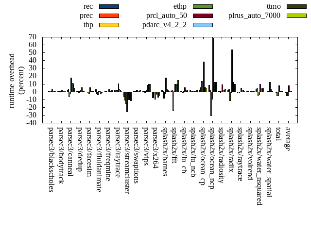 ======= Summary ======= runtime orig rec (overhead) prec (overhead) thp (overhead) ethp (overhead) prcl_auto_50 (overhead) pdarc_v4_2_2 (overhead) ttmo (overhead) plrus_auto_7000 (overhead) parsec3/blackscholes 138.693 139.382 (0.50) 139.832 (0.82) 138.720 (0.02) 139.383 (0.50) 142.425 (2.69) 140.214 (1.10) 139.468 (0.56) 139.726 (0.74) parsec3/bodytrack 125.242 126.691 (1.16) 126.827 (1.27) 124.919 (-0.26) 126.137 (0.71) 127.278 (1.63) 126.723 (1.18) 124.828 (-0.33) 126.275 (0.83) parsec3/canneal 207.581 212.511 (2.38) 215.082 (3.61) 193.726 (-6.67) 202.142 (-2.62) 244.524 (17.80) 230.493 (11.04) 229.191 (10.41) 217.992 (5.02) parsec3/dedup 18.089 18.323 (1.30) 18.239 (0.83) 17.836 (-1.40) 18.298 (1.15) 18.396 (1.70) 19.010 (5.09) 18.253 (0.91) 18.213 (0.69) parsec3/facesim 346.429 345.102 (-0.38) 346.159 (-0.08) 340.655 (-1.67) 339.793 (-1.92) 364.945 (5.34) 347.327 (0.26) 350.268 (1.11) 349.506 (0.89) parsec3/fluidanimate 337.529 347.738 (3.02) 329.306 (-2.44) 324.965 (-3.72) 338.079 (0.16) 341.525 (1.18) 330.393 (-2.11) 334.140 (-1.00) 336.364 (-0.35) parsec3/freqmine 434.595 436.877 (0.53) 435.388 (0.18) 434.504 (-0.02) 434.063 (-0.12) 446.127 (2.65) 437.779 (0.73) 436.213 (0.37) 440.413 (1.34) parsec3/raytrace 181.334 183.840 (1.38) 183.598 (1.25) 184.638 (1.82) 184.569 (1.78) 200.028 (10.31) 186.948 (3.10) 184.620 (1.81) 183.661 (1.28) parsec3/streamcluster 717.117 671.229 (-6.40) 637.692 (-11.08) 607.137 (-15.34) 534.100 (-25.52) 697.764 (-2.70) 645.725 (-9.96) 662.623 (-7.60) 636.605 (-11.23) parsec3/swaptions 219.419 221.217 (0.82) 222.101 (1.22) 220.805 (0.63) 223.794 (1.99) 223.215 (1.73) 222.043 (1.20) 221.095 (0.76) 223.560 (1.89) parsec3/vips 87.931 88.608 (0.77) 88.429 (0.57) 87.456 (-0.54) 88.378 (0.51) 90.028 (2.38) 95.259 (8.33) 96.307 (9.53) 96.346 (9.57) parsec3/x264 122.620 113.276 (-7.62) 113.270 (-7.63) 118.949 (-2.99) 111.234 (-9.29) 119.470 (-2.57) 117.430 (-4.23) 113.951 (-7.07) 117.184 (-4.43) splash2x/barnes 131.010 133.674 (2.03) 131.876 (0.66) 120.418 (-8.09) 127.797 (-2.45) 154.408 (17.86) 135.001 (3.05) 132.851 (1.40) 131.319 (0.24) splash2x/fft 61.389 61.587 (0.32) 62.806 (2.31) 46.585 (-24.11) 62.110 (1.17) 67.486 (9.93) 66.378 (8.13) 67.281 (9.60) 70.367 (14.63) splash2x/lu_cb 132.415 133.090 (0.51) 132.413 (-0.00) 131.547 (-0.66) 133.253 (0.63) 139.556 (5.39) 134.289 (1.42) 133.030 (0.46) 134.319 (1.44) splash2x/lu_ncb 150.607 153.438 (1.88) 151.744 (0.75) 151.415 (0.54) 150.668 (0.04) 151.793 (0.79) 152.206 (1.06) 151.311 (0.47) 153.521 (1.94) splash2x/ocean_cp 79.155 80.903 (2.21) 83.467 (5.45) 89.616 (13.22) 79.724 (0.72) 109.348 (38.14) 81.074 (2.42) 83.368 (5.32) 82.840 (4.65) splash2x/ocean_ncp 158.419 172.106 (8.64) 162.384 (2.50) 109.379 (-30.96) 143.591 (-9.36) 267.427 (68.81) 169.378 (6.92) 177.507 (12.05) 178.106 (12.43) splash2x/radiosity 141.924 142.401 (0.34) 142.074 (0.11) 141.021 (-0.64) 143.493 (1.11) 154.824 (9.09) 145.330 (2.40) 145.183 (2.30) 145.687 (2.65) splash2x/radix 51.328 52.596 (2.47) 52.681 (2.64) 45.375 (-11.60) 50.533 (-1.55) 78.823 (53.57) 57.507 (12.04) 56.043 (9.19) 56.282 (9.65) splash2x/raytrace 134.449 133.310 (-0.85) 134.186 (-0.20) 133.333 (-0.83) 134.419 (-0.02) 141.035 (4.90) 137.155 (2.01) 137.659 (2.39) 136.225 (1.32) splash2x/volrend 119.960 120.620 (0.55) 120.497 (0.45) 119.426 (-0.44) 119.332 (-0.52) 120.560 (0.50) 120.593 (0.53) 120.036 (0.06) 120.645 (0.57) splash2x/water_nsquared 372.630 385.081 (3.34) 387.696 (4.04) 352.964 (-5.28) 358.304 (-3.84) 409.104 (9.79) 372.607 (-0.01) 387.410 (3.97) 387.074 (3.88) splash2x/water_spatial 134.825 134.410 (-0.31) 134.522 (-0.22) 135.312 (0.36) 134.151 (-0.50) 151.229 (12.17) 138.600 (2.80) 135.561 (0.55) 136.035 (0.90) total 4604.680 4608.030 (0.07) 4552.270 (-1.14) 4370.710 (-5.08) 4377.320 (-4.94) 4961.320 (7.75) 4609.480 (0.10) 4638.190 (0.73) 4618.270 (0.30) average 191.862 192.001 (0.77) 189.678 (0.29) 182.113 (-4.11) 182.388 (-1.97) 206.722 (11.38) 192.062 (2.44) 193.258 (2.38) 192.428 (2.52) kdamond_cpu_util orig rec (overhead) prec (overhead) thp (overhead) ethp (overhead) prcl_auto_50 (overhead) pdarc_v4_2_2 (overhead) ttmo (overhead) plrus_auto_7000 (overhead) parsec3/blackscholes 0.000 1.783 (1.78) 0.880 (0.88) 0.000 (0.00) 1.730 (1.73) 4.197 (4.20) 3.011 (3.01) 0.000 (0.00) 2.143 (2.14) parsec3/bodytrack 0.000 2.167 (2.17) 0.861 (0.86) 0.000 (0.00) 2.086 (2.09) 3.481 (3.48) 4.397 (4.40) 0.000 (0.00) 2.007 (2.01) parsec3/canneal 0.000 2.441 (2.44) 2.605 (2.61) 0.000 (0.00) 2.066 (2.07) 5.301 (5.30) 7.346 (7.35) 0.000 (0.00) 2.405 (2.41) parsec3/dedup 0.000 2.345 (2.34) 0.901 (0.90) 0.000 (0.00) 1.797 (1.80) 1.985 (1.99) 7.409 (7.41) 0.000 (0.00) 0.885 (0.88) parsec3/facesim 0.000 2.002 (2.00) 0.870 (0.87) 0.000 (0.00) 2.612 (2.61) 5.069 (5.07) 5.198 (5.20) 0.000 (0.00) 1.604 (1.60) parsec3/fluidanimate 0.000 1.817 (1.82) 0.903 (0.90) 0.000 (0.00) 1.751 (1.75) 1.967 (1.97) 5.229 (5.23) 0.000 (0.00) 1.836 (1.84) parsec3/freqmine 0.000 1.714 (1.71) 0.886 (0.89) 0.000 (0.00) 1.758 (1.76) 5.095 (5.10) 4.988 (4.99) 0.000 (0.00) 2.150 (2.15) parsec3/raytrace 0.000 1.733 (1.73) 0.887 (0.89) 0.000 (0.00) 1.745 (1.74) 8.614 (8.61) 5.408 (5.41) 0.000 (0.00) 2.229 (2.23) parsec3/streamcluster 0.000 17.072 (17.07) 7.312 (7.31) 0.000 (0.00) 1.646 (1.65) 14.992 (14.99) 9.113 (9.11) 0.000 (0.00) 4.717 (4.72) parsec3/swaptions 0.000 3.256 (3.26) 0.886 (0.89) 0.000 (0.00) 3.182 (3.18) 2.882 (2.88) 5.056 (5.06) 0.000 (0.00) 1.954 (1.95) parsec3/vips 0.000 5.487 (5.49) 0.872 (0.87) 0.000 (0.00) 3.572 (3.57) 5.804 (5.80) 4.219 (4.22) 0.000 (0.00) 1.917 (1.92) parsec3/x264 0.000 4.086 (4.09) 0.805 (0.80) 0.000 (0.00) 4.210 (4.21) 4.048 (4.05) 4.396 (4.40) 0.000 (0.00) 1.995 (1.99) splash2x/barnes 0.000 1.599 (1.60) 0.965 (0.96) 0.000 (0.00) 1.602 (1.60) 16.666 (16.67) 7.480 (7.48) 0.000 (0.00) 1.748 (1.75) splash2x/fft 0.000 1.910 (1.91) 1.015 (1.02) 0.000 (0.00) 1.705 (1.70) 28.306 (28.31) 5.151 (5.15) 0.000 (0.00) 1.838 (1.84) splash2x/lu_cb 0.000 1.971 (1.97) 0.885 (0.8