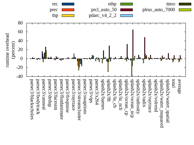 ======= Summary ======= runtime orig rec (overhead) prec (overhead) thp (overhead) ethp (overhead) prcl_auto_50 (overhead) pdarc_v4_2_2 (overhead) ttmo (overhead) plrus_auto_7000 (overhead) parsec3/blackscholes 138.571 139.459 (0.64) 138.703 (0.10) 138.823 (0.18) 139.834 (0.91) 142.640 (2.94) 140.020 (1.05) 139.224 (0.47) 140.078 (1.09) parsec3/bodytrack 127.811 126.958 (-0.67) 127.363 (-0.35) 125.512 (-1.80) 128.615 (0.63) 129.583 (1.39) 127.840 (0.02) 125.732 (-1.63) 127.494 (-0.25) parsec3/canneal 201.997 234.852 (16.26) 224.325 (11.05) 186.556 (-7.64) 209.733 (3.83) 229.742 (13.73) 227.378 (12.56) 255.236 (26.36) 239.586 (18.61) parsec3/dedup 18.190 18.662 (2.59) 18.549 (1.97) 18.194 (0.02) 18.433 (1.34) 18.517 (1.80) 18.955 (4.21) 18.430 (1.32) 18.204 (0.08) parsec3/facesim 345.143 342.856 (-0.66) 348.365 (0.93) 336.083 (-2.62) 341.439 (-1.07) 362.019 (4.89) 353.163 (2.32) 352.206 (2.05) 353.253 (2.35) parsec3/fluidanimate 341.273 333.530 (-2.27) 335.677 (-1.64) 327.900 (-3.92) 336.190 (-1.49) 343.696 (0.71) 333.872 (-2.17) 337.820 (-1.01) 342.869 (0.47) parsec3/freqmine 434.388 434.046 (-0.08) 435.956 (0.36) 433.207 (-0.27) 433.299 (-0.25) 446.464 (2.78) 439.391 (1.15) 434.743 (0.08) 434.284 (-0.02) parsec3/raytrace 182.051 183.889 (1.01) 183.414 (0.75) 187.327 (2.90) 182.888 (0.46) 203.508 (11.79) 189.197 (3.92) 184.965 (1.60) 186.485 (2.44) parsec3/streamcluster 758.569 720.528 (-5.01) 642.444 (-15.31) 563.163 (-25.76) 612.222 (-19.29) 715.455 (-5.68) 675.678 (-10.93) 667.109 (-12.06) 634.130 (-16.40) parsec3/swaptions 221.060 221.855 (0.36) 222.690 (0.74) 222.330 (0.57) 221.318 (0.12) 222.897 (0.83) 221.456 (0.18) 223.010 (0.88) 219.938 (-0.51) parsec3/vips 87.954 89.718 (2.01) 88.889 (1.06) 86.990 (-1.10) 87.869 (-0.10) 90.207 (2.56) 95.030 (8.04) 92.846 (5.56) 94.029 (6.91) parsec3/x264 126.168 125.592 (-0.46) 119.440 (-5.33) 126.223 (0.04) 129.521 (2.66) 125.915 (-0.20) 123.211 (-2.34) 128.484 (1.84) 118.012 (-6.46) splash2x/barnes 129.789 131.924 (1.64) 129.681 (-0.08) 117.836 (-9.21) 128.165 (-1.25) 153.636 (18.37) 132.406 (2.02) 130.836 (0.81) 134.335 (3.50) splash2x/fft 65.937 62.192 (-5.68) 61.536 (-6.68) 46.567 (-29.38) 61.443 (-6.82) 85.340 (29.43) 67.843 (2.89) 62.514 (-5.19) 67.943 (3.04) splash2x/lu_cb 133.692 134.055 (0.27) 134.284 (0.44) 132.409 (-0.96) 132.793 (-0.67) 138.496 (3.59) 133.648 (-0.03) 133.997 (0.23) 134.316 (0.47) splash2x/lu_ncb 151.292 151.964 (0.44) 152.668 (0.91) 151.974 (0.45) 153.416 (1.40) 158.992 (5.09) 153.436 (1.42) 150.786 (-0.33) 153.603 (1.53) splash2x/ocean_cp 84.346 83.475 (-1.03) 83.452 (-1.06) 85.983 (1.94) 79.816 (-5.37) 111.873 (32.64) 88.029 (4.37) 85.005 (0.78) 82.573 (-2.10) splash2x/ocean_ncp 173.629 167.637 (-3.45) 168.899 (-2.72) 106.065 (-38.91) 146.617 (-15.56) 286.404 (64.95) 167.592 (-3.48) 167.267 (-3.66) 183.798 (5.86) splash2x/radiosity 141.872 143.011 (0.80) 141.850 (-0.02) 141.303 (-0.40) 142.772 (0.64) 153.312 (8.06) 145.372 (2.47) 144.592 (1.92) 145.177 (2.33) splash2x/radix 53.084 52.275 (-1.52) 52.878 (-0.39) 48.037 (-9.51) 52.551 (-1.00) 78.601 (48.07) 58.631 (10.45) 56.005 (5.50) 56.963 (7.31) splash2x/raytrace 136.796 137.094 (0.22) 140.295 (2.56) 133.380 (-2.50) 138.051 (0.92) 148.384 (8.47) 136.444 (-0.26) 138.201 (1.03) 135.830 (-0.71) splash2x/volrend 119.390 120.253 (0.72) 120.632 (1.04) 119.610 (0.18) 120.053 (0.55) 120.173 (0.65) 120.995 (1.34) 120.111 (0.60) 120.448 (0.89) splash2x/water_nsquared 373.994 376.682 (0.72) 380.398 (1.71) 355.270 (-5.01) 363.427 (-2.83) 400.145 (6.99) 376.537 (0.68) 379.160 (1.38) 385.540 (3.09) splash2x/water_spatial 136.687 135.477 (-0.88) 135.176 (-1.11) 135.457 (-0.90) 136.556 (-0.10) 152.918 (11.88) 137.675 (0.72) 133.944 (-2.01) 135.965 (-0.53) total 4683.690 4667.990 (-0.34) 4587.570 (-2.05) 4326.200 (-7.63) 4497.030 (-3.99) 5018.910 (7.16) 4663.820 (-0.42) 4662.220 (-0.46) 4644.860 (-0.83) average 195.154 194.500 (0.25) 191.149 (-0.46) 180.258 (-5.57) 187.376 (-1.76) 209.121 (11.49) 194.326 (1.69) 194.259 (1.10) 193.536 (1.37) kdamond_cpu_util orig rec (overhead) prec (overhead) thp (overhead) ethp (overhead) prcl_auto_50 (overhead) pdarc_v4_2_2 (overhead) ttmo (overhead) plrus_auto_7000 (overhead) parsec3/blackscholes 0.000 1.912 (1.91) 0.873 (0.87) 0.000 (0.00) 2.117 (2.12) 4.202 (4.20) 3.402 (3.40) 0.000 (0.00) 2.171 (2.17) parsec3/bodytrack 0.000 2.319 (2.32) 0.850 (0.85) 0.000 (0.00) 2.253 (2.25) 3.587 (3.59) 4.767 (4.77) 0.000 (0.00) 2.024 (2.02) parsec3/canneal 0.000 2.674 (2.67) 3.115 (3.12) 0.000 (0.00) 2.426 (2.43) 5.194 (5.19) 15.710 (15.71) 0.000 (0.00) 2.373 (2.37) parsec3/dedup 0.000 2.103 (2.10) 0.815 (0.81) 0.000 (0.00) 1.961 (1.96) 1.883 (1.88) 8.819 (8.82) 0.000 (0.00) 0.877 (0.88) parsec3/facesim 0.000 2.060 (2.06) 0.818 (0.82) 0.000 (0.00) 2.599 (2.60) 5.639 (5.64) 5.211 (5.21) 0.000 (0.00) 2.308 (2.31) parsec3/fluidanimate 0.000 1.850 (1.85) 0.889 (0.89) 0.000 (0.00) 1.737 (1.74) 2.044 (2.04) 5.170 (5.17) 0.000 (0.00) 1.791 (1.79) parsec3/freqmine 0.000 1.897 (1.90) 0.875 (0.87) 0.000 (0.00) 1.729 (1.73) 5.303 (5.30) 4.823 (4.82) 0.000 (0.00) 2.456 (2.46) parsec3/raytrace 0.000 1.767 (1.77) 0.972 (0.97) 0.000 (0.00) 1.819 (1.82) 8.593 (8.59) 4.965 (4.97) 0.000 (0.00) 1.947 (1.95) parsec3/streamcluster 0.000 18.098 (18.10) 4.981 (4.98) 0.000 (0.00) 1.901 (1.90) 16.714 (16.71) 10.045 (10.04) 0.000 (0.00) 6.490 (6.49) parsec3/swaptions 0.000 3.493 (3.49) 0.874 (0.87) 0.000 (0.00) 3.176 (3.18) 3.318 (3.32) 5.061 (5.06) 0.000 (0.00) 1.445 (1.44) parsec3/vips 0.000 5.521 (5.52) 0.841 (0.84) 0.000 (0.00) 4.483 (4.48) 6.479 (6.48) 5.121 (5.12) 0.000 (0.00) 1.813 (1.81) parsec3/x264 0.000 4.212 (4.21) 0.864 (0.86) 0.000 (0.00) 4.180 (4.18) 4.157 (4.16) 4.359 (4.36) 0.000 (0.00) 2.027 (2.03) splash2x/barnes 0.000 1.746 (1.75) 0.971 (0.97) 0.000 (0.00) 1.708 (1.71) 17.690 (17.69) 5.895 (5.89) 0.000 (0.00) 1.870 (1.87) splash2x/fft 0.000 1.973 (1.97) 0.994 (0.99) 0.000 (0.00) 1.961 (1.96) 50.010 (50.01) 8.352 (8.35) 0.000 (0.00) 1.757 (1.76) splash2x/lu_cb