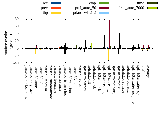 ======= Summary ======= runtime orig rec (overhead) prec (overhead) thp (overhead) ethp (overhead) prcl_auto_50 (overhead) pdarc_v4_2_2 (overhead) ttmo (overhead) plrus_auto_7000 (overhead) parsec3/blackscholes 139.483 140.173 (0.49) 140.401 (0.66) 140.075 (0.42) 140.325 (0.60) 142.716 (2.32) 141.009 (1.09) 140.578 (0.78) 140.690 (0.86) parsec3/bodytrack 126.232 127.787 (1.23) 127.858 (1.29) 124.405 (-1.45) 126.042 (-0.15) 128.509 (1.80) 127.391 (0.92) 124.868 (-1.08) 126.554 (0.25) parsec3/canneal 213.483 208.820 (-2.18) 218.704 (2.45) 180.054 (-15.66) 212.491 (-0.46) 231.459 (8.42) 228.651 (7.10) 216.177 (1.26) 230.354 (7.90) parsec3/dedup 18.485 18.370 (-0.62) 18.377 (-0.59) 17.897 (-3.18) 18.716 (1.25) 18.636 (0.81) 19.091 (3.28) 18.483 (-0.01) 18.490 (0.03) parsec3/facesim 348.111 348.768 (0.19) 345.189 (-0.84) 339.918 (-2.35) 344.614 (-1.00) 358.966 (3.12) 357.300 (2.64) 345.427 (-0.77) 350.551 (0.70) parsec3/fluidanimate 332.447 338.163 (1.72) 337.826 (1.62) 322.992 (-2.84) 329.734 (-0.82) 338.445 (1.80) 336.414 (1.19) 331.780 (-0.20) 337.346 (1.47) parsec3/freqmine 436.936 437.883 (0.22) 437.790 (0.20) 434.439 (-0.57) 436.495 (-0.10) 447.816 (2.49) 440.792 (0.88) 438.169 (0.28) 441.797 (1.11) parsec3/raytrace 179.195 183.401 (2.35) 185.780 (3.68) 186.041 (3.82) 183.792 (2.57) 198.530 (10.79) 188.412 (5.14) 185.570 (3.56) 184.968 (3.22) parsec3/streamcluster 649.178 664.801 (2.41) 704.896 (8.58) 546.191 (-15.86) 554.346 (-14.61) 738.931 (13.83) 669.507 (3.13) 626.862 (-3.44) 667.376 (2.80) parsec3/swaptions 221.893 223.771 (0.85) 221.298 (-0.27) 223.365 (0.66) 222.578 (0.31) 222.920 (0.46) 221.792 (-0.05) 221.955 (0.03) 223.865 (0.89) parsec3/vips 88.299 89.519 (1.38) 88.846 (0.62) 87.819 (-0.54) 88.198 (-0.11) 90.223 (2.18) 96.634 (9.44) 96.486 (9.27) 96.860 (9.70) parsec3/x264 114.861 116.431 (1.37) 118.007 (2.74) 119.032 (3.63) 118.438 (3.11) 112.879 (-1.73) 109.907 (-4.31) 120.540 (4.94) 120.221 (4.67) splash2x/barnes 129.692 130.907 (0.94) 130.469 (0.60) 119.168 (-8.11) 128.336 (-1.05) 158.534 (22.24) 134.211 (3.48) 132.070 (1.83) 132.926 (2.49) splash2x/fft 62.436 62.994 (0.90) 61.739 (-1.12) 47.677 (-23.64) 62.170 (-0.42) 67.514 (8.13) 65.660 (5.16) 69.204 (10.84) 71.765 (14.94) splash2x/lu_cb 133.093 134.151 (0.80) 133.605 (0.39) 133.283 (0.14) 133.782 (0.52) 139.624 (4.91) 133.612 (0.39) 133.548 (0.34) 134.575 (1.11) splash2x/lu_ncb 151.880 152.465 (0.39) 152.202 (0.21) 150.042 (-1.21) 152.075 (0.13) 153.939 (1.36) 152.283 (0.27) 152.714 (0.55) 153.241 (0.90) splash2x/ocean_cp 80.351 81.457 (1.38) 82.584 (2.78) 83.760 (4.24) 80.043 (-0.38) 110.213 (37.16) 83.544 (3.97) 81.015 (0.83) 88.128 (9.68) splash2x/ocean_ncp 160.434 166.324 (3.67) 168.085 (4.77) 108.342 (-32.47) 140.843 (-12.21) 283.480 (76.70) 173.358 (8.06) 172.289 (7.39) 179.144 (11.66) splash2x/radiosity 142.912 143.707 (0.56) 143.972 (0.74) 141.652 (-0.88) 143.648 (0.52) 153.868 (7.67) 146.028 (2.18) 143.355 (0.31) 145.314 (1.68) splash2x/radix 51.496 52.377 (1.71) 52.072 (1.12) 44.619 (-13.36) 49.745 (-3.40) 73.110 (41.97) 57.708 (12.06) 53.056 (3.03) 56.272 (9.27) splash2x/raytrace 135.889 137.457 (1.15) 134.753 (-0.84) 134.561 (-0.98) 134.249 (-1.21) 140.766 (3.59) 134.977 (-0.67) 140.271 (3.22) 138.094 (1.62) splash2x/volrend 120.954 122.084 (0.93) 121.259 (0.25) 119.963 (-0.82) 120.810 (-0.12) 121.574 (0.51) 121.269 (0.26) 120.960 (0.00) 122.047 (0.90) splash2x/water_nsquared 375.595 383.482 (2.10) 384.987 (2.50) 354.667 (-5.57) 359.862 (-4.19) 408.607 (8.79) 381.449 (1.56) 390.044 (3.85) 391.992 (4.37) splash2x/water_spatial 134.412 136.507 (1.56) 135.688 (0.95) 135.003 (0.44) 134.435 (0.02) 150.740 (12.15) 138.135 (2.77) 135.562 (0.86) 136.489 (1.55) total 4547.730 4601.800 (1.19) 4646.390 (2.17) 4294.960 (-5.56) 4415.790 (-2.90) 4991.990 (9.77) 4659.140 (2.45) 4590.980 (0.95) 4689.040 (3.11) average 189.489 191.742 (1.06) 193.600 (1.35) 178.957 (-4.84) 183.991 (-1.30) 208.000 (11.31) 194.131 (2.91) 191.291 (1.99) 195.377 (3.91) kdamond_cpu_util orig rec (overhead) prec (overhead) thp (overhead) ethp (overhead) prcl_auto_50 (overhead) pdarc_v4_2_2 (overhead) ttmo (overhead) plrus_auto_7000 (overhead) parsec3/blackscholes 0.000 1.737 (1.74) 0.870 (0.87) 0.000 (0.00) 1.627 (1.63) 4.049 (4.05) 4.284 (4.28) 0.000 (0.00) 2.025 (2.03) parsec3/bodytrack 0.000 1.759 (1.76) 0.827 (0.83) 0.000 (0.00) 1.787 (1.79) 3.392 (3.39) 4.552 (4.55) 0.000 (0.00) 1.943 (1.94) parsec3/canneal 0.000 2.159 (2.16) 2.896 (2.90) 0.000 (0.00) 2.083 (2.08) 5.422 (5.42) 6.351 (6.35) 0.000 (0.00) 1.865 (1.87) parsec3/dedup 0.000 1.556 (1.56) 0.816 (0.82) 0.000 (0.00) 1.850 (1.85) 1.690 (1.69) 5.971 (5.97) 0.000 (0.00) 0.894 (0.89) parsec3/facesim 0.000 1.570 (1.57) 0.879 (0.88) 0.000 (0.00) 2.282 (2.28) 3.060 (3.06) 5.066 (5.07) 0.000 (0.00) 2.091 (2.09) parsec3/fluidanimate 0.000 1.459 (1.46) 0.868 (0.87) 0.000 (0.00) 1.466 (1.47) 1.620 (1.62) 5.199 (5.20) 0.000 (0.00) 1.345 (1.35) parsec3/freqmine 0.000 1.417 (1.42) 0.911 (0.91) 0.000 (0.00) 1.596 (1.60) 5.093 (5.09) 4.801 (4.80) 0.000 (0.00) 2.462 (2.46) parsec3/raytrace 0.000 1.598 (1.60) 0.882 (0.88) 0.000 (0.00) 1.589 (1.59) 8.608 (8.61) 4.020 (4.02) 0.000 (0.00) 2.263 (2.26) parsec3/streamcluster 0.000 17.120 (17.12) 5.621 (5.62) 0.000 (0.00) 1.559 (1.56) 16.671 (16.67) 7.748 (7.75) 0.000 (0.00) 6.091 (6.09) parsec3/swaptions 0.000 1.645 (1.65) 0.867 (0.87) 0.000 (0.00) 1.846 (1.85) 2.279 (2.28) 5.109 (5.11) 0.000 (0.00) 2.030 (2.03) parsec3/vips 0.000 4.008 (4.01) 0.833 (0.83) 0.000 (0.00) 2.832 (2.83) 5.908 (5.91) 4.940 (4.94) 0.000 (0.00) 1.860 (1.86) parsec3/x264 0.000 3.359 (3.36) 0.874 (0.87) 0.000 (0.00) 3.643 (3.64) 3.534 (3.53) 4.881 (4.88) 0.000 (0.00) 2.019 (2.02) splash2x/barnes 0.000 1.433 (1.43) 0.979 (0.98) 0.000 (0.00) 1.585 (1.59) 19.176 (19.18) 7.302 (7.30) 0.000 (0.00) 1.770 (1.77) splash2x/fft 0.000 1.794 (1.79) 1.001 (1.00) 0.000 (0.00) 1.765 (1.76) 23.700 (23.70) 7.808 (7.81) 0.000 (0.00) 1.872 (1.87) splash2x/lu_cb 0.000 1.601 (1.60) 0.879 (0.88) 0.000 (0