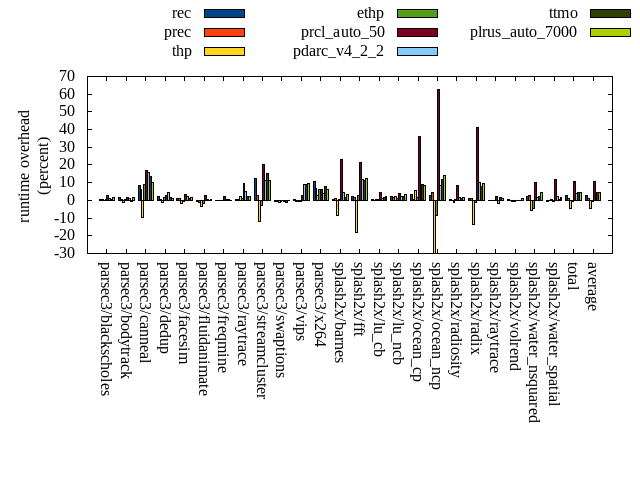 ======= Summary ======= runtime orig rec (overhead) prec (overhead) thp (overhead) ethp (overhead) prcl_auto_50 (overhead) pdarc_v4_2_2 (overhead) ttmo (overhead) plrus_auto_7000 (overhead) parsec3/blackscholes 139.017 140.073 (0.76) 139.907 (0.64) 138.996 (-0.02) 139.526 (0.37) 143.055 (2.91) 140.741 (1.24) 140.085 (0.77) 141.054 (1.47) parsec3/bodytrack 126.026 128.377 (1.87) 126.389 (0.29) 124.828 (-0.95) 126.638 (0.49) 128.120 (1.66) 127.609 (1.26) 125.233 (-0.63) 127.944 (1.52) parsec3/canneal 198.993 215.514 (8.30) 210.879 (5.97) 180.294 (-9.40) 217.031 (9.06) 232.835 (17.01) 229.904 (15.53) 225.439 (13.29) 219.551 (10.33) parsec3/dedup 18.157 18.589 (2.38) 18.263 (0.58) 17.892 (-1.46) 18.413 (1.41) 18.685 (2.91) 18.999 (4.63) 18.439 (1.55) 18.384 (1.25) parsec3/facesim 345.134 349.770 (1.34) 347.959 (0.82) 339.567 (-1.61) 342.713 (-0.70) 357.354 (3.54) 352.803 (2.22) 349.513 (1.27) 351.538 (1.86) parsec3/fluidanimate 335.861 333.448 (-0.72) 332.501 (-1.00) 325.176 (-3.18) 330.728 (-1.53) 344.599 (2.60) 336.919 (0.32) 335.422 (-0.13) 337.834 (0.59) parsec3/freqmine 436.757 436.864 (0.02) 436.913 (0.04) 435.599 (-0.27) 437.508 (0.17) 447.202 (2.39) 438.094 (0.31) 438.464 (0.39) 437.707 (0.22) parsec3/raytrace 181.627 182.191 (0.31) 182.133 (0.28) 185.415 (2.09) 183.253 (0.90) 198.556 (9.32) 190.829 (5.07) 185.466 (2.11) 185.199 (1.97) parsec3/streamcluster 598.788 674.474 (12.64) 615.292 (2.76) 527.267 (-11.94) 579.964 (-3.14) 720.312 (20.30) 664.598 (10.99) 690.193 (15.26) 665.507 (11.14) parsec3/swaptions 223.514 221.627 (-0.84) 222.011 (-0.67) 221.238 (-1.02) 222.105 (-0.63) 223.480 (-0.02) 222.403 (-0.50) 221.130 (-1.07) 223.112 (-0.18) parsec3/vips 88.350 88.973 (0.70) 88.016 (-0.38) 87.947 (-0.46) 87.981 (-0.42) 90.677 (2.63) 96.125 (8.80) 96.208 (8.89) 96.703 (9.45) parsec3/x264 109.892 121.383 (10.46) 117.301 (6.74) 112.861 (2.70) 116.919 (6.39) 116.714 (6.21) 113.878 (3.63) 118.630 (7.95) 116.566 (6.07) splash2x/barnes 129.678 130.069 (0.30) 130.935 (0.97) 118.530 (-8.60) 130.340 (0.51) 159.468 (22.97) 135.406 (4.42) 132.048 (1.83) 134.017 (3.35) splash2x/fft 60.964 62.230 (2.08) 61.823 (1.41) 49.857 (-18.22) 62.616 (2.71) 73.943 (21.29) 68.147 (11.78) 67.743 (11.12) 68.458 (12.29) splash2x/lu_cb 132.431 133.434 (0.76) 132.672 (0.18) 132.904 (0.36) 133.205 (0.58) 138.255 (4.40) 134.150 (1.30) 134.294 (1.41) 135.098 (2.01) splash2x/lu_ncb 149.206 152.296 (2.07) 151.248 (1.37) 152.169 (1.99) 151.052 (1.24) 155.100 (3.95) 152.166 (1.98) 152.082 (1.93) 154.232 (3.37) splash2x/ocean_cp 79.046 81.869 (3.57) 79.571 (0.66) 83.593 (5.75) 80.250 (1.52) 107.617 (36.14) 81.395 (2.97) 86.177 (9.02) 85.667 (8.38) splash2x/ocean_ncp 156.949 161.530 (2.92) 164.028 (4.51) 109.987 (-29.92) 143.166 (-8.78) 255.262 (62.64) 170.529 (8.65) 175.793 (12.01) 178.588 (13.79) splash2x/radiosity 142.993 143.737 (0.52) 142.835 (-0.11) 141.105 (-1.32) 143.482 (0.34) 154.727 (8.21) 145.677 (1.88) 144.580 (1.11) 145.728 (1.91) splash2x/radix 51.176 51.857 (1.33) 51.666 (0.96) 44.121 (-13.79) 50.527 (-1.27) 72.154 (40.99) 56.326 (10.06) 55.290 (8.04) 56.118 (9.66) splash2x/raytrace 135.699 135.366 (-0.25) 135.784 (0.06) 135.255 (-0.33) 135.520 (-0.13) 138.313 (1.93) 133.651 (-1.51) 137.851 (1.59) 137.531 (1.35) splash2x/volrend 120.745 121.681 (0.78) 120.689 (-0.05) 120.097 (-0.54) 119.889 (-0.71) 120.687 (-0.05) 120.857 (0.09) 120.712 (-0.03) 121.783 (0.86) splash2x/water_nsquared 376.041 384.903 (2.36) 386.737 (2.84) 354.416 (-5.75) 359.711 (-4.34) 413.869 (10.06) 381.639 (1.49) 384.911 (2.36) 392.864 (4.47) splash2x/water_spatial 135.124 134.216 (-0.67) 134.924 (-0.15) 135.616 (0.36) 134.027 (-0.81) 150.769 (11.58) 138.026 (2.15) 136.018 (0.66) 137.425 (1.70) total 4472.170 4604.470 (2.96) 4530.480 (1.30) 4274.730 (-4.41) 4446.570 (-0.57) 4961.750 (10.95) 4650.900 (4.00) 4671.710 (4.46) 4668.620 (4.39) average 186.340 191.853 (2.21) 188.770 (1.20) 178.114 (-3.98) 185.274 (0.13) 206.740 (12.31) 193.787 (4.12) 194.655 (4.20) 194.526 (4.53) kdamond_cpu_util orig rec (overhead) prec (overhead) thp (overhead) ethp (overhead) prcl_auto_50 (overhead) pdarc_v4_2_2 (overhead) ttmo (overhead) plrus_auto_7000 (overhead) parsec3/blackscholes 0.000 1.567 (1.57) 0.887 (0.89) 0.000 (0.00) 1.500 (1.50) 3.610 (3.61) 3.666 (3.67) 0.000 (0.00) 2.172 (2.17) parsec3/bodytrack 0.000 1.925 (1.93) 0.849 (0.85) 0.000 (0.00) 1.955 (1.95) 3.243 (3.24) 4.614 (4.61) 0.000 (0.00) 2.053 (2.05) parsec3/canneal 0.000 2.129 (2.13) 2.050 (2.05) 0.000 (0.00) 2.088 (2.09) 5.429 (5.43) 6.445 (6.45) 0.000 (0.00) 2.821 (2.82) parsec3/dedup 0.000 1.693 (1.69) 0.862 (0.86) 0.000 (0.00) 1.889 (1.89) 1.821 (1.82) 5.231 (5.23) 0.000 (0.00) 0.846 (0.85) parsec3/facesim 0.000 1.699 (1.70) 0.884 (0.88) 0.000 (0.00) 2.335 (2.34) 3.071 (3.07) 5.235 (5.23) 0.000 (0.00) 1.965 (1.97) parsec3/fluidanimate 0.000 1.524 (1.52) 0.890 (0.89) 0.000 (0.00) 1.530 (1.53) 1.588 (1.59) 5.240 (5.24) 0.000 (0.00) 1.512 (1.51) parsec3/freqmine 0.000 1.543 (1.54) 0.933 (0.93) 0.000 (0.00) 1.591 (1.59) 5.064 (5.06) 4.874 (4.87) 0.000 (0.00) 2.257 (2.26) parsec3/raytrace 0.000 1.535 (1.53) 0.921 (0.92) 0.000 (0.00) 1.572 (1.57) 8.676 (8.68) 4.380 (4.38) 0.000 (0.00) 2.268 (2.27) parsec3/streamcluster 0.000 17.206 (17.21) 7.501 (7.50) 0.000 (0.00) 1.722 (1.72) 17.156 (17.16) 7.508 (7.51) 0.000 (0.00) 6.700 (6.70) parsec3/swaptions 0.000 1.469 (1.47) 0.877 (0.88) 0.000 (0.00) 1.700 (1.70) 1.798 (1.80) 5.059 (5.06) 0.000 (0.00) 1.936 (1.94) parsec3/vips 0.000 4.863 (4.86) 0.812 (0.81) 0.000 (0.00) 2.487 (2.49) 5.814 (5.81) 4.432 (4.43) 0.000 (0.00) 1.892 (1.89) parsec3/x264 0.000 3.023 (3.02) 0.860 (0.86) 0.000 (0.00) 3.264 (3.26) 3.477 (3.48) 4.803 (4.80) 0.000 (0.00) 2.002 (2.00) splash2x/barnes 0.000 1.414 (1.41) 0.973 (0.97) 0.000 (0.00) 1.651 (1.65) 18.672 (18.67) 6.991 (6.99) 0.000 (0.00) 1.814 (1.81) splash2x/fft 0.000 1.812 (1.81) 1.006 (1.01) 0.000 (0.00) 1.801 (1.80) 32.155 (32.16) 7.575 (7.58) 0.000 (0.00) 1.803 (1.80) splash2x/lu_cb 0.000 1.539 (1.54) 0.887 (0.89)