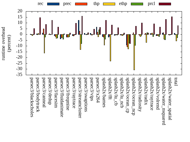 ======= Summary ======= runtime orig rec (overhead) prec (overhead) thp (overhead) ethp (overhead) prcl (overhead) parsec3/blackscholes 139.658 140.168 (0.37) 139.385 (-0.20) 138.367 (-0.92) 139.279 (-0.27) 147.024 (5.27) parsec3/bodytrack 123.788 124.622 (0.67) 123.636 (-0.12) 125.115 (1.07) 123.840 (0.04) 141.928 (14.65) parsec3/canneal 207.491 210.318 (1.36) 217.927 (5.03) 174.287 (-16.00) 202.609 (-2.35) 225.483 (8.67) parsec3/dedup 18.292 18.301 (0.05) 18.378 (0.47) 18.264 (-0.15) 18.298 (0.03) 20.541 (12.30) parsec3/facesim 343.893 340.286 (-1.05) 338.217 (-1.65) 332.953 (-3.18) 333.840 (-2.92) 365.650 (6.33) parsec3/fluidanimate 339.959 326.886 (-3.85) 330.286 (-2.85) 331.239 (-2.57) 326.011 (-4.10) 341.684 (0.51) parsec3/freqmine 445.987 436.332 (-2.16) 435.946 (-2.25) 435.704 (-2.31) 437.595 (-1.88) 451.414 (1.22) parsec3/raytrace 184.106 182.158 (-1.06) 182.056 (-1.11) 183.180 (-0.50) 183.545 (-0.30) 202.197 (9.83) parsec3/streamcluster 599.990 674.091 (12.35) 617.314 (2.89) 521.864 (-13.02) 551.971 (-8.00) 696.127 (16.02) parsec3/swaptions 220.462 222.637 (0.99) 220.449 (-0.01) 219.921 (-0.25) 221.607 (0.52) 223.956 (1.59) parsec3/vips 87.767 88.700 (1.06) 87.461 (-0.35) 87.466 (-0.34) 87.875 (0.12) 91.768 (4.56) parsec3/x264 110.843 117.856 (6.33) 113.023 (1.97) 108.665 (-1.97) 115.434 (4.14) 117.811 (6.29) splash2x/barnes 131.441 129.275 (-1.65) 128.341 (-2.36) 119.317 (-9.22) 126.199 (-3.99) 147.602 (12.30) splash2x/fft 59.705 58.382 (-2.22) 58.858 (-1.42) 45.949 (-23.04) 59.939 (0.39) 64.548 (8.11) splash2x/lu_cb 132.552 131.604 (-0.72) 131.846 (-0.53) 132.320 (-0.18) 132.100 (-0.34) 140.289 (5.84) splash2x/lu_ncb 150.215 149.670 (-0.36) 149.646 (-0.38) 148.823 (-0.93) 149.416 (-0.53) 152.338 (1.41) splash2x/ocean_cp 84.033 76.405 (-9.08) 75.104 (-10.63) 73.487 (-12.55) 77.789 (-7.43) 77.380 (-7.92) splash2x/ocean_ncp 153.833 154.247 (0.27) 156.227 (1.56) 106.619 (-30.69) 139.299 (-9.45) 165.030 (7.28) splash2x/radiosity 143.566 143.654 (0.06) 142.426 (-0.79) 141.193 (-1.65) 141.740 (-1.27) 157.817 (9.93) splash2x/radix 49.984 49.996 (0.02) 50.519 (1.07) 46.573 (-6.82) 50.724 (1.48) 50.695 (1.42) splash2x/raytrace 133.238 134.337 (0.83) 134.389 (0.86) 134.833 (1.20) 131.073 (-1.62) 145.541 (9.23) splash2x/volrend 121.700 120.652 (-0.86) 120.560 (-0.94) 120.629 (-0.88) 119.581 (-1.74) 129.422 (6.35) splash2x/water_nsquared 370.771 375.236 (1.20) 376.829 (1.63) 355.592 (-4.09) 354.087 (-4.50) 419.606 (13.17) splash2x/water_spatial 133.295 132.931 (-0.27) 132.762 (-0.40) 133.090 (-0.15) 133.809 (0.39) 153.647 (15.27) total 4486.580 4538.750 (1.16) 4481.600 (-0.11) 4235.430 (-5.60) 4357.660 (-2.87) 4829.510 (7.64) memused.avg orig rec (overhead) prec (overhead) thp (overhead) ethp (overhead) prcl (overhead) parsec3/blackscholes 1828693.600 1834084.000 (0.29) 1823839.800 (-0.27) 1819296.600 (-0.51) 1830281.800 (0.09) 1603975.800 (-12.29) parsec3/bodytrack 1424963.400 1440085.800 (1.06) 1438384.200 (0.94) 1421718.400 (-0.23) 1432834.600 (0.55) 1439283.000 (1.00) parsec3/canneal 1036782.600 1052828.800 (1.55) 1050148.600 (1.29) 1035104.400 (-0.16) 1051145.400 (1.39) 1050019.400 (1.28) parsec3/dedup 2511841.400 2507374.000 (-0.18) 2472450.600 (-1.57) 2523557.600 (0.47) 2508912.000 (-0.12) 2493347.200 (-0.74) parsec3/facesim 537769.800 550740.800 (2.41) 548683.600 (2.03) 543547.800 (1.07) 560556.600 (4.24) 482782.600 (-10.23) parsec3/fluidanimate 570268.600 585598.000 (2.69) 579837.800 (1.68) 571433.000 (0.20) 582112.800 (2.08) 470073.400 (-17.57) parsec3/freqmine 982941.400 996253.200 (1.35) 993919.800 (1.12) 990531.800 (0.77) 1000994.400 (1.84) 750685.800 (-23.63) parsec3/raytrace 1737446.000 1749908.800 (0.72) 1741183.800 (0.22) 1726674.800 (-0.62) 1748530.200 (0.64) 1552275.600 (-10.66) parsec3/streamcluster 115857.000 155194.400 (33.95) 158272.800 (36.61) 122125.200 (5.41) 134545.600 (16.13) 133448.600 (15.18) parsec3/swaptions 13694.200 28451.800 (107.76) 28464.600 (107.86) 12797.800 (-6.55) 25328.200 (84.96) 28138.400 (105.48) parsec3/vips 2976126.400 3002408.600 (0.88) 3008218.800 (1.08) 2978258.600 (0.07) 2995428.600 (0.65) 2936338.600 (-1.34) parsec3/x264 3233886.200 3258790.200 (0.77) 3248355.000 (0.45) 3232070.000 (-0.06) 3256360.200 (0.69) 3254707.400 (0.64) splash2x/barnes 1210470.600 1211918.600 (0.12) 1204507.000 (-0.49) 1210892.800 (0.03) 1217414.800 (0.57) 944053.400 (-22.01) splash2x/fft 9697440.000 9604535.600 (-0.96) 9210571.800 (-5.02) 9867368.000 (1.75) 9637571.800 (-0.62) 9804092.000 (1.10) splash2x/lu_cb 510680.400 521792.600 (2.18) 517724.600 (1.38) 513500.800 (0.55) 519980.600 (1.82) 351787.000 (-31.11) splash2x/lu_ncb 512896.200 529353.600 (3.21) 521248.600 (1.63) 513493.200 (0.12) 523793.400 (2.12) 418701.600 (-18.37) splash2x/ocean_cp 3320800.200 3313688.400 (-0.21) 3225585.000 (-2.87) 3359032.200 (1.15) 3316591.800 (-0.13) 3304702.200 (-0.48) splash2x/ocean_ncp 3915132.400 3917401.000 (0.06) 3884086.400 (-0.79) 7050398.600 (80.08) 4532528.600 (15.77) 3920395.800 (0.13) splash2x/radiosity 1456908.200 1467611.800 (0.73) 1453612.600 (-0.23) 1466695.400 (0.67) 1467495.600 (0.73) 421197.600 (-71.09) splash2x/radix 2345874.600 2318202.200 (-1.18) 2261499.200 (-3.60) 2438228.400 (3.94) 2373697.800 (1.19) 2336605.600 (-0.40) splash2x/raytrace 43258.800 57624.200 (33.21) 55164.600 (27.52) 46204.400 (6.81) 60475.000 (39.80) 48865.400 (12.96) splash2x/volrend 149615.000 163809.400 (9.49) 162115.400 (8.36) 149119.600 (-0.33) 162747.800 (8.78) 157734.600 (5.43) splash2x/water_nsquared 40384.400 54848.600 (35.82) 53796.600 (33.21) 41455.800 (2.65) 53226.400 (31.80) 58260.600 (44.27) splash2x/water_spatial 670580.200 680444.200 (1.47) 670020.400 (-0.08) 668262.400 (-0.35) 678552.000 (1.19) 372931.000 (-44.39) total 40844300.000 41002900.000 (0.39) 40311600.000 (-1.30) 44301900.000 (8.47) 41671052.000 (2.02) 38334431.000 (-6.14) rss.avg orig rec (overhead) prec (overhead) thp (overhead) ethp (overhead) prcl (overhead) parsec3/blackscholes 587536.800 585720.000 (-0.31