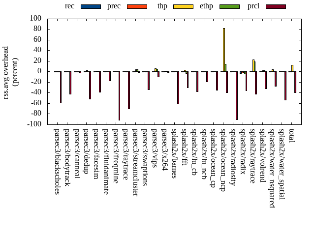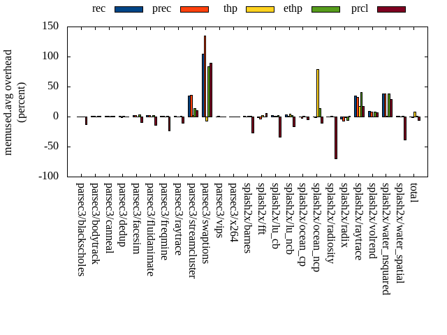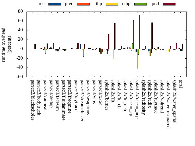 ======= Summary ======= runtime orig rec (overhead) prec (overhead) thp (overhead) ethp (overhead) prcl (overhead) parsec3/blackscholes 138.208 139.078 (0.63) 138.962 (0.55) 139.357 (0.83) 139.132 (0.67) 152.354 (10.24) parsec3/bodytrack 123.803 124.525 (0.58) 123.751 (-0.04) 123.908 (0.08) 123.528 (-0.22) 126.714 (2.35) parsec3/canneal 210.538 205.626 (-2.33) 217.886 (3.49) 190.580 (-9.48) 206.514 (-1.91) 234.559 (11.41) parsec3/dedup 17.959 18.370 (2.29) 18.503 (3.03) 18.183 (1.25) 18.058 (0.55) 20.268 (12.86) parsec3/facesim 349.911 339.685 (-2.92) 350.295 (0.11) 332.965 (-4.84) 340.523 (-2.68) 361.546 (3.33) parsec3/fluidanimate 338.126 337.623 (-0.15) 336.554 (-0.47) 332.614 (-1.63) 326.699 (-3.38) 334.859 (-0.97) parsec3/freqmine 436.102 435.539 (-0.13) 439.250 (0.72) 436.600 (0.11) 437.302 (0.28) 445.161 (2.08) parsec3/raytrace 182.141 182.190 (0.03) 183.468 (0.73) 183.476 (0.73) 185.025 (1.58) 205.497 (12.82) parsec3/streamcluster 646.643 712.713 (10.22) 648.129 (0.23) 635.973 (-1.65) 543.135 (-16.01) 712.380 (10.17) parsec3/swaptions 219.022 219.598 (0.26) 219.895 (0.40) 221.296 (1.04) 221.085 (0.94) 221.645 (1.20) parsec3/vips 88.331 87.952 (-0.43) 87.964 (-0.42) 88.928 (0.68) 87.761 (-0.65) 89.482 (1.30) parsec3/x264 118.899 112.892 (-5.05) 120.804 (1.60) 108.313 (-8.90) 108.274 (-8.94) 111.550 (-6.18) splash2x/barnes 131.914 132.544 (0.48) 129.800 (-1.60) 119.006 (-9.78) 127.286 (-3.51) 174.193 (32.05) splash2x/fft 58.555 58.440 (-0.20) 58.585 (0.05) 46.276 (-20.97) 57.530 (-1.75) 90.741 (54.97) splash2x/lu_cb 133.300 134.141 (0.63) 132.406 (-0.67) 132.350 (-0.71) 132.668 (-0.47) 142.068 (6.58) splash2x/lu_ncb 149.119 152.106 (2.00) 150.765 (1.10) 151.501 (1.60) 148.956 (-0.11) 153.701 (3.07) splash2x/ocean_cp 75.054 78.269 (4.28) 76.888 (2.44) 73.014 (-2.72) 84.143 (12.11) 121.053 (61.29) splash2x/ocean_ncp 160.563 150.627 (-6.19) 152.911 (-4.77) 95.034 (-40.81) 141.612 (-11.80) 277.269 (72.69) splash2x/radiosity 143.127 142.501 (-0.44) 142.117 (-0.71) 142.312 (-0.57) 143.355 (0.16) 152.270 (6.39) splash2x/radix 52.191 49.788 (-4.60) 50.223 (-3.77) 44.351 (-15.02) 48.513 (-7.05) 81.601 (56.35) splash2x/raytrace 133.755 135.314 (1.17) 132.448 (-0.98) 132.043 (-1.28) 133.600 (-0.12) 138.558 (3.59) splash2x/volrend 120.503 119.950 (-0.46) 121.021 (0.43) 119.837 (-0.55) 119.831 (-0.56) 120.592 (0.07) splash2x/water_nsquared 376.371 375.451 (-0.24) 375.487 (-0.23) 354.005 (-5.94) 354.730 (-5.75) 397.614 (5.64) splash2x/water_spatial 133.994 133.460 (-0.40) 132.586 (-1.05) 132.831 (-0.87) 134.327 (0.25) 150.644 (12.43) total 4538.100 4578.380 (0.89) 4540.720 (0.06) 4354.760 (-4.04) 4363.570 (-3.85) 5016.310 (10.54) memused.avg orig rec (overhead) prec (overhead) thp (overhead) ethp (overhead) prcl (overhead) parsec3/blackscholes 1826309.600 1833818.200 (0.41) 1828786.000 (0.14) 1820143.600 (-0.34) 1830923.600 (0.25) 1598872.000 (-12.45) parsec3/bodytrack 1424217.000 1436974.600 (0.90) 1436398.000 (0.86) 1421633.800 (-0.18) 1434718.200 (0.74) 1434411.200 (0.72) parsec3/canneal 1040253.400 1052139.800 (1.14) 1052512.400 (1.18) 1035381.800 (-0.47) 1049653.400 (0.90) 1049317.800 (0.87) parsec3/dedup 2501867.800 2526307.800 (0.98) 2466466.000 (-1.42) 2526893.000 (1.00) 2509818.000 (0.32) 2497495.600 (-0.17) parsec3/facesim 535597.000 549611.600 (2.62) 548756.200 (2.46) 537688.400 (0.39) 553604.200 (3.36) 484130.600 (-9.61) parsec3/fluidanimate 567666.200 579418.800 (2.07) 579690.400 (2.12) 567742.400 (0.01) 580155.600 (2.20) 491283.200 (-13.46) parsec3/freqmine 987479.800 997061.400 (0.97) 994319.400 (0.69) 988948.400 (0.15) 998694.000 (1.14) 755928.400 (-23.45) parsec3/raytrace 1738269.000 1753006.000 (0.85) 1744824.200 (0.38) 1730549.200 (-0.44) 1750131.800 (0.68) 1548381.400 (-10.92) parsec3/streamcluster 117605.200 158332.400 (34.63) 159858.800 (35.93) 120675.600 (2.61) 134289.800 (14.19) 129397.000 (10.03) parsec3/swaptions 13600.000 27782.000 (104.28) 31959.600 (135.00) 12666.000 (-6.87) 25009.600 (83.89) 25763.000 (89.43) parsec3/vips 2985688.800 2999933.000 (0.48) 3007744.400 (0.74) 2986884.000 (0.04) 3002386.000 (0.56) 2978898.800 (-0.23) parsec3/x264 3245603.400 3247109.400 (0.05) 3263116.600 (0.54) 3232282.600 (-0.41) 3247899.800 (0.07) 3246118.400 (0.02) splash2x/barnes 1201901.800 1214834.400 (1.08) 1202295.800 (0.03) 1209412.600 (0.62) 1214202.400 (1.02) 884999.000 (-26.37) splash2x/fft 9664686.600 9600248.400 (-0.67) 9349118.800 (-3.27) 9933514.600 (2.78) 9631206.600 (-0.35) 10280275.800 (6.37) splash2x/lu_cb 510420.400 523148.200 (2.49) 514914.600 (0.88) 513755.400 (0.65) 520163.400 (1.91) 336801.200 (-34.01) splash2x/lu_ncb 511532.200 529326.600 (3.48) 519711.000 (1.60) 537526.600 (5.08) 523745.800 (2.39) 429269.200 (-16.08) splash2x/ocean_cp 3319439.200 3302381.000 (-0.51) 3238411.400 (-2.44) 3361820.800 (1.28) 3327733.200 (0.25) 3153352.000 (-5.00) splash2x/ocean_ncp 3909858.200 3903840.600 (-0.15) 3860902.600 (-1.25) 7022147.400 (79.60) 4470036.000 (14.33) 3521609.000 (-9.93) splash2x/radiosity 1460921.000 1465081.000 (0.28) 1456779.800 (-0.28) 1470047.000 (0.62) 1467061.600 (0.42) 446035.400 (-69.47) splash2x/radix 2427095.200 2336602.600 (-3.73) 2250746.200 (-7.27) 2399454.800 (-1.14) 2292519.600 (-5.54) 2458012.200 (1.27) splash2x/raytrace 42109.600 56762.400 (34.80) 55746.200 (32.38) 49447.000 (17.42) 59412.200 (41.09) 49360.600 (17.22) splash2x/volrend 149513.000 162802.400 (8.89) 162495.800 (8.68) 148992.000 (-0.35) 161995.600 (8.35) 159614.800 (6.76) splash2x/water_nsquared 39106.600 54252.000 (38.73) 54117.000 (38.38) 39747.600 (1.64) 54016.000 (38.12) 50599.800 (29.39) splash2x/water_spatial 667480.200 678556.600 (1.66) 674177.400 (1.00) 669400.400 (0.29) 678370.800 (1.63) 413530.600 (-38.05) total 40888200.000 40989200.000 (0.25) 40453800.000 (-1.06) 44336700.000 (8.43) 41517700.000 (1.54) 38423500.000 (-6.03) rss.avg orig rec (overhead) prec (overhead) thp (overhead) ethp (overhead) prcl (overhead) parsec3/blackscholes 588097.000 586885.200 (-0.21) 586744
