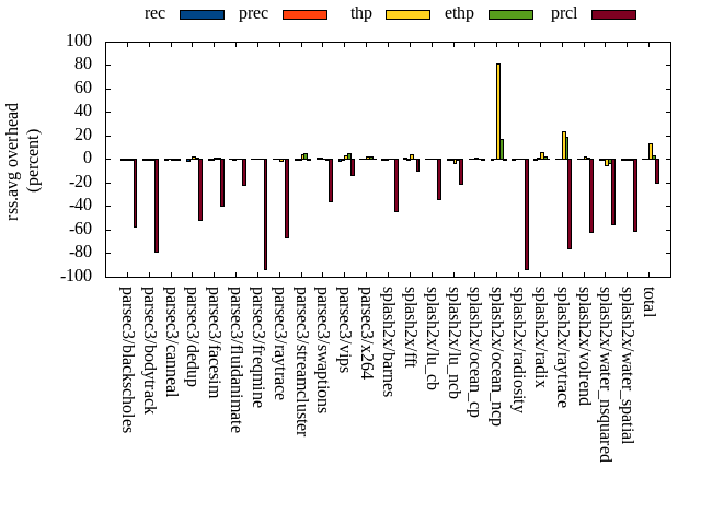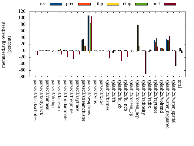 ======= Summary ======= runtime orig rec (overhead) prec (overhead) thp (overhead) ethp (overhead) prcl (overhead) parsec3/blackscholes 139.658 140.168 (0.37) 139.385 (-0.20) 138.367 (-0.92) 139.279 (-0.27) 147.024 (5.27) parsec3/bodytrack 123.788 124.622 (0.67) 123.636 (-0.12) 125.115 (1.07) 123.840 (0.04) 141.928 (14.65) parsec3/canneal 207.491 210.318 (1.36) 217.927 (5.03) 174.287 (-16.00) 202.609 (-2.35) 225.483 (8.67) parsec3/dedup 18.292 18.301 (0.05) 18.378 (0.47) 18.264 (-0.15) 18.298 (0.03) 20.541 (12.30) parsec3/facesim 343.893 340.286 (-1.05) 338.217 (-1.65) 332.953 (-3.18) 333.840 (-2.92) 365.650 (6.33) parsec3/fluidanimate 339.959 326.886 (-3.85) 330.286 (-2.85) 331.239 (-2.57) 326.011 (-4.10) 341.684 (0.51) parsec3/freqmine 445.987 436.332 (-2.16) 435.946 (-2.25) 435.704 (-2.31) 437.595 (-1.88) 451.414 (1.22) parsec3/raytrace 184.106 182.158 (-1.06) 182.056 (-1.11) 183.180 (-0.50) 183.545 (-0.30) 202.197 (9.83) parsec3/streamcluster 599.990 674.091 (12.35) 617.314 (2.89) 521.864 (-13.02) 551.971 (-8.00) 696.127 (16.02) parsec3/swaptions 220.462 222.637 (0.99) 220.449 (-0.01) 219.921 (-0.25) 221.607 (0.52) 223.956 (1.59) parsec3/vips 87.767 88.700 (1.06) 87.461 (-0.35) 87.466 (-0.34) 87.875 (0.12) 91.768 (4.56) parsec3/x264 110.843 117.856 (6.33) 113.023 (1.97) 108.665 (-1.97) 115.434 (4.14) 117.811 (6.29) splash2x/barnes 131.441 129.275 (-1.65) 128.341 (-2.36) 119.317 (-9.22) 126.199 (-3.99) 147.602 (12.30) splash2x/fft 59.705 58.382 (-2.22) 58.858 (-1.42) 45.949 (-23.04) 59.939 (0.39) 64.548 (8.11) splash2x/lu_cb 132.552 131.604 (-0.72) 131.846 (-0.53) 132.320 (-0.18) 132.100 (-0.34) 140.289 (5.84) splash2x/lu_ncb 150.215 149.670 (-0.36) 149.646 (-0.38) 148.823 (-0.93) 149.416 (-0.53) 152.338 (1.41) splash2x/ocean_cp 84.033 76.405 (-9.08) 75.104 (-10.63) 73.487 (-12.55) 77.789 (-7.43) 77.380 (-7.92) splash2x/ocean_ncp 153.833 154.247 (0.27) 156.227 (1.56) 106.619 (-30.69) 139.299 (-9.45) 165.030 (7.28) splash2x/radiosity 143.566 143.654 (0.06) 142.426 (-0.79) 141.193 (-1.65) 141.740 (-1.27) 157.817 (9.93) splash2x/radix 49.984 49.996 (0.02) 50.519 (1.07) 46.573 (-6.82) 50.724 (1.48) 50.695 (1.42) splash2x/raytrace 133.238 134.337 (0.83) 134.389 (0.86) 134.833 (1.20) 131.073 (-1.62) 145.541 (9.23) splash2x/volrend 121.700 120.652 (-0.86) 120.560 (-0.94) 120.629 (-0.88) 119.581 (-1.74) 129.422 (6.35) splash2x/water_nsquared 370.771 375.236 (1.20) 376.829 (1.63) 355.592 (-4.09) 354.087 (-4.50) 419.606 (13.17) splash2x/water_spatial 133.295 132.931 (-0.27) 132.762 (-0.40) 133.090 (-0.15) 133.809 (0.39) 153.647 (15.27) total 4486.580 4538.750 (1.16) 4481.600 (-0.11) 4235.430 (-5.60) 4357.660 (-2.87) 4829.510 (7.64) memused.avg orig rec (overhead) prec (overhead) thp (overhead) ethp (overhead) prcl (overhead) parsec3/blackscholes 1828693.600 1834084.000 (0.29) 1823839.800 (-0.27) 1819296.600 (-0.51) 1830281.800 (0.09) 1603975.800 (-12.29) parsec3/bodytrack 1424963.400 1440085.800 (1.06) 1438384.200 (0.94) 1421718.400 (-0.23) 1432834.600 (0.55) 1439283.000 (1.00) parsec3/canneal 1036782.600 1052828.800 (1.55) 1050148.600 (1.29) 1035104.400 (-0.16) 1051145.400 (1.39) 1050019.400 (1.28) parsec3/dedup 2511841.400 2507374.000 (-0.18) 2472450.600 (-1.57) 2523557.600 (0.47) 2508912.000 (-0.12) 2493347.200 (-0.74) parsec3/facesim 537769.800 550740.800 (2.41) 548683.600 (2.03) 543547.800 (1.07) 560556.600 (4.24) 482782.600 (-10.23) parsec3/fluidanimate 570268.600 585598.000 (2.69) 579837.800 (1.68) 571433.000 (0.20) 582112.800 (2.08) 470073.400 (-17.57) parsec3/freqmine 982941.400 996253.200 (1.35) 993919.800 (1.12) 990531.800 (0.77) 1000994.400 (1.84) 750685.800 (-23.63) parsec3/raytrace 1737446.000 1749908.800 (0.72) 1741183.800 (0.22) 1726674.800 (-0.62) 1748530.200 (0.64) 1552275.600 (-10.66) parsec3/streamcluster 115857.000 155194.400 (33.95) 158272.800 (36.61) 122125.200 (5.41) 134545.600 (16.13) 133448.600 (15.18) parsec3/swaptions 13694.200 28451.800 (107.76) 28464.600 (107.86) 12797.800 (-6.55) 25328.200 (84.96) 28138.400 (105.48) parsec3/vips 2976126.400 3002408.600 (0.88) 3008218.800 (1.08) 2978258.600 (0.07) 2995428.600 (0.65) 2936338.600 (-1.34) parsec3/x264 3233886.200 3258790.200 (0.77) 3248355.000 (0.45) 3232070.000 (-0.06) 3256360.200 (0.69) 3254707.400 (0.64) splash2x/barnes 1210470.600 1211918.600 (0.12) 1204507.000 (-0.49) 1210892.800 (0.03) 1217414.800 (0.57) 944053.400 (-22.01) splash2x/fft 9697440.000 9604535.600 (-0.96) 9210571.800 (-5.02) 9867368.000 (1.75) 9637571.800 (-0.62) 9804092.000 (1.10) splash2x/lu_cb 510680.400 521792.600 (2.18) 517724.600 (1.38) 513500.800 (0.55) 519980.600 (1.82) 351787.000 (-31.11) splash2x/lu_ncb 512896.200 529353.600 (3.21) 521248.600 (1.63) 513493.200 (0.12) 523793.400 (2.12) 418701.600 (-18.37) splash2x/ocean_cp 3320800.200 3313688.400 (-0.21) 3225585.000 (-2.87) 3359032.200 (1.15) 3316591.800 (-0.13) 3304702.200 (-0.48) splash2x/ocean_ncp 3915132.400 3917401.000 (0.06) 3884086.400 (-0.79) 7050398.600 (80.08) 4532528.600 (15.77) 3920395.800 (0.13) splash2x/radiosity 1456908.200 1467611.800 (0.73) 1453612.600 (-0.23) 1466695.400 (0.67) 1467495.600 (0.73) 421197.600 (-71.09) splash2x/radix 2345874.600 2318202.200 (-1.18) 2261499.200 (-3.60) 2438228.400 (3.94) 2373697.800 (1.19) 2336605.600 (-0.40) splash2x/raytrace 43258.800 57624.200 (33.21) 55164.600 (27.52) 46204.400 (6.81) 60475.000 (39.80) 48865.400 (12.96) splash2x/volrend 149615.000 163809.400 (9.49) 162115.400 (8.36) 149119.600 (-0.33) 162747.800 (8.78) 157734.600 (5.43) splash2x/water_nsquared 40384.400 54848.600 (35.82) 53796.600 (33.21) 41455.800 (2.65) 53226.400 (31.80) 58260.600 (44.27) splash2x/water_spatial 670580.200 680444.200 (1.47) 670020.400 (-0.08) 668262.400 (-0.35) 678552.000 (1.19) 372931.000 (-44.39) total 40844300.000 41002900.000 (0.39) 40311600.000 (-1.30) 44301900.000 (8.47) 41671052.000 (2.02) 38334431.000 (-6.14) rss.avg orig rec (overhead) prec (overhead) thp (overhead) ethp (overhead) prcl (overhead) parsec3/blackscholes 587536.800 585720.000 (-0.31